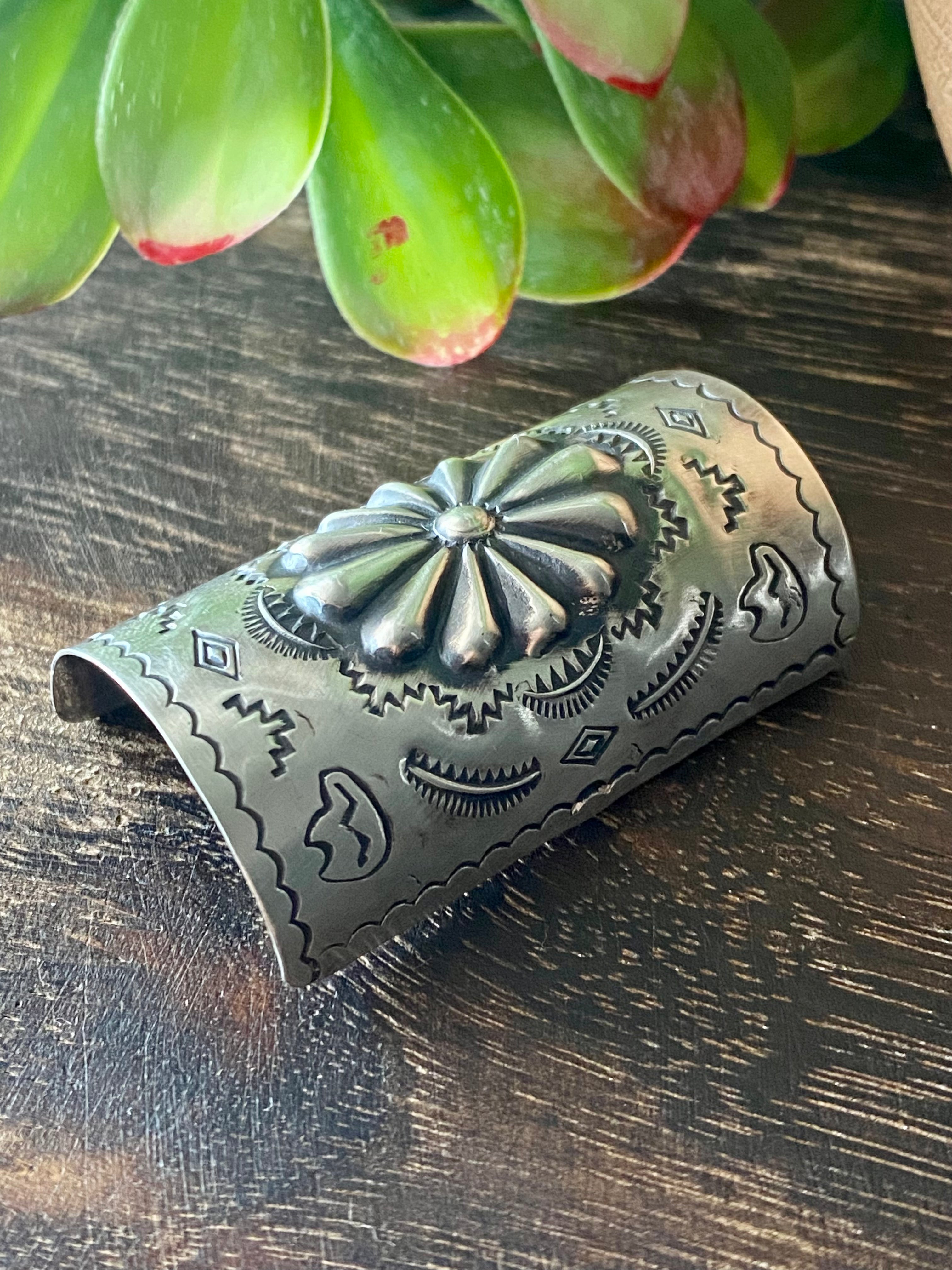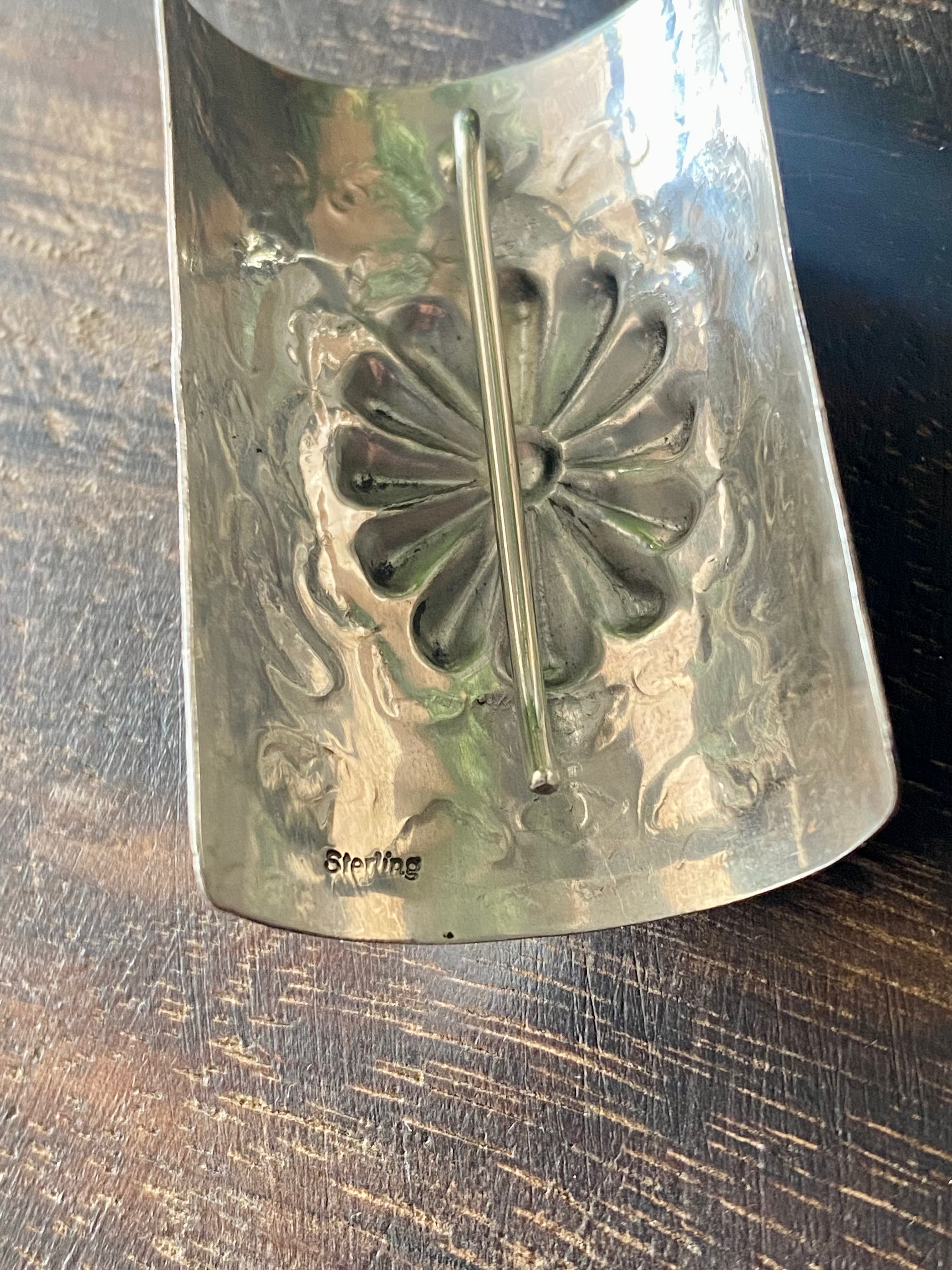 Navajo Made Sterling Silver Bear Ponytail Holders. It measures 2 inches long and just under 1 1/4 inches wide. Stamped sterling silver.
