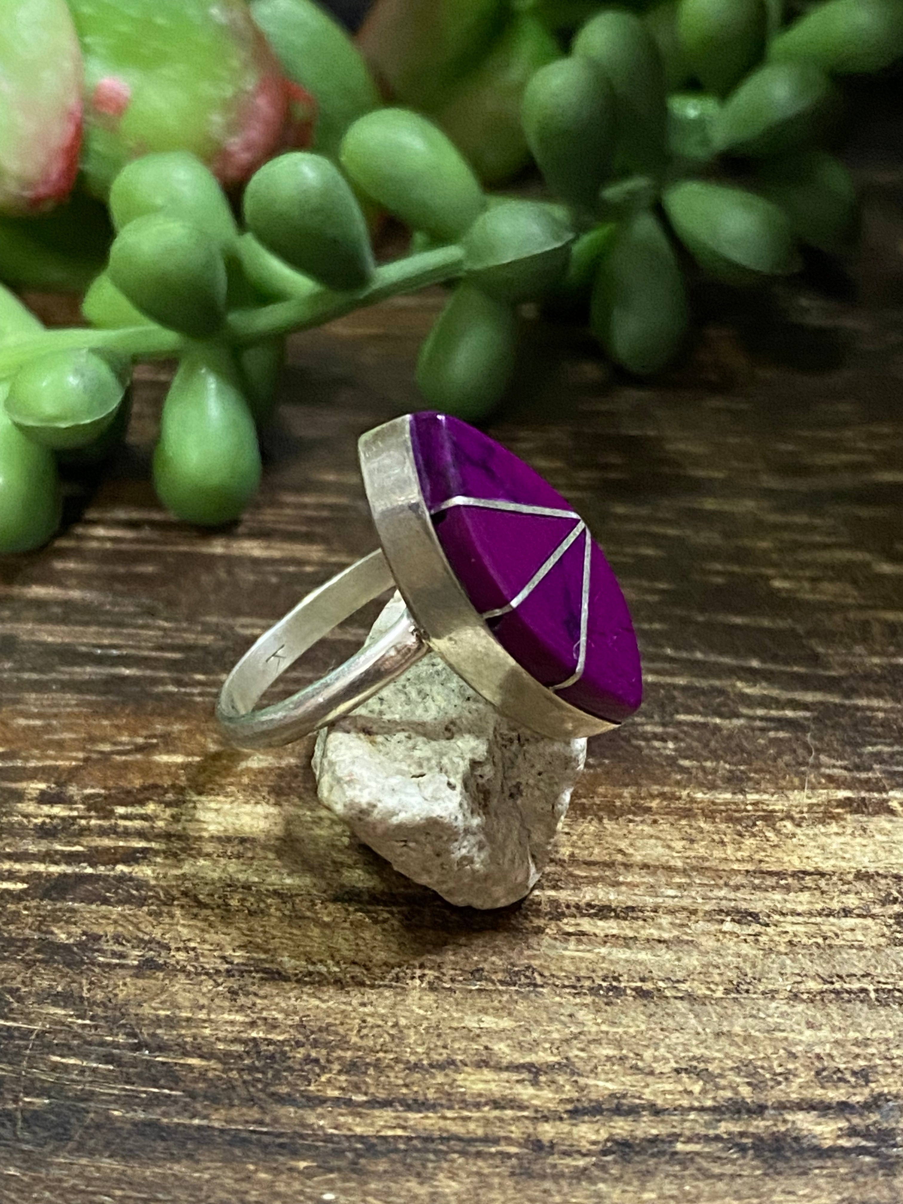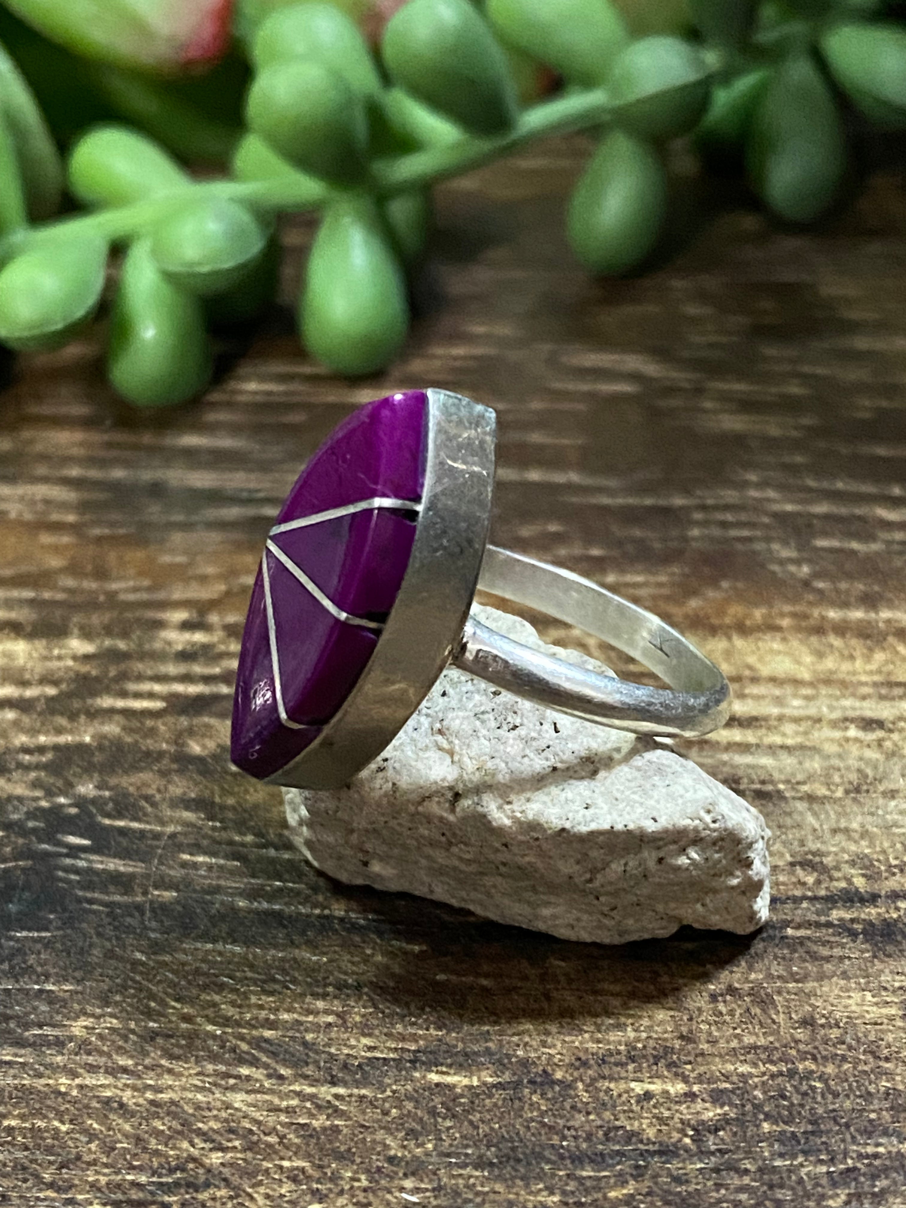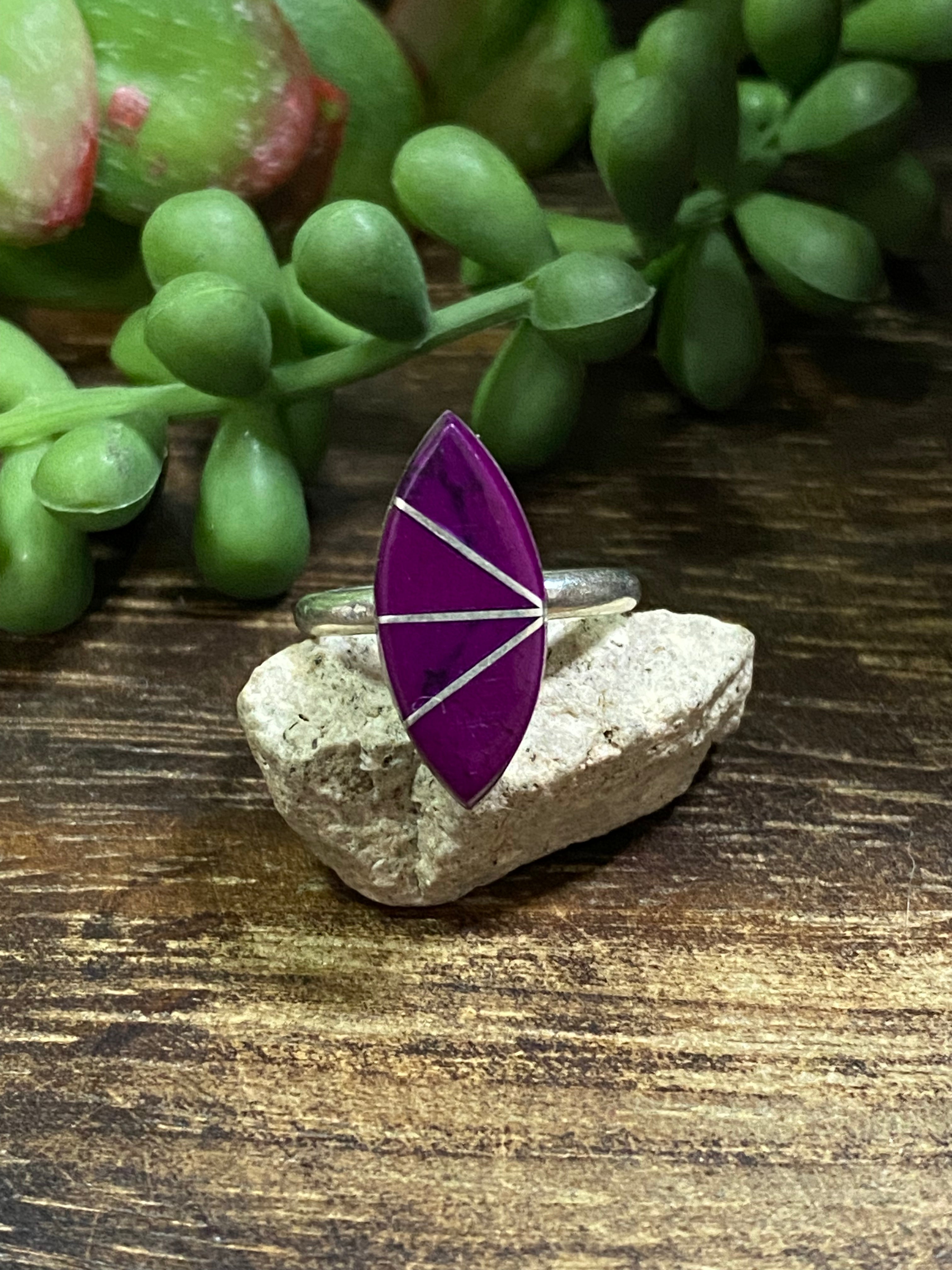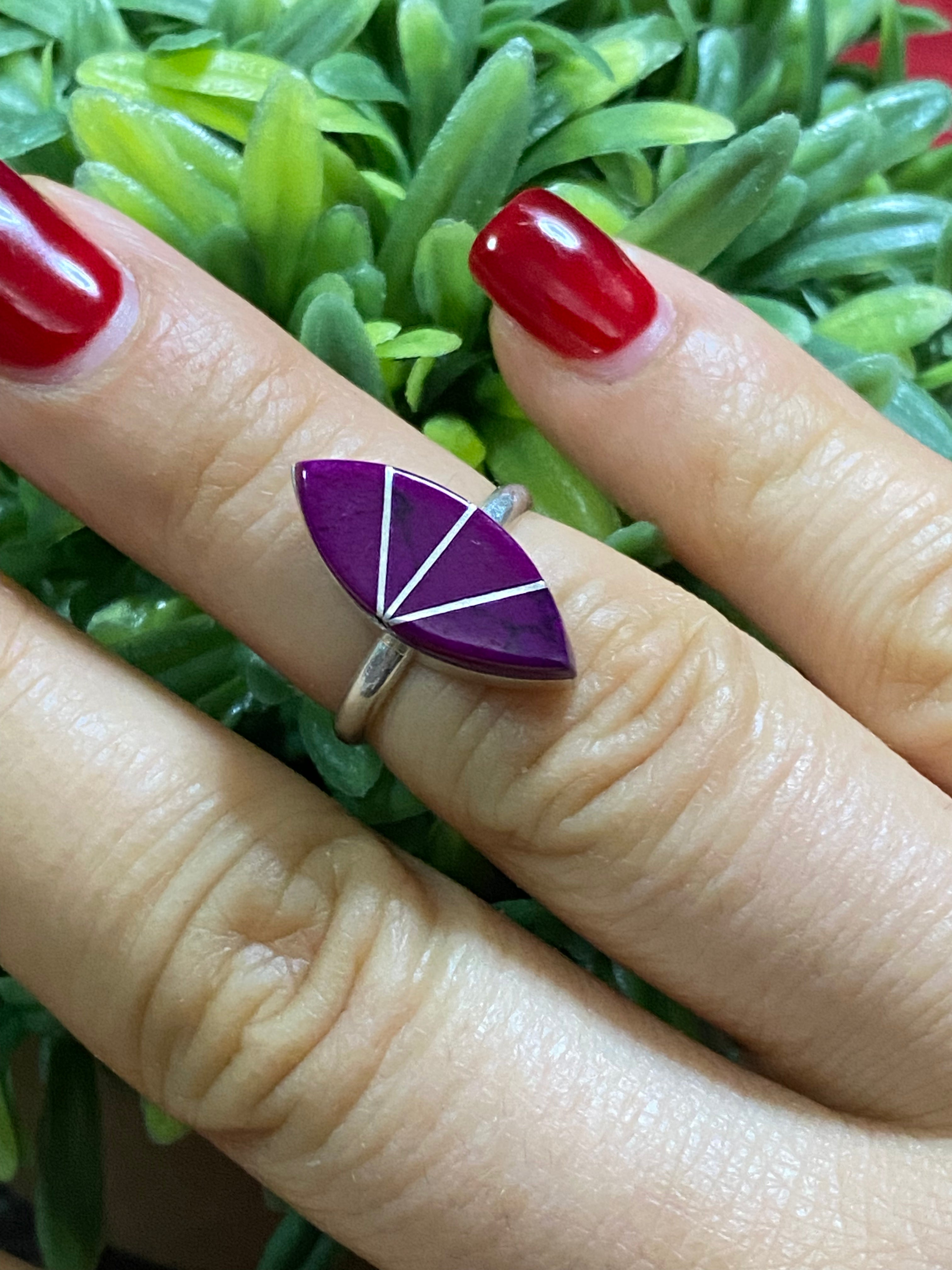 Navajo Made Suglite & Sterling Silver Inlay Ring Size 5.5. It measures 3/4 of an inch long and just over 1/4 of an inch wide. Signed by the artist.