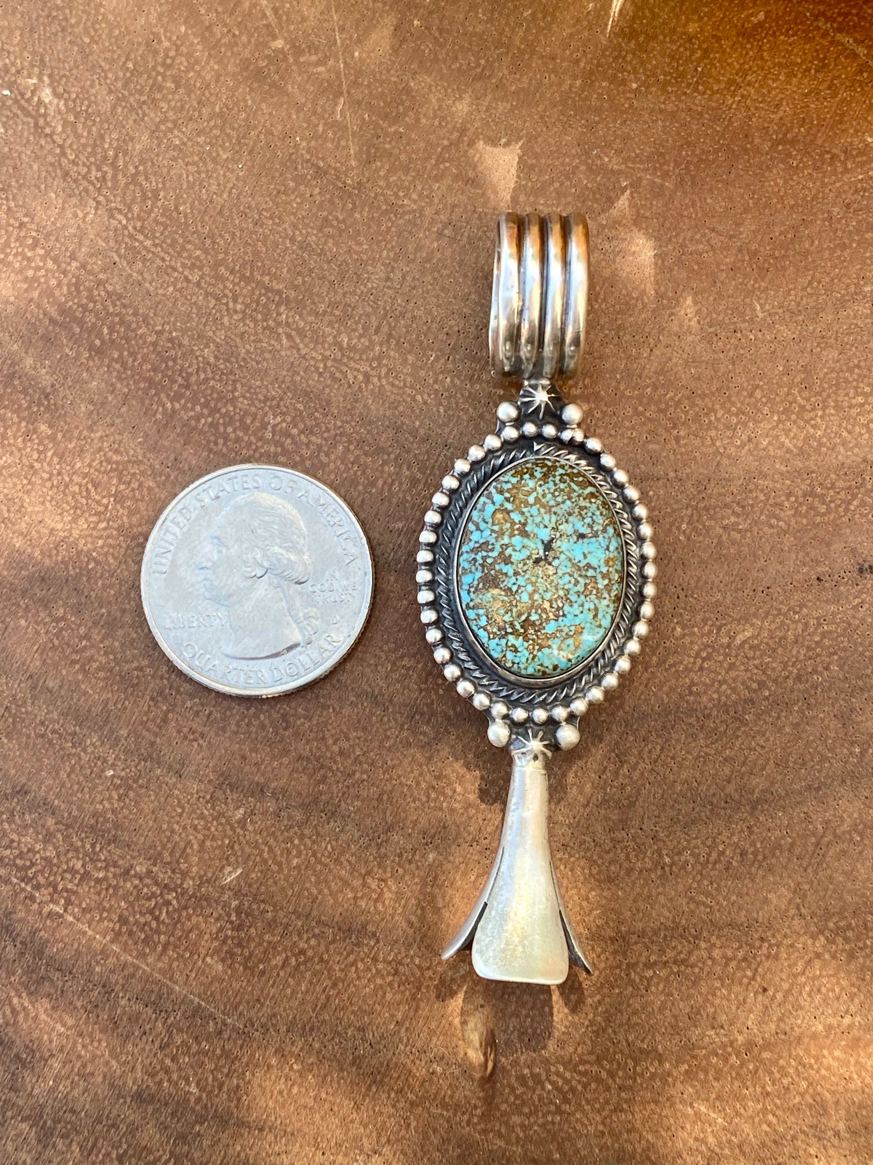 Navajo Made Turquoise Mountain Spiderweb Turquoise & Sterling Silver Blossom Pendant. It measures 2 7/8 inches long and just over 7/8 of an inch wide. Pendant Only!! Signed by the artist and stamped sterling silver.