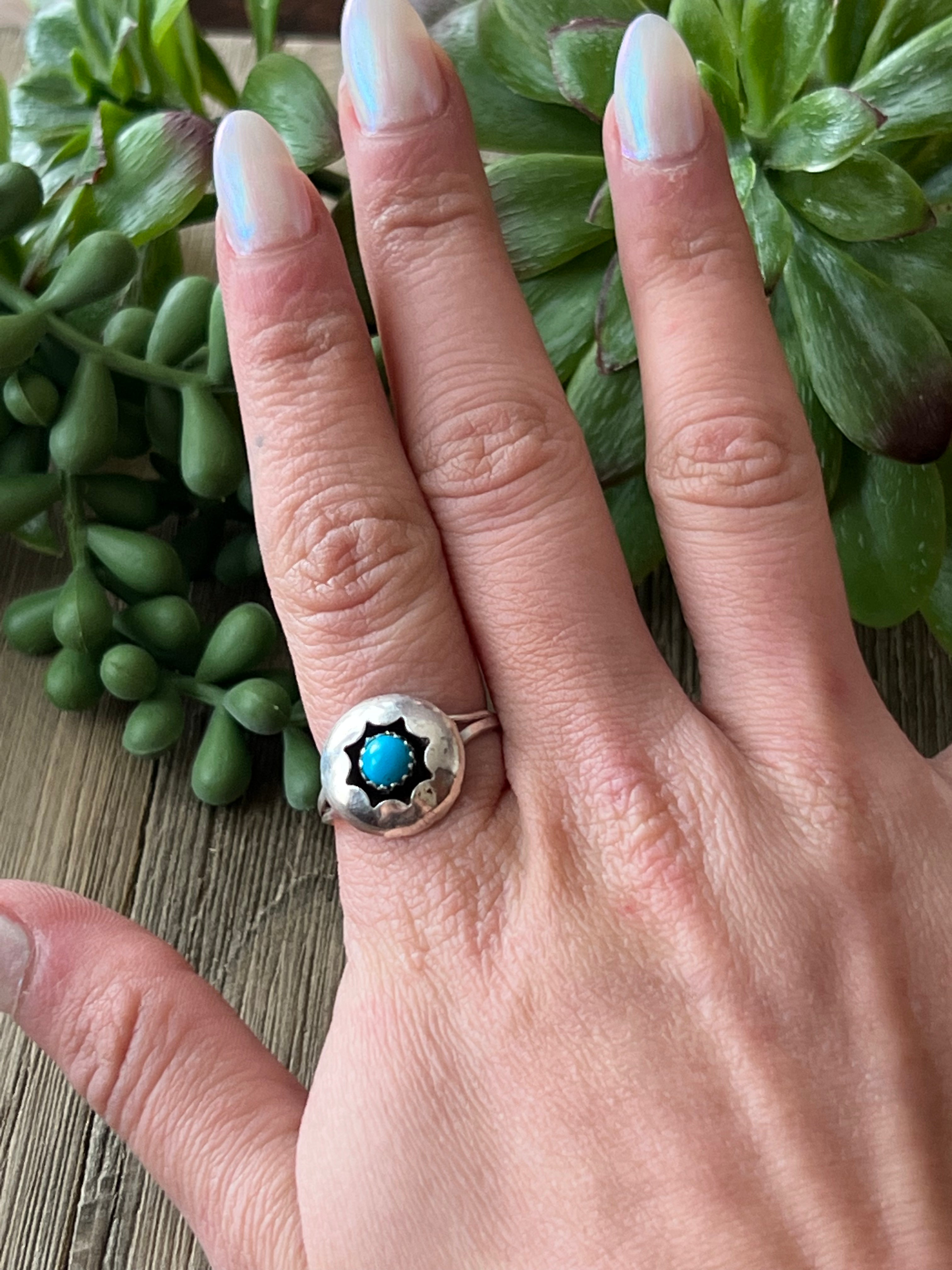 Navajo Made Turquoise & Sterling Silver Shadow Box Ring. It measures 5/8 of an inch round. Stones will differ.