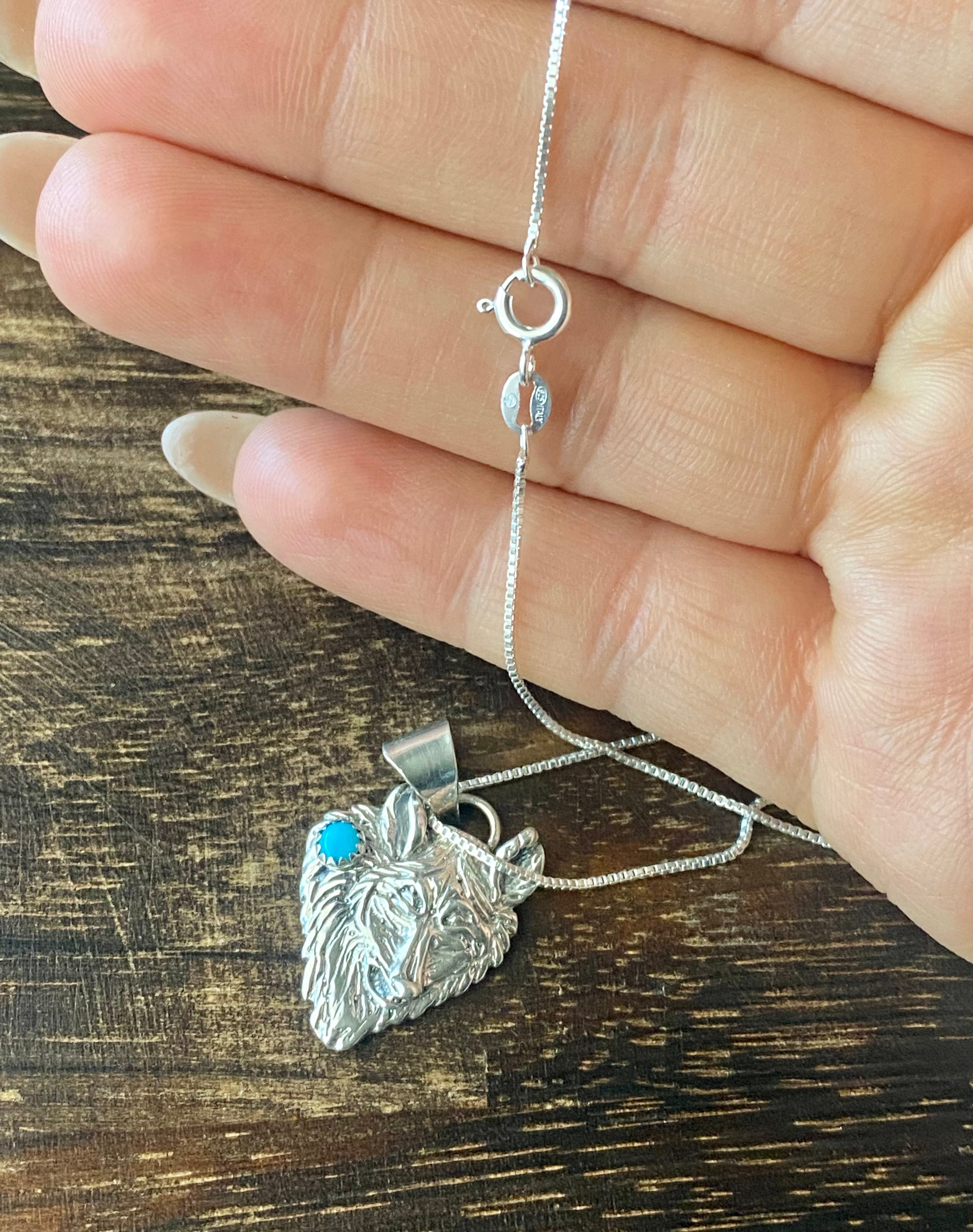 Navajo Made Turquoise & Sterling Silver Wolf Necklace. It measures just under 20 inches long with hang while the chain by itself measures 18 inches long. Stamped sterling silver.