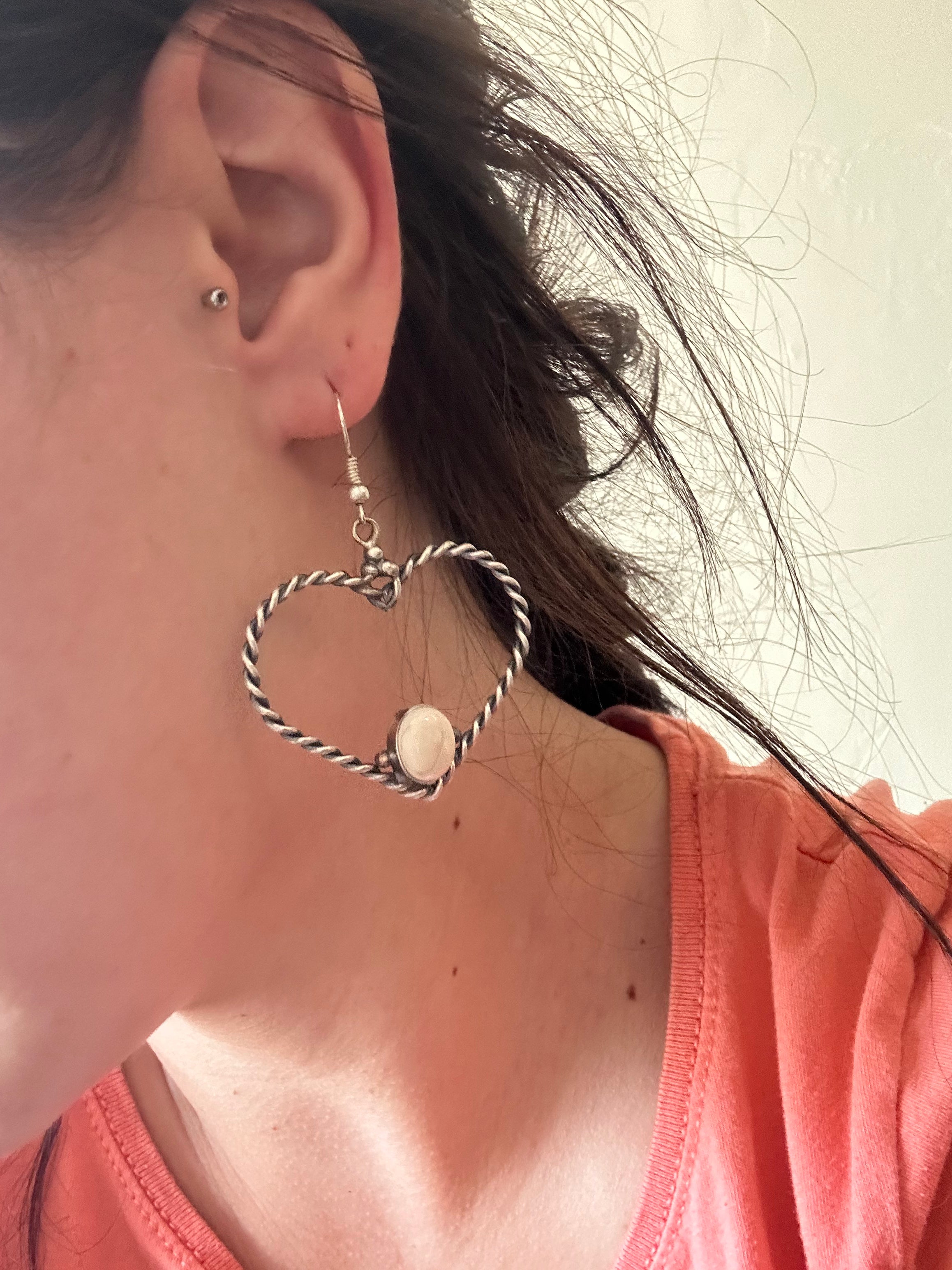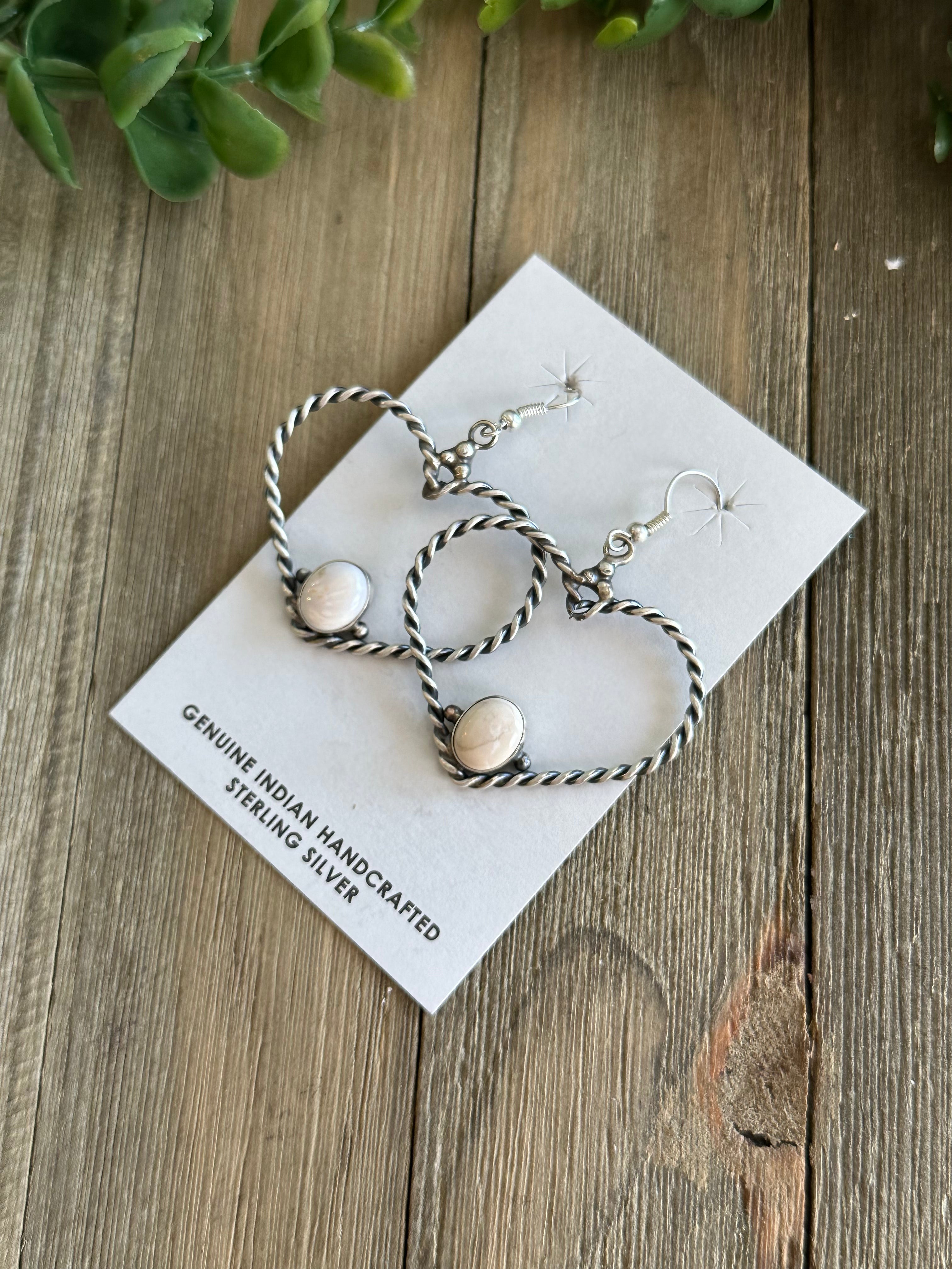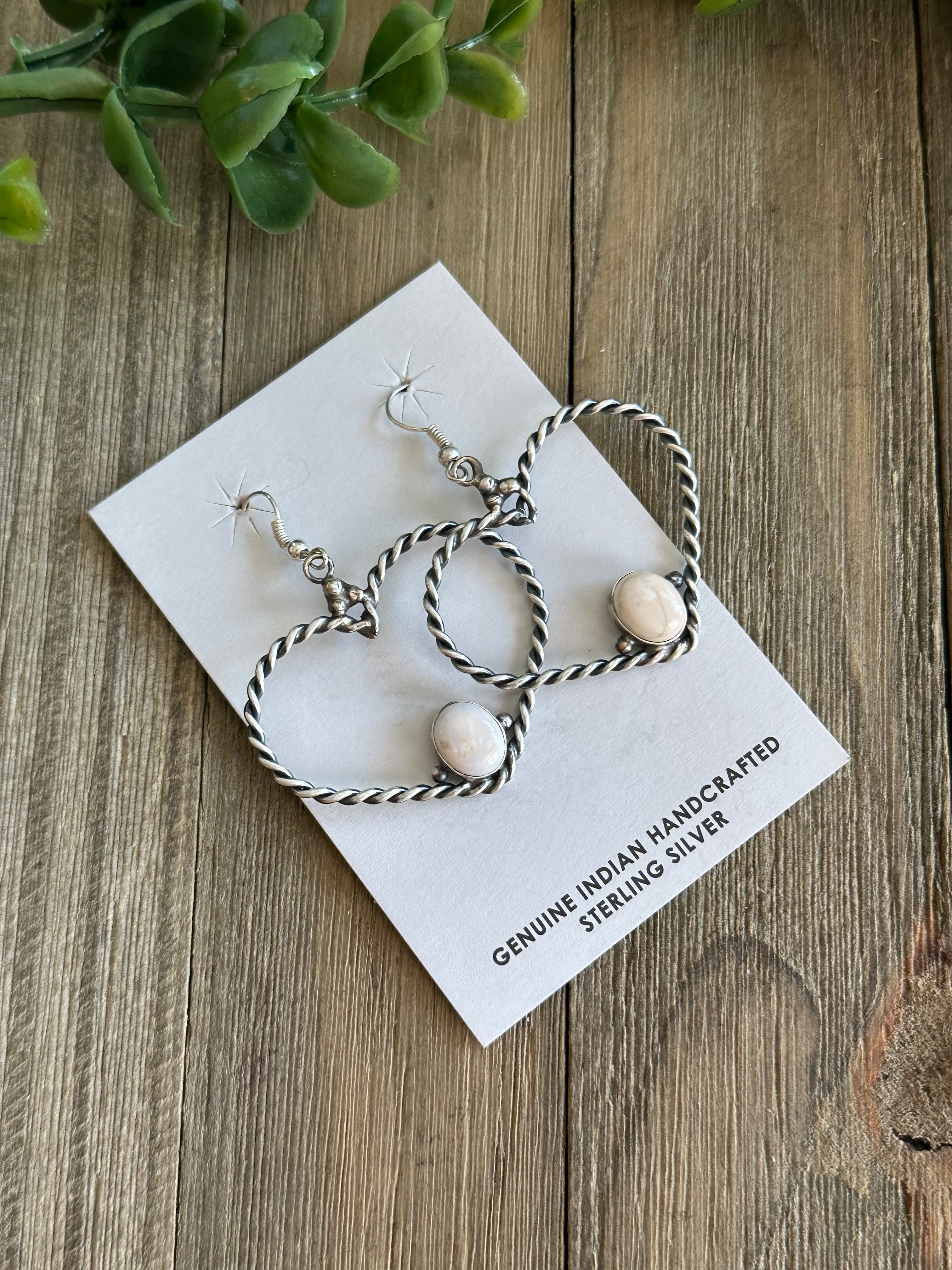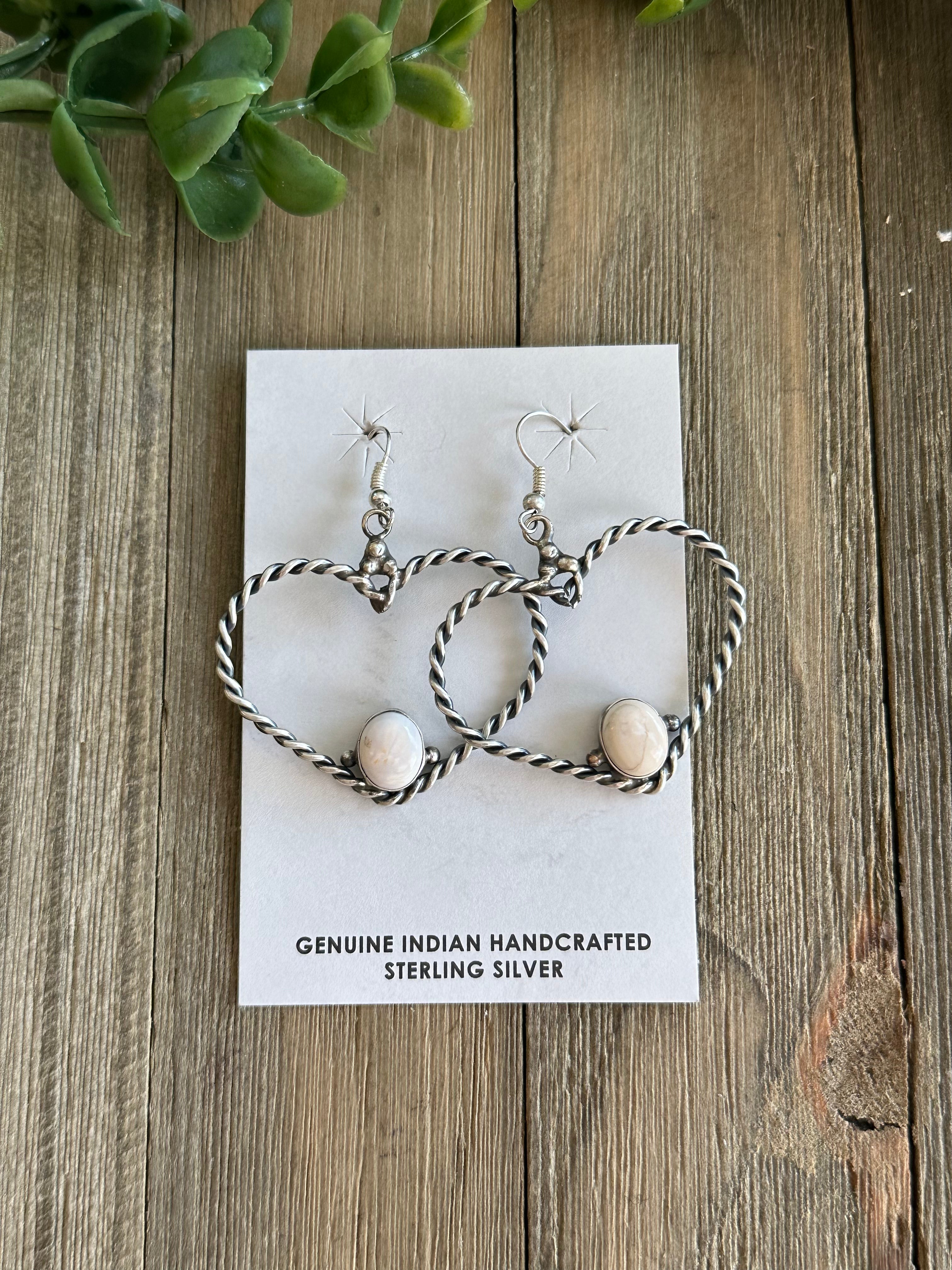 Navajo Made White Buffalo & Sterling Silver Dangle Heart Earrings