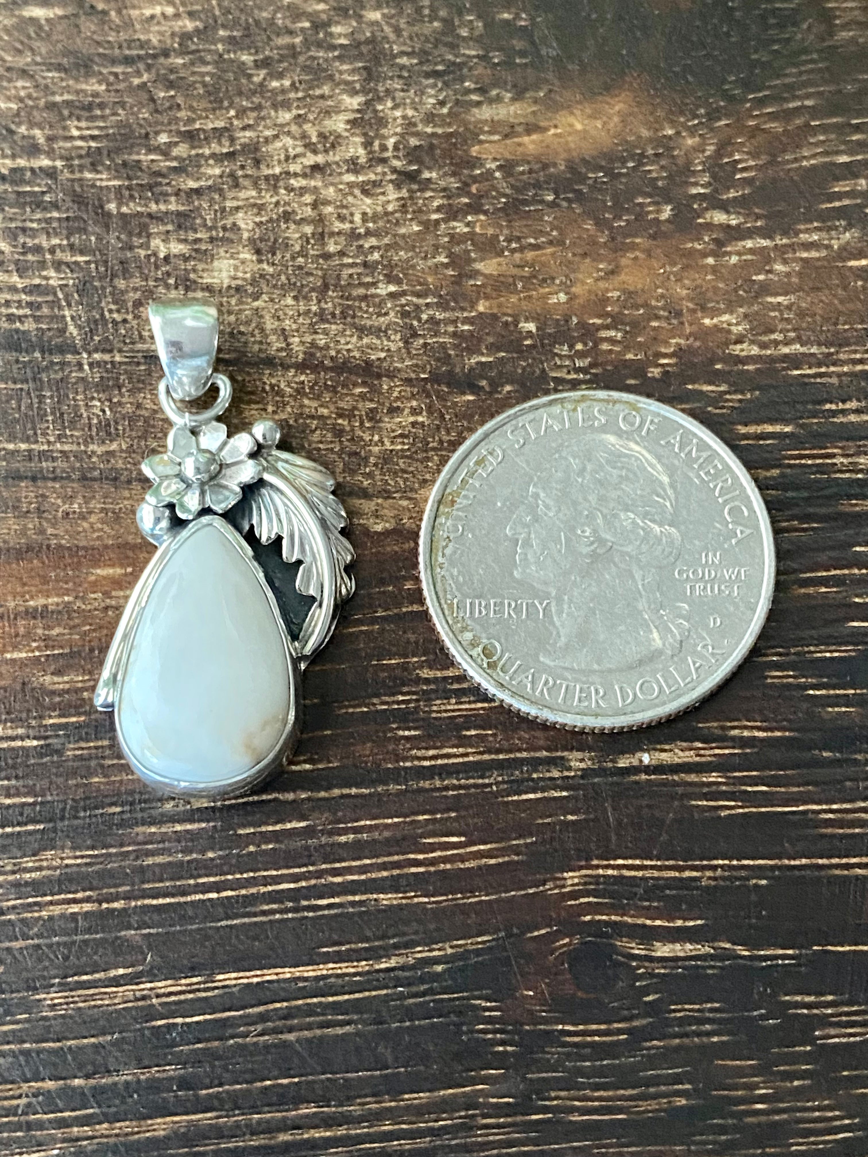 Navajo Made White Buffalo & Sterling Silver Pendant. It measures 1 3/8 inches long and just over 5/8 of an inch wide. Pendant Only!! Signed by the artist and stamped sterling silver.