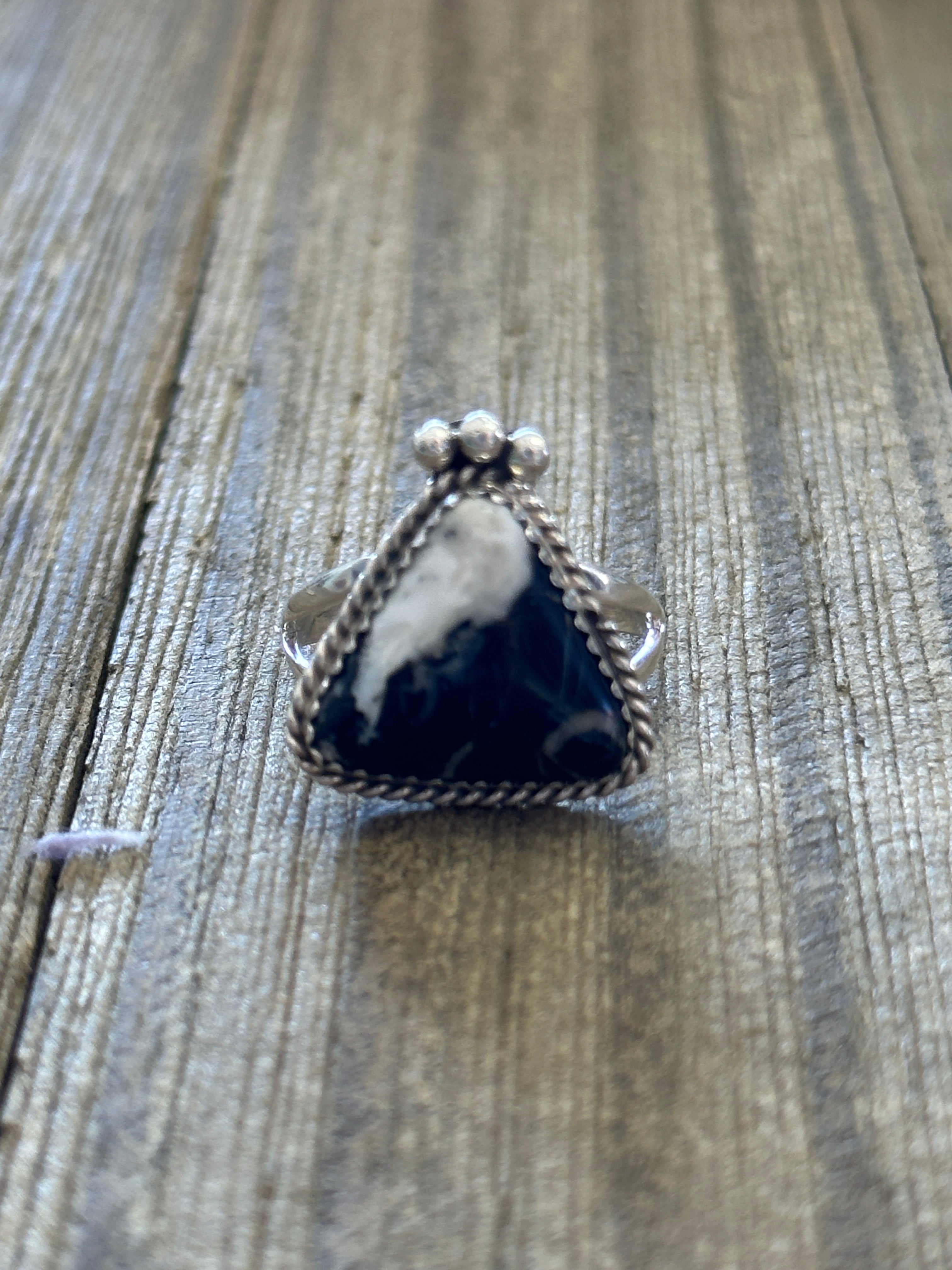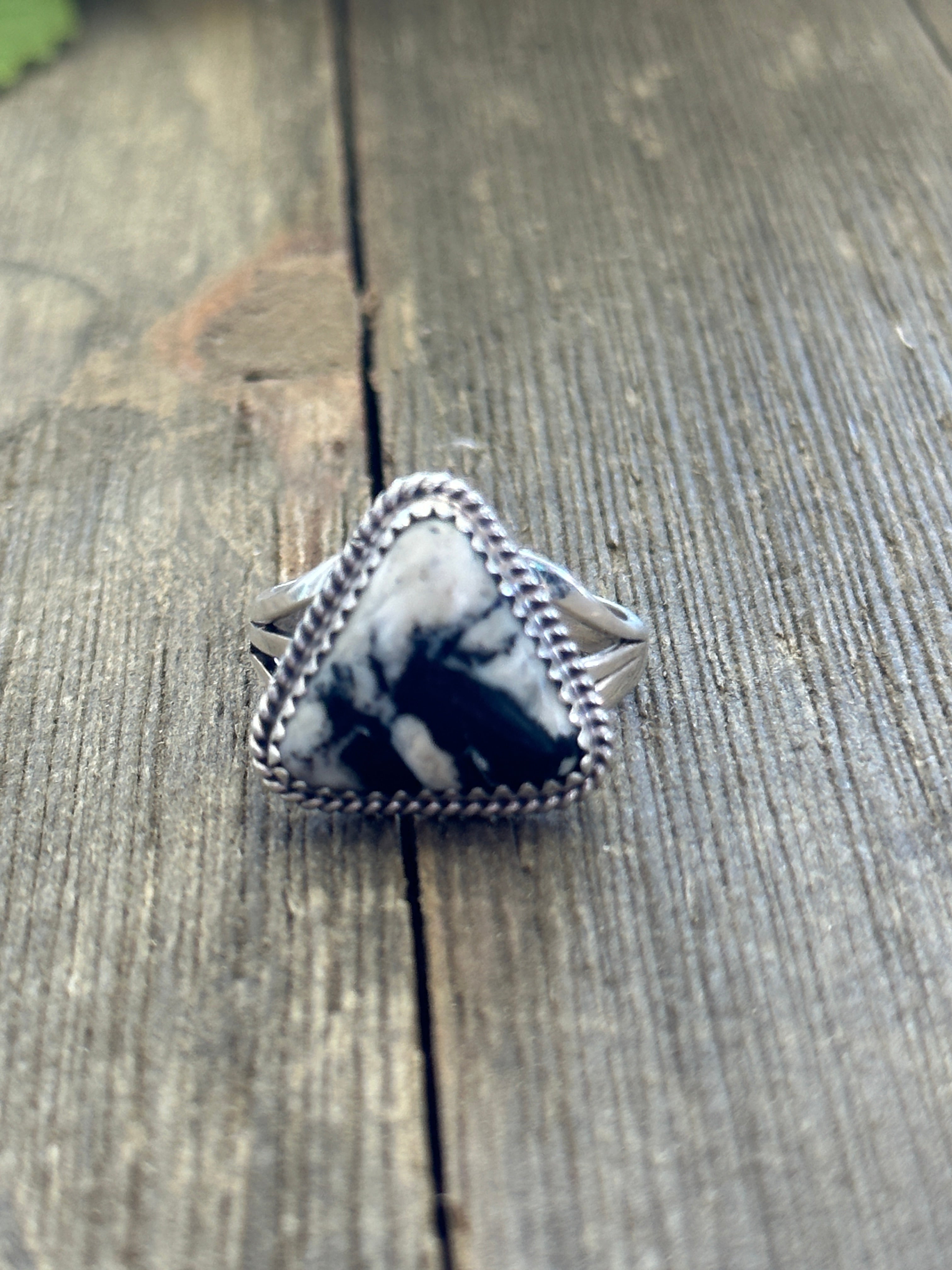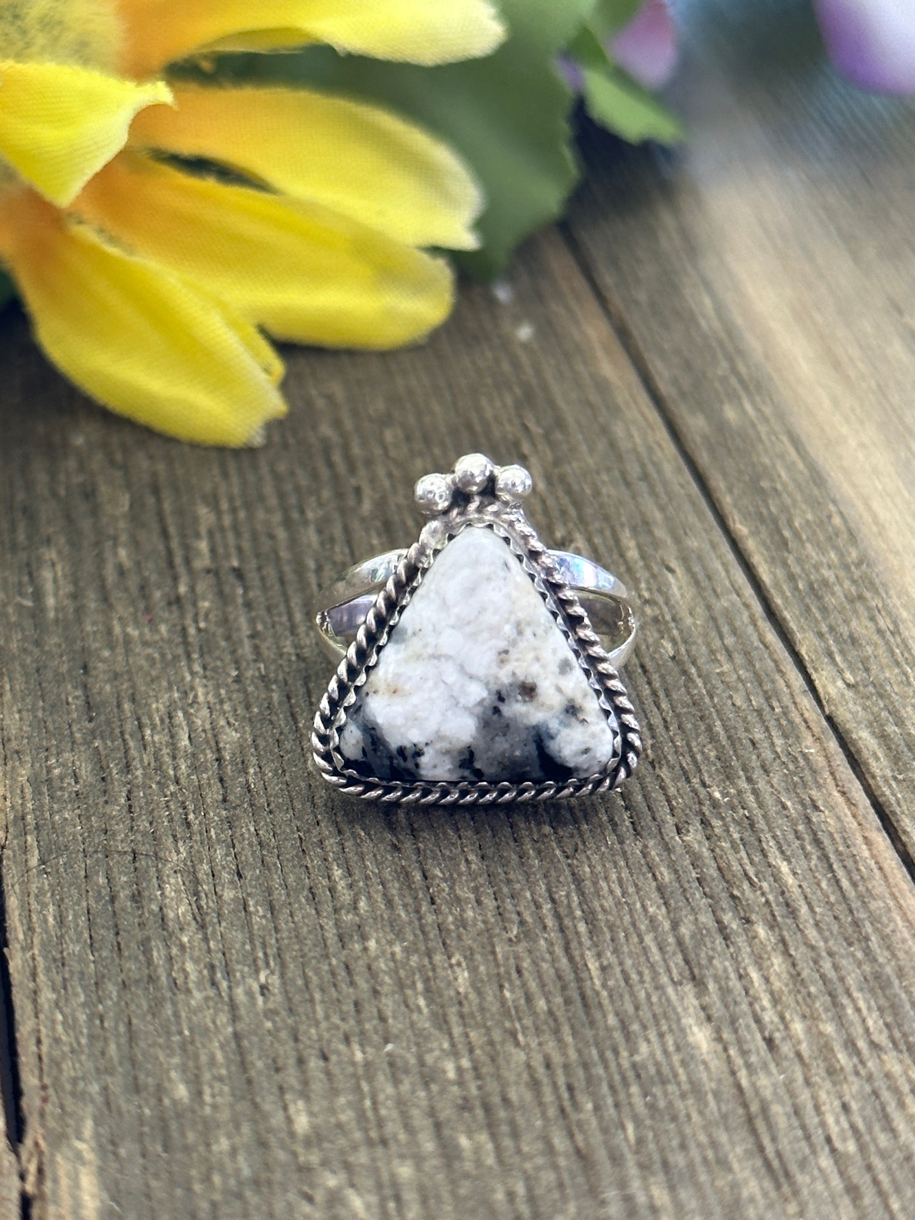 Navajo Made White Buffalo & Sterling Silver Ring. It measures 3/4 of an inch long and just under 3/4 of an inch wide. Signed by artist and stamped sterling silver.