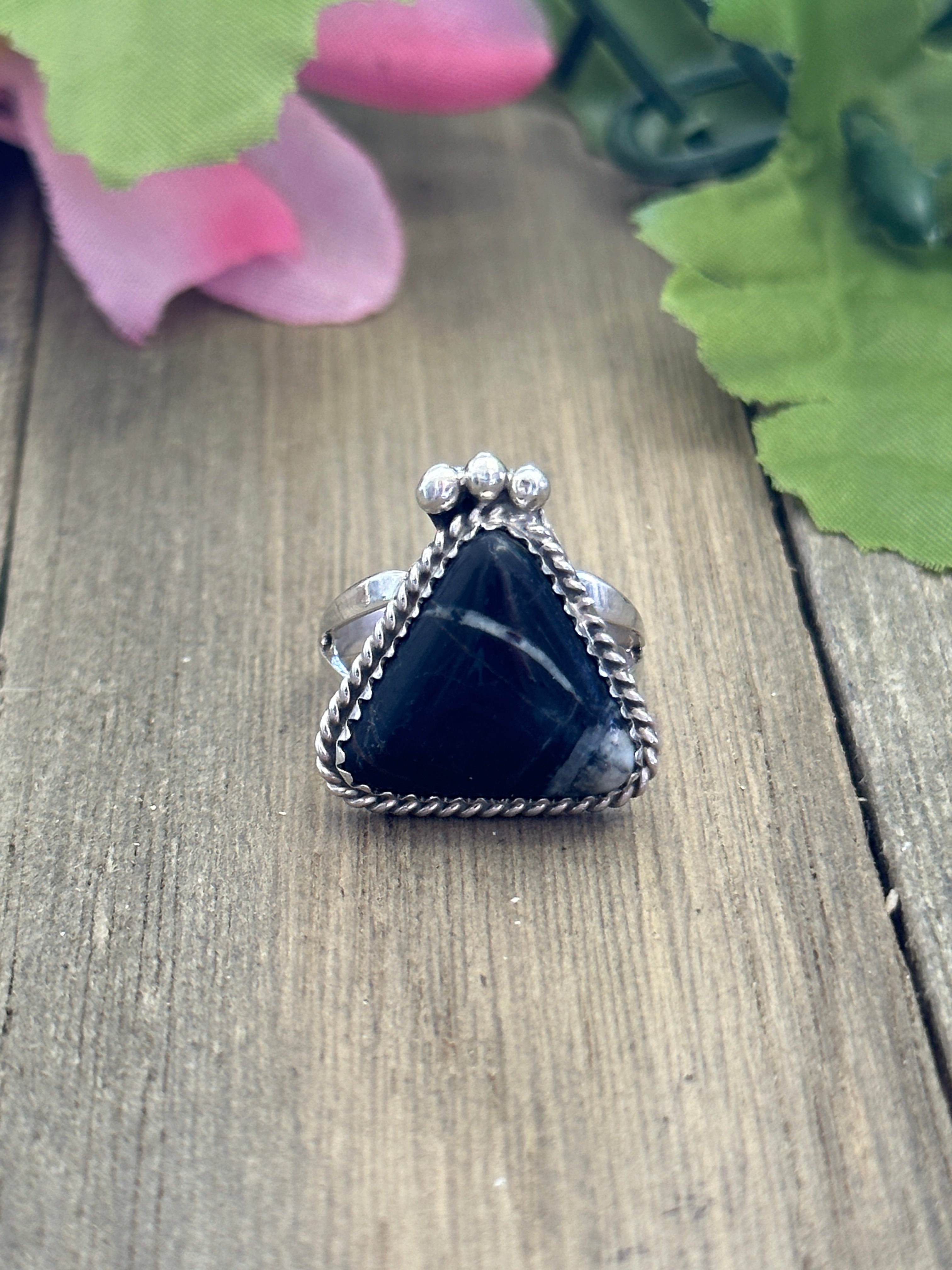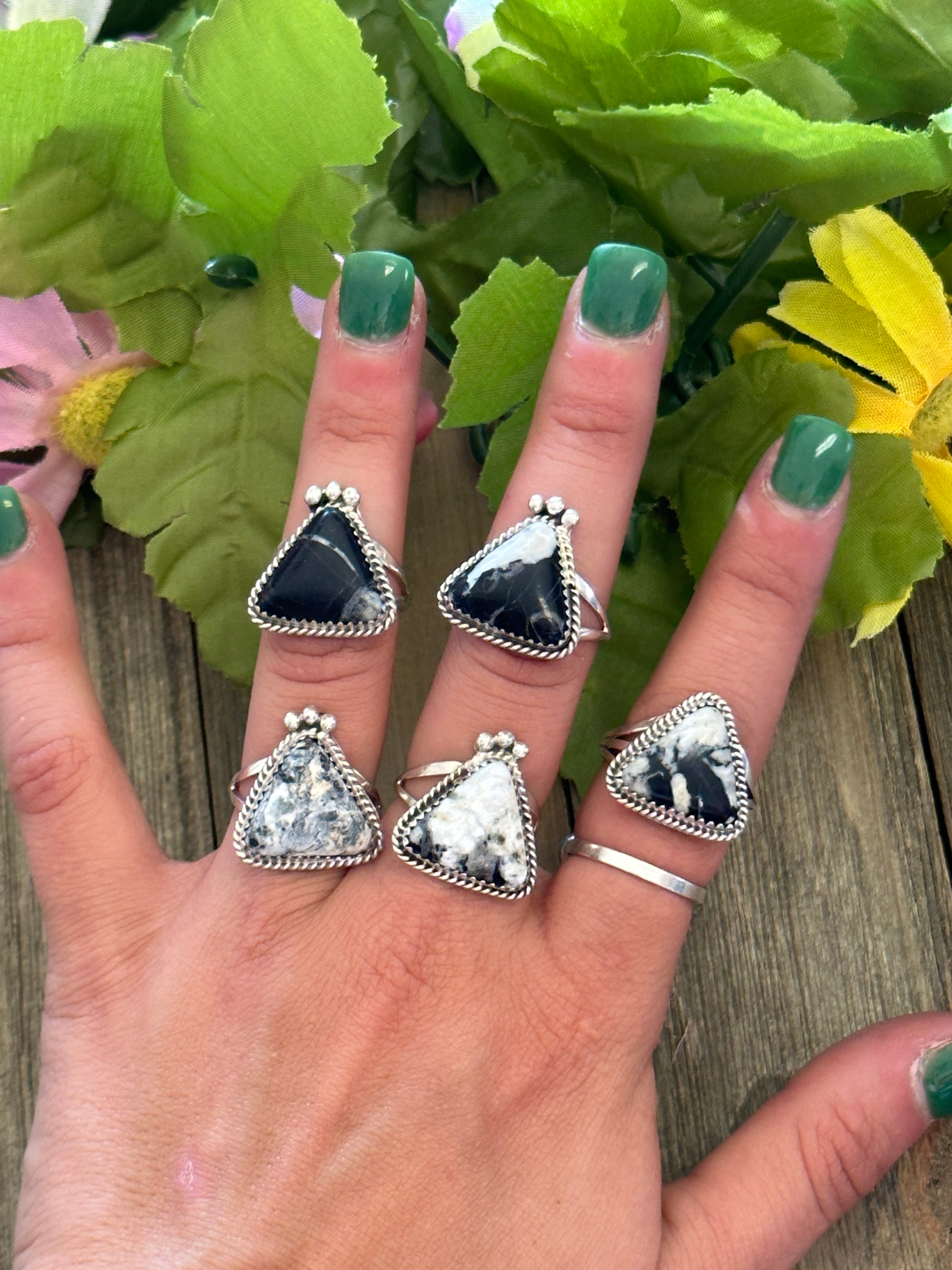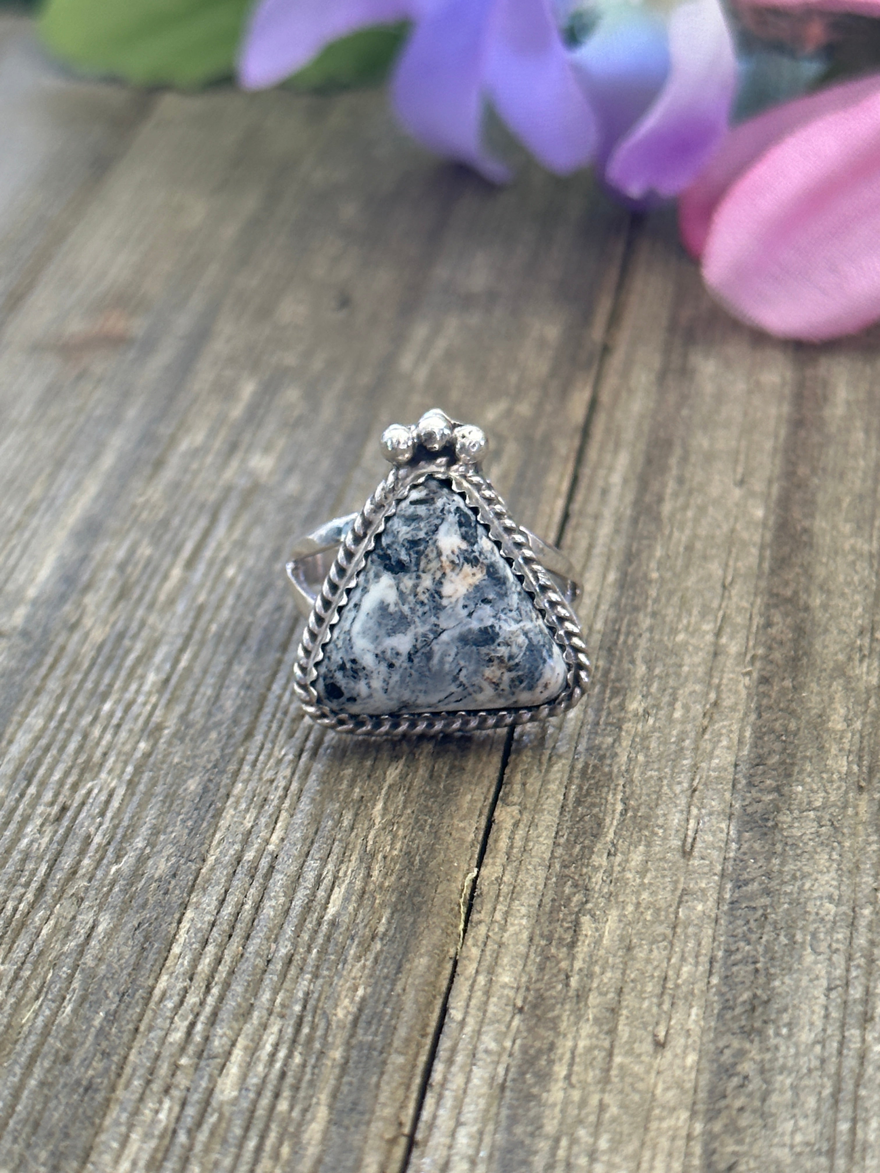 Navajo Made White Buffalo & Sterling Silver Ring. It measures 3/4 of an inch long and just under 3/4 of an inch wide. Signed by artist and stamped sterling silver.