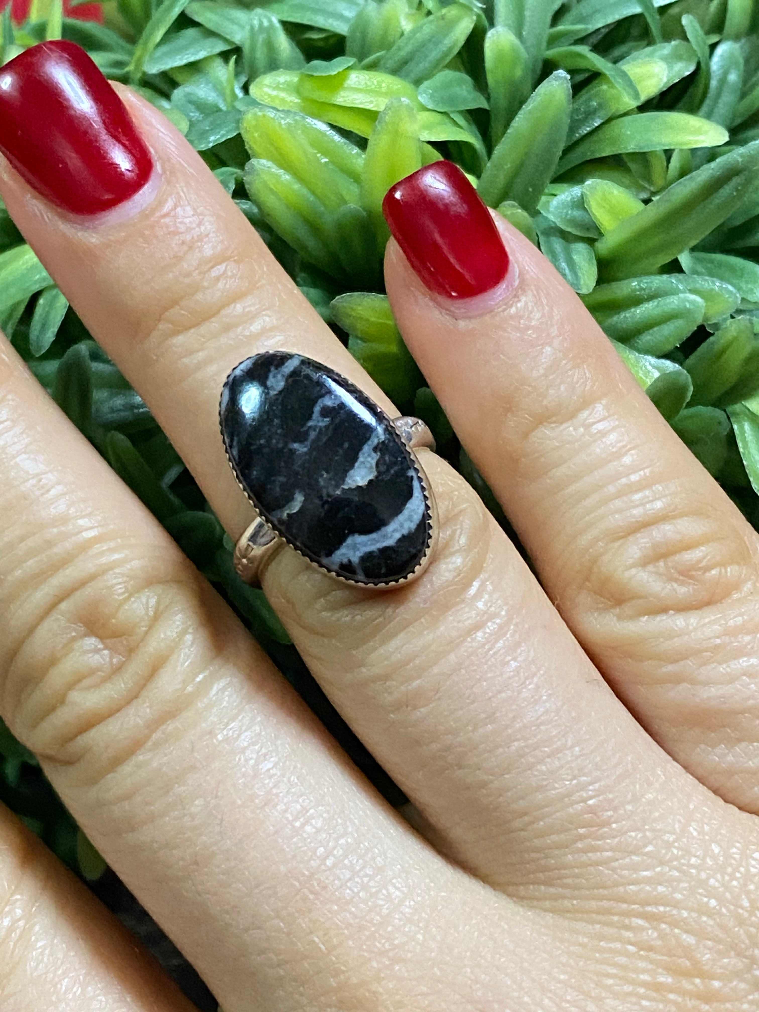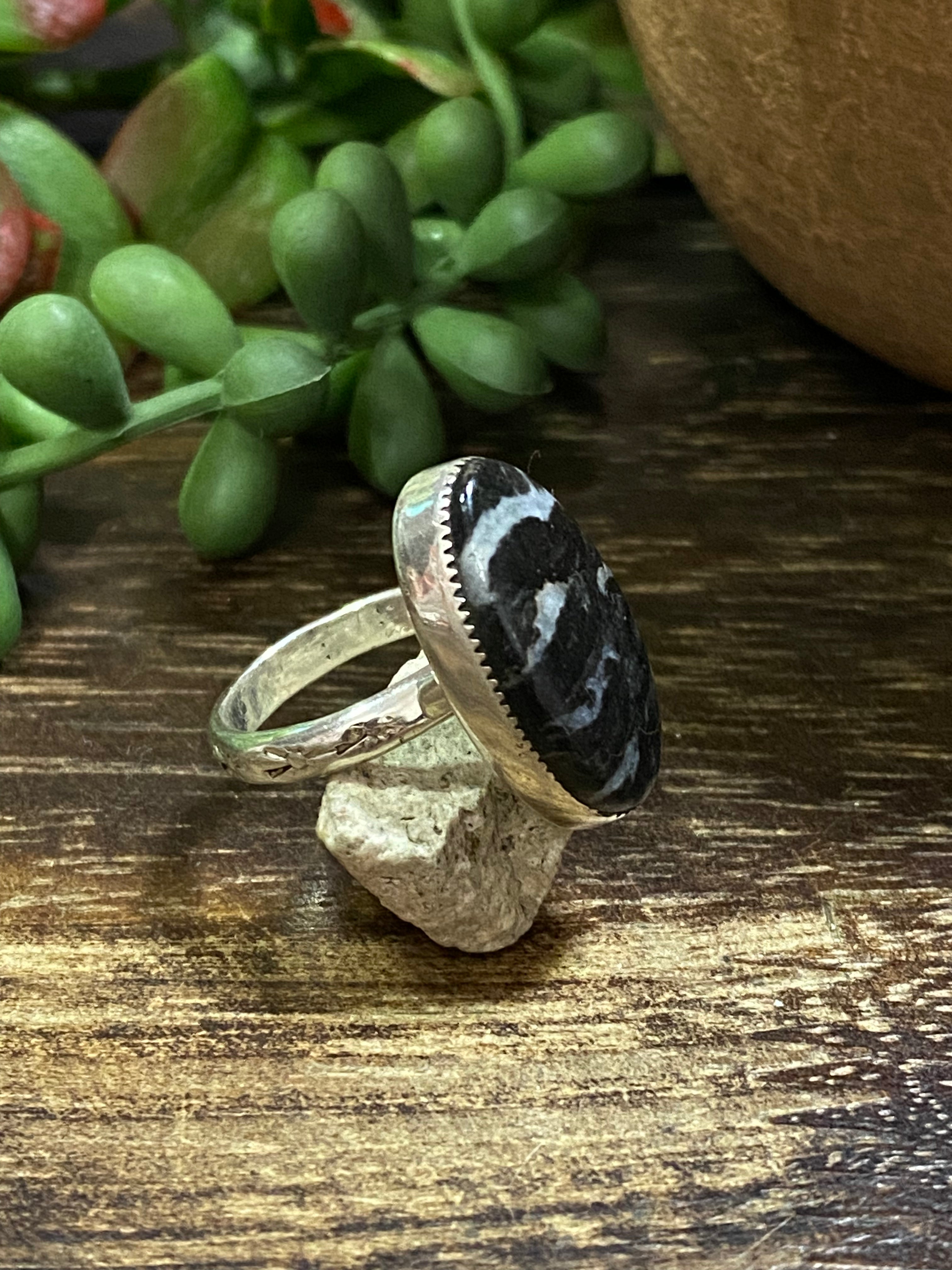 Navajo Made White Buffalo & Sterling Silver Ring Size 6.25. It measures 7/8 of an inch long and 1/2 of an inch wide.