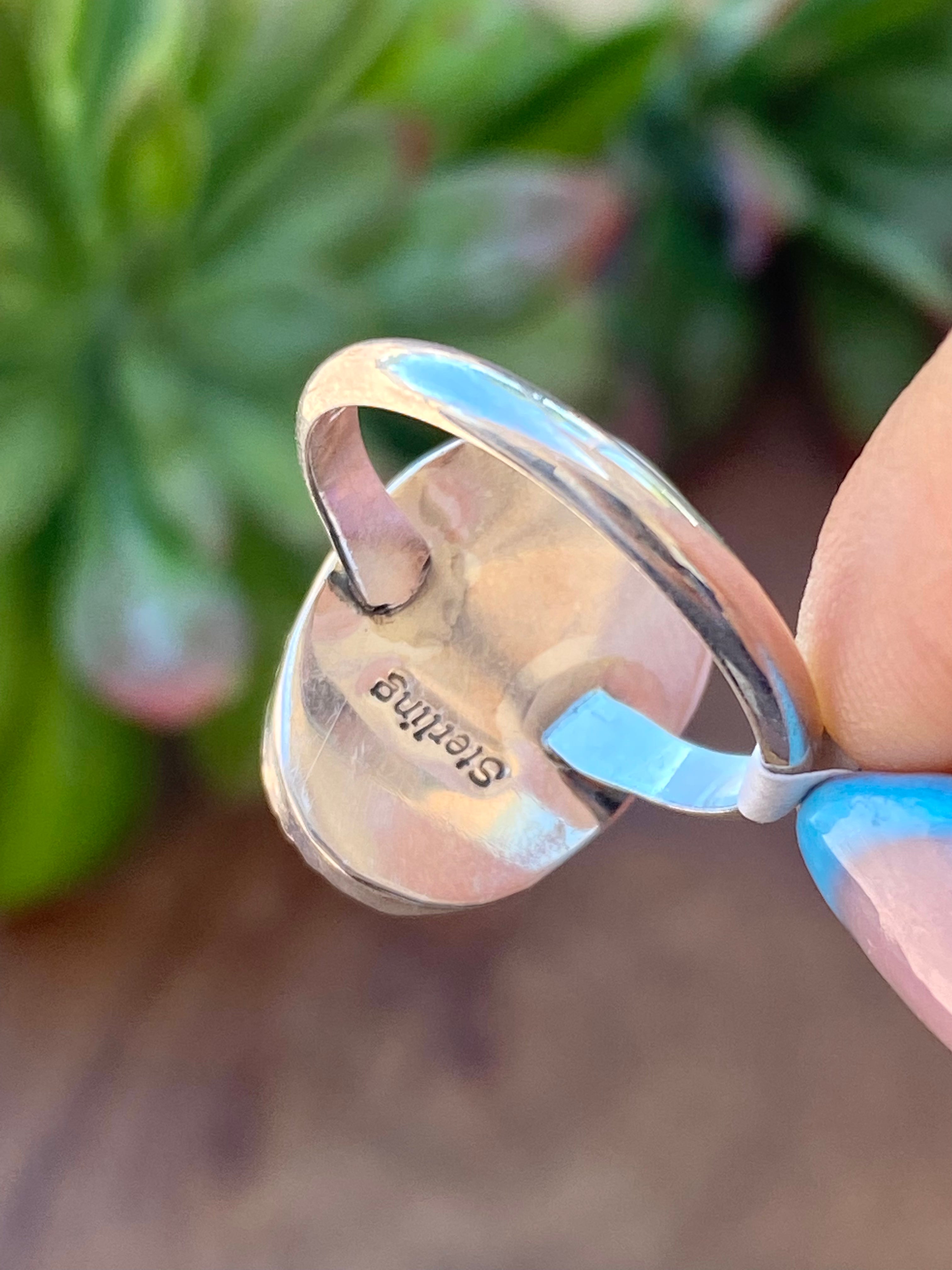 Navajo Made White Buffalo & Sterling Silver Ring Size 7.5. It measures 3/4 of an inch long and just over 1/2 of an inch wide. Stamped sterling silver.
