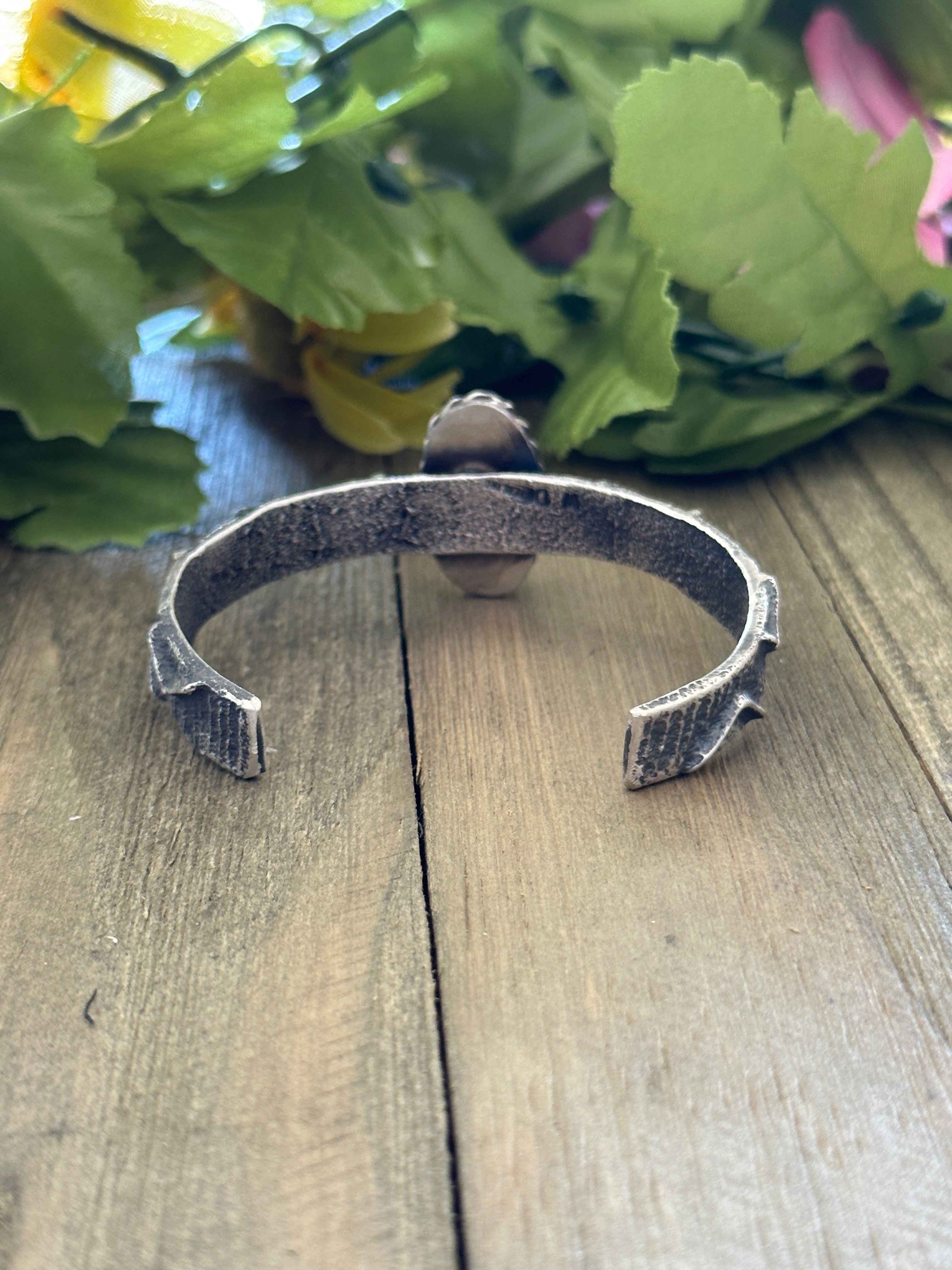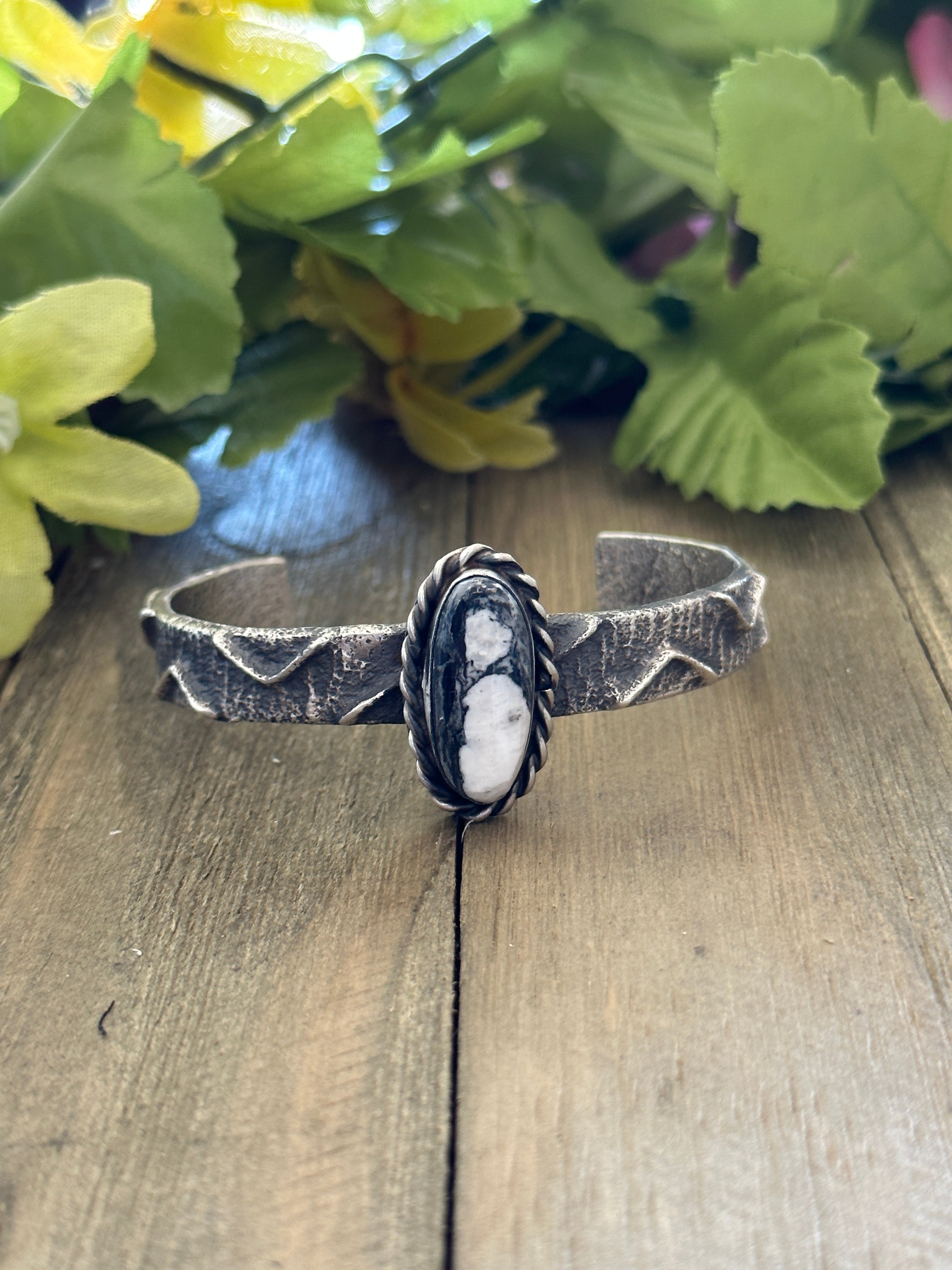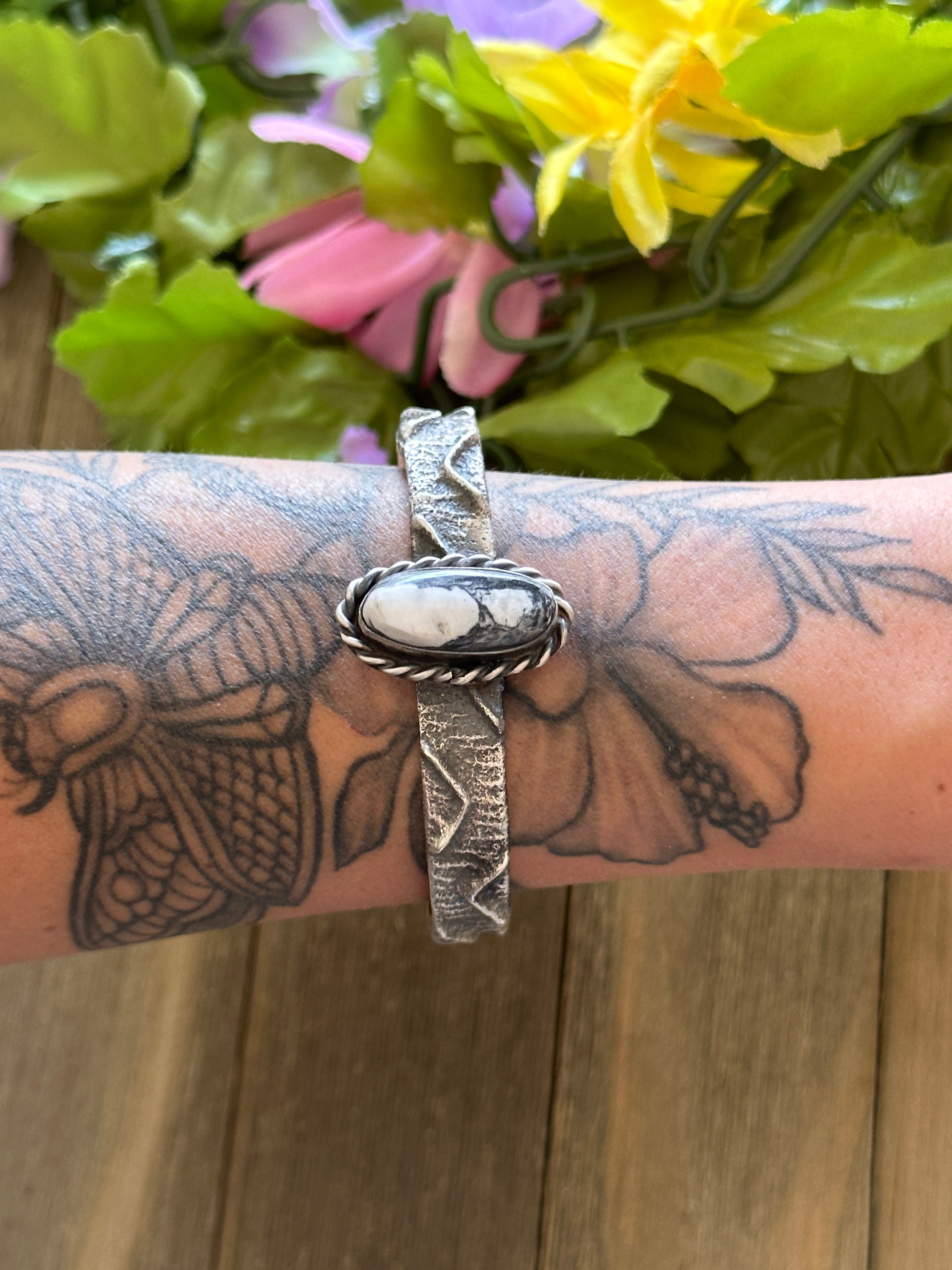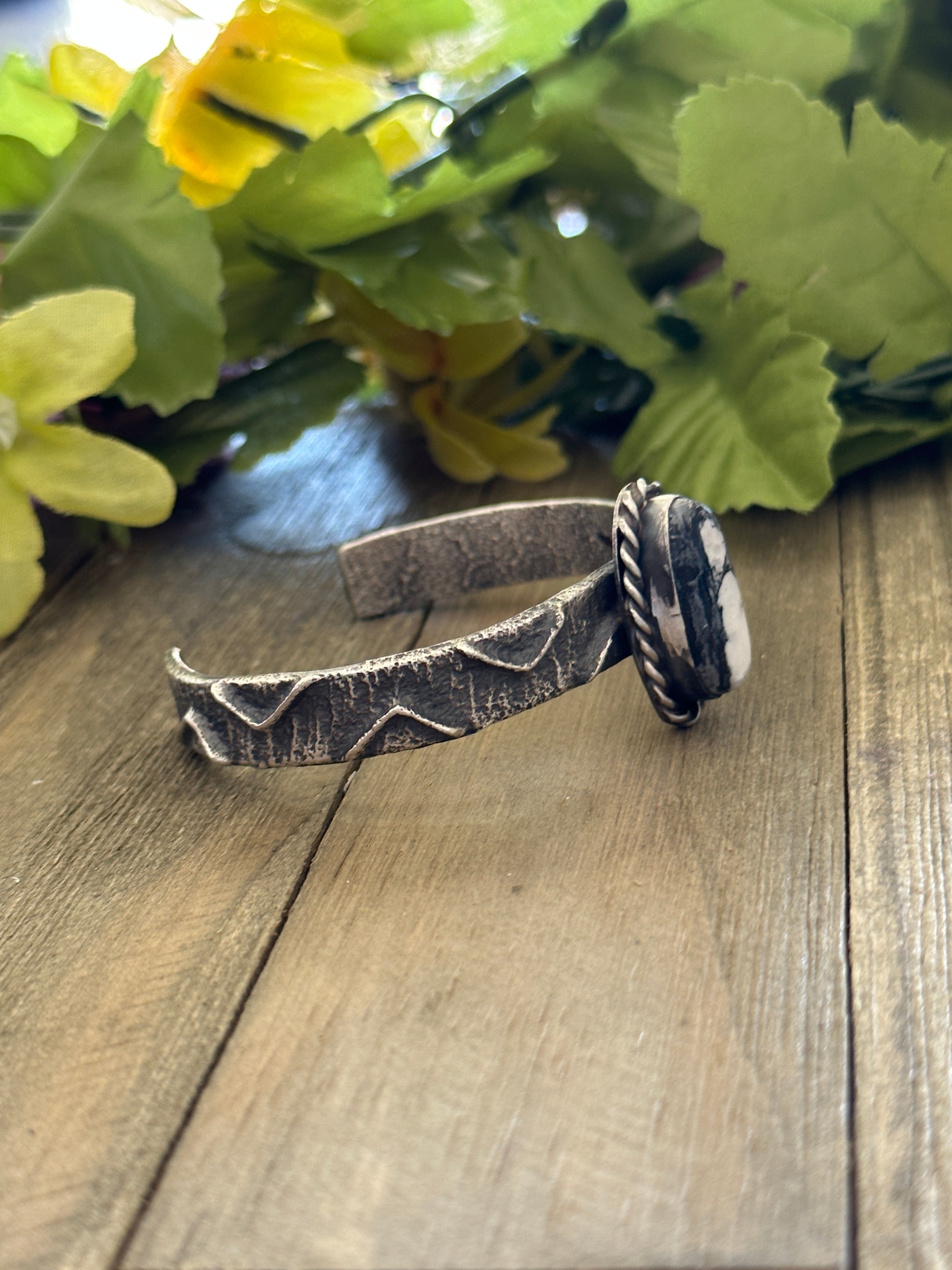 Navajo Made White Buffalo & Sterling Silver Tufa Cast Cuff Bracelet