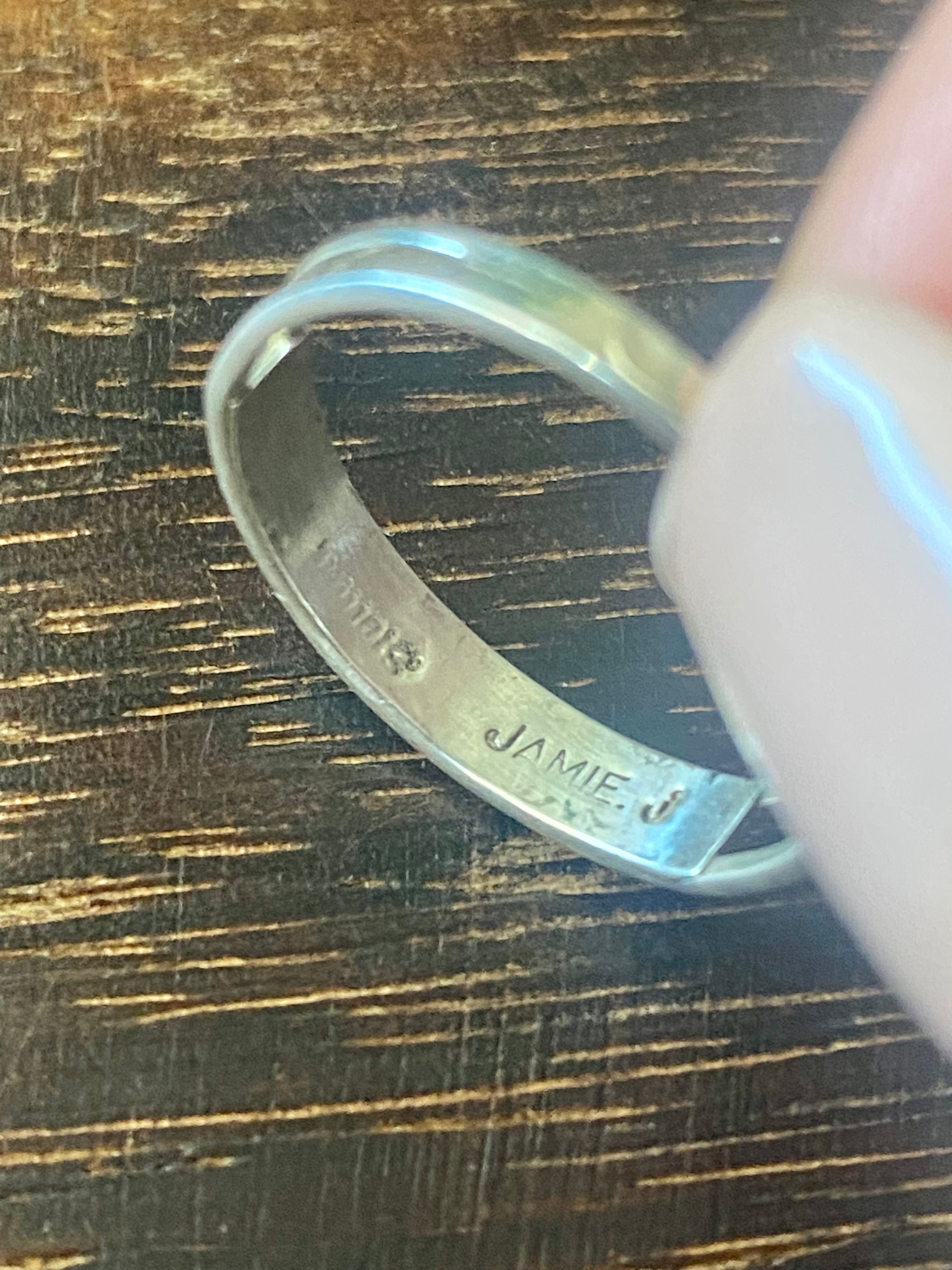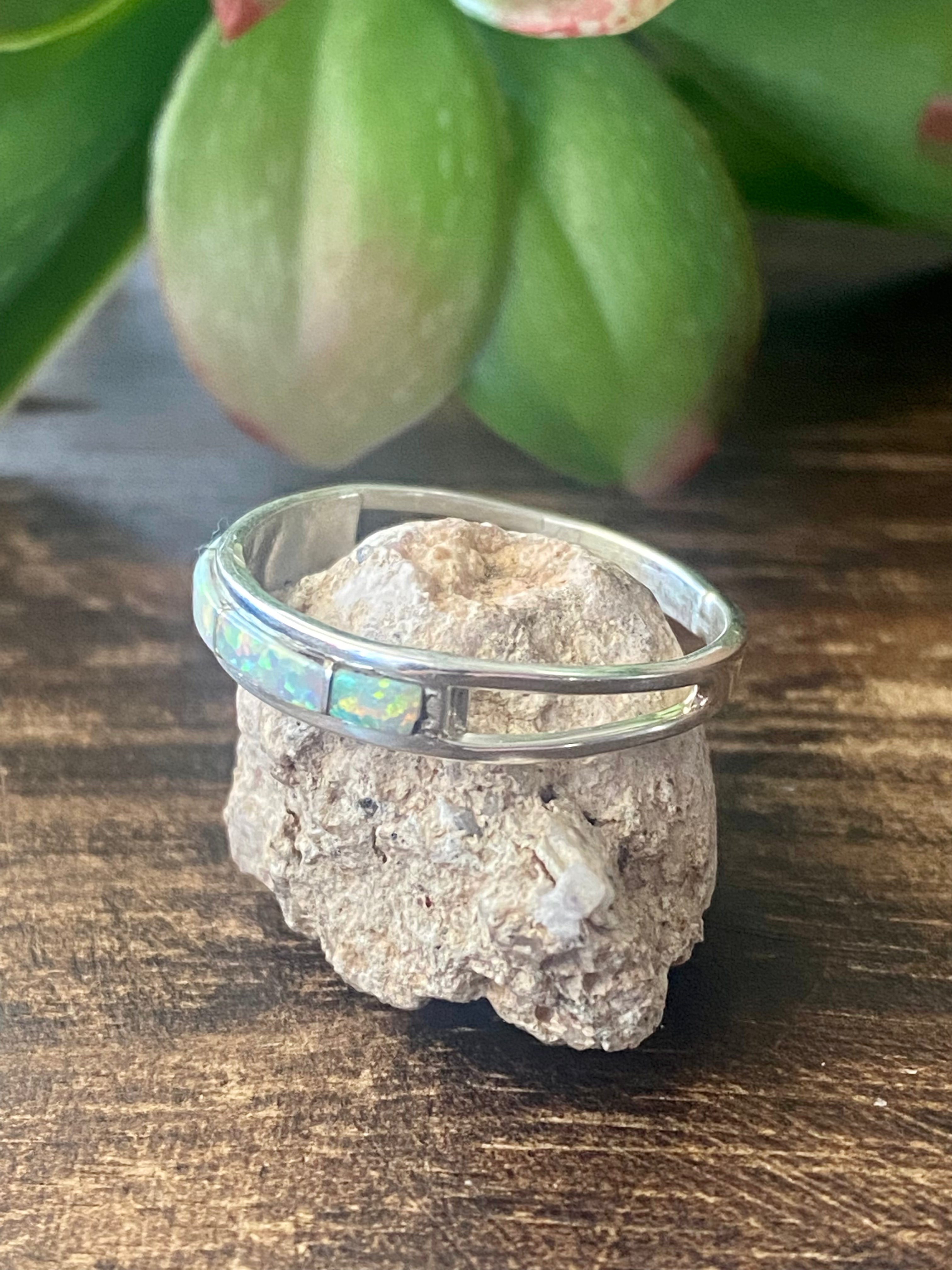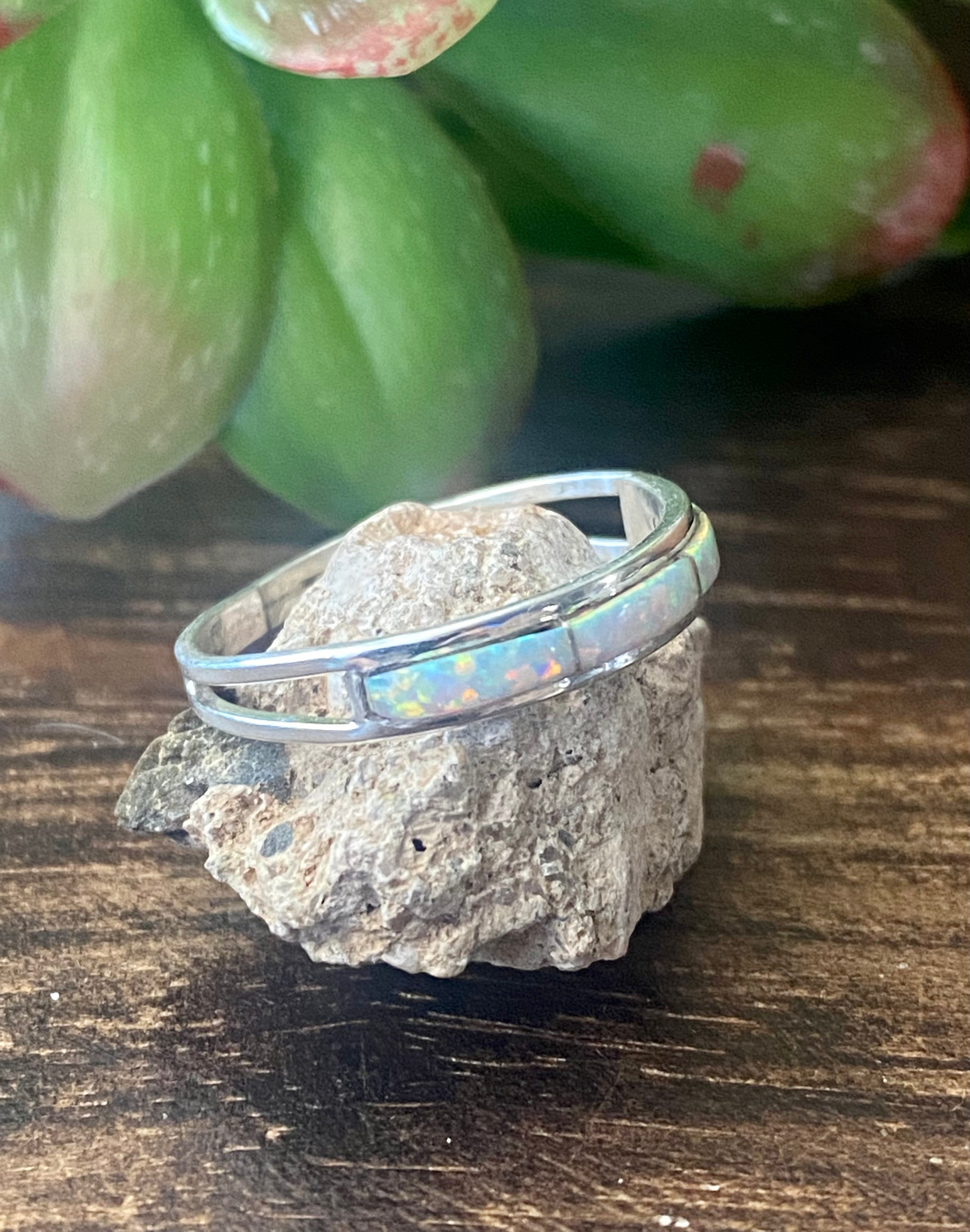 Navajo Made White Opal (Man-Made) & Sterling Silver Inlay Rings. It measures just over 1/8 of an inch long and 3/4 of an inch wide. Signed by the artist and stamped sterling silver.