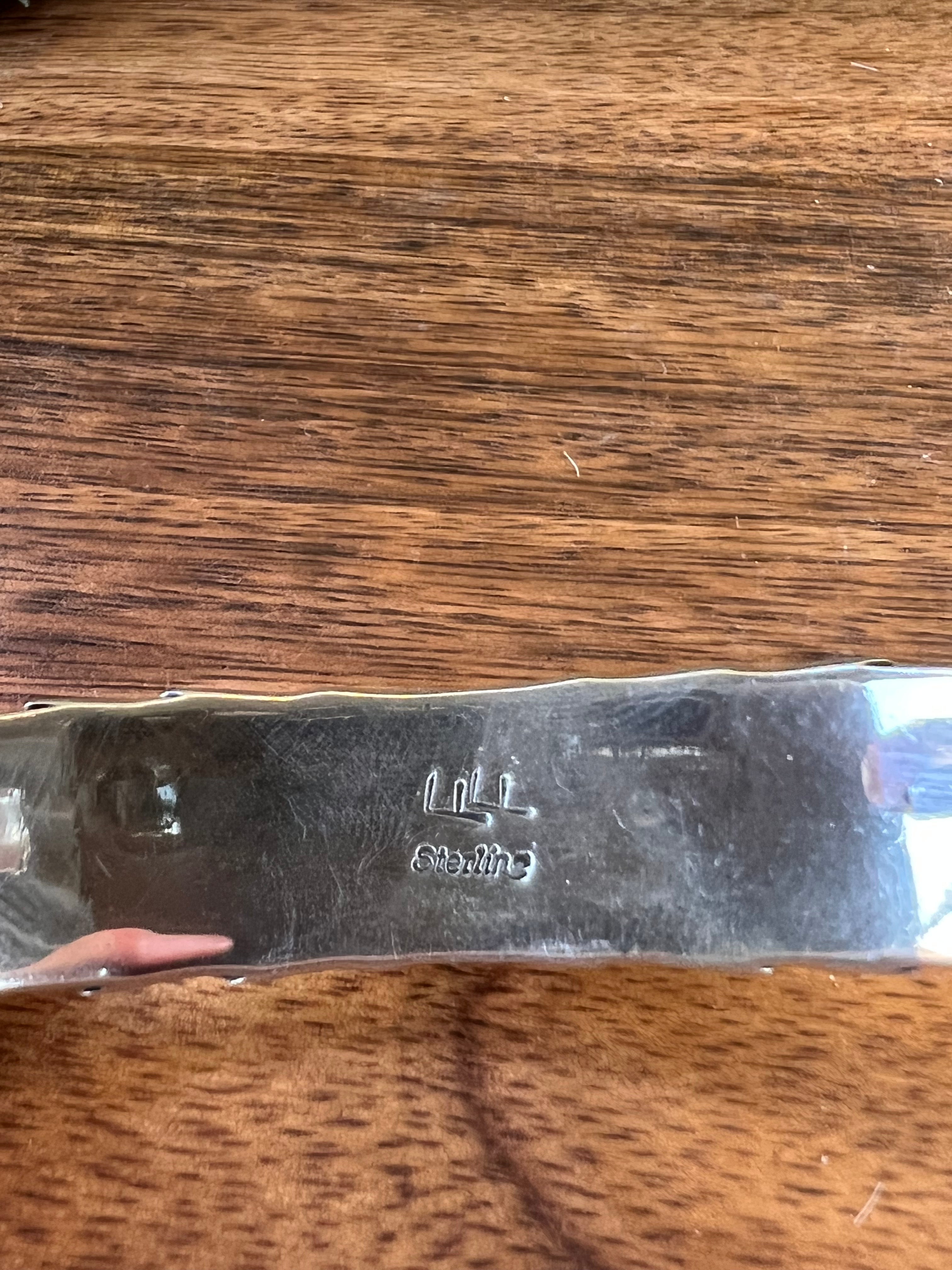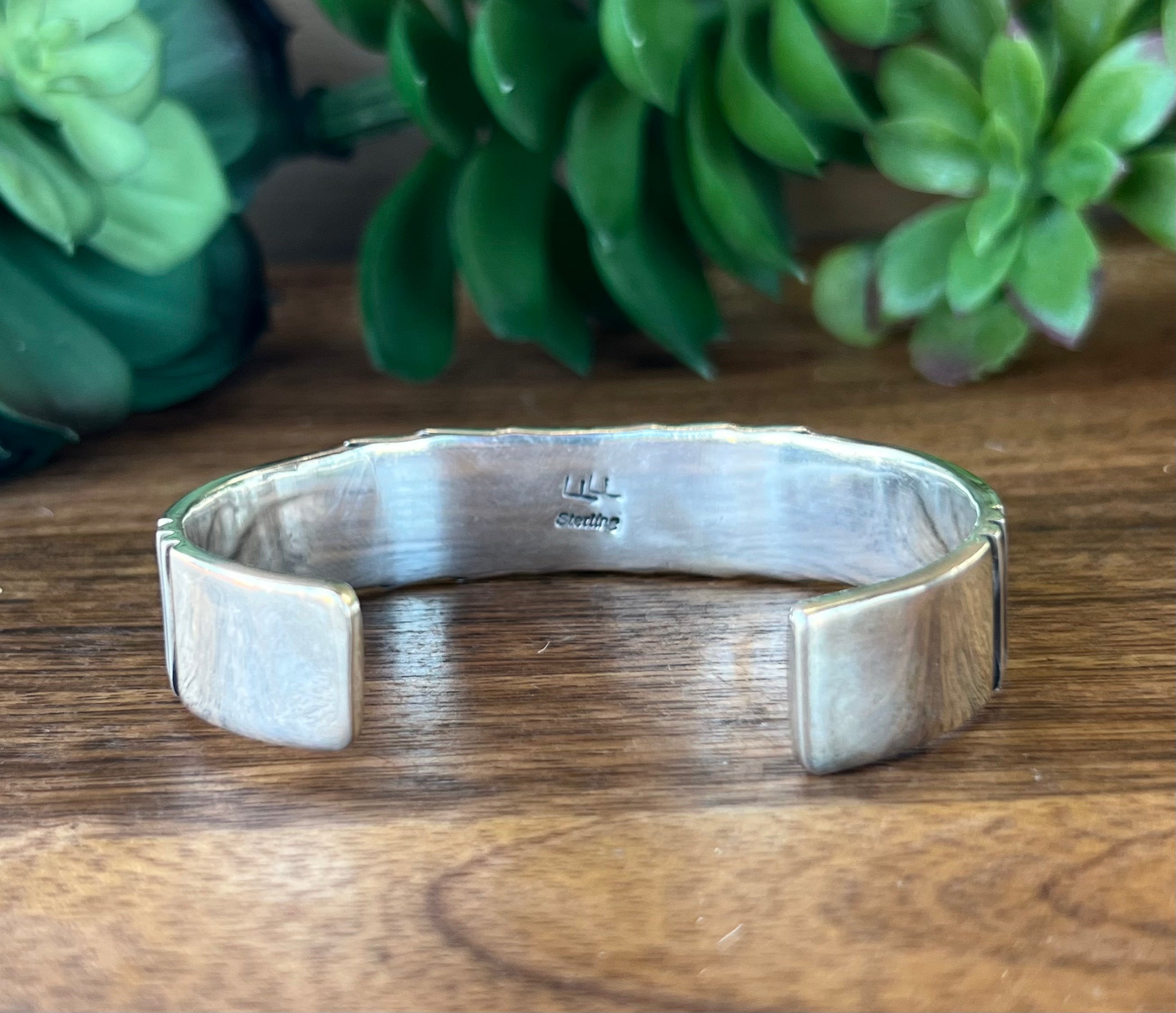 Navajo Natural Royston Turquoise & Sterling Silver Cuff Bracelet. It measures just under 1/2 of an inch wide with an inside circumference 5 5/8 inches and a gap of 1 1/8 inches. Signed by artist and stamped sterling silver.