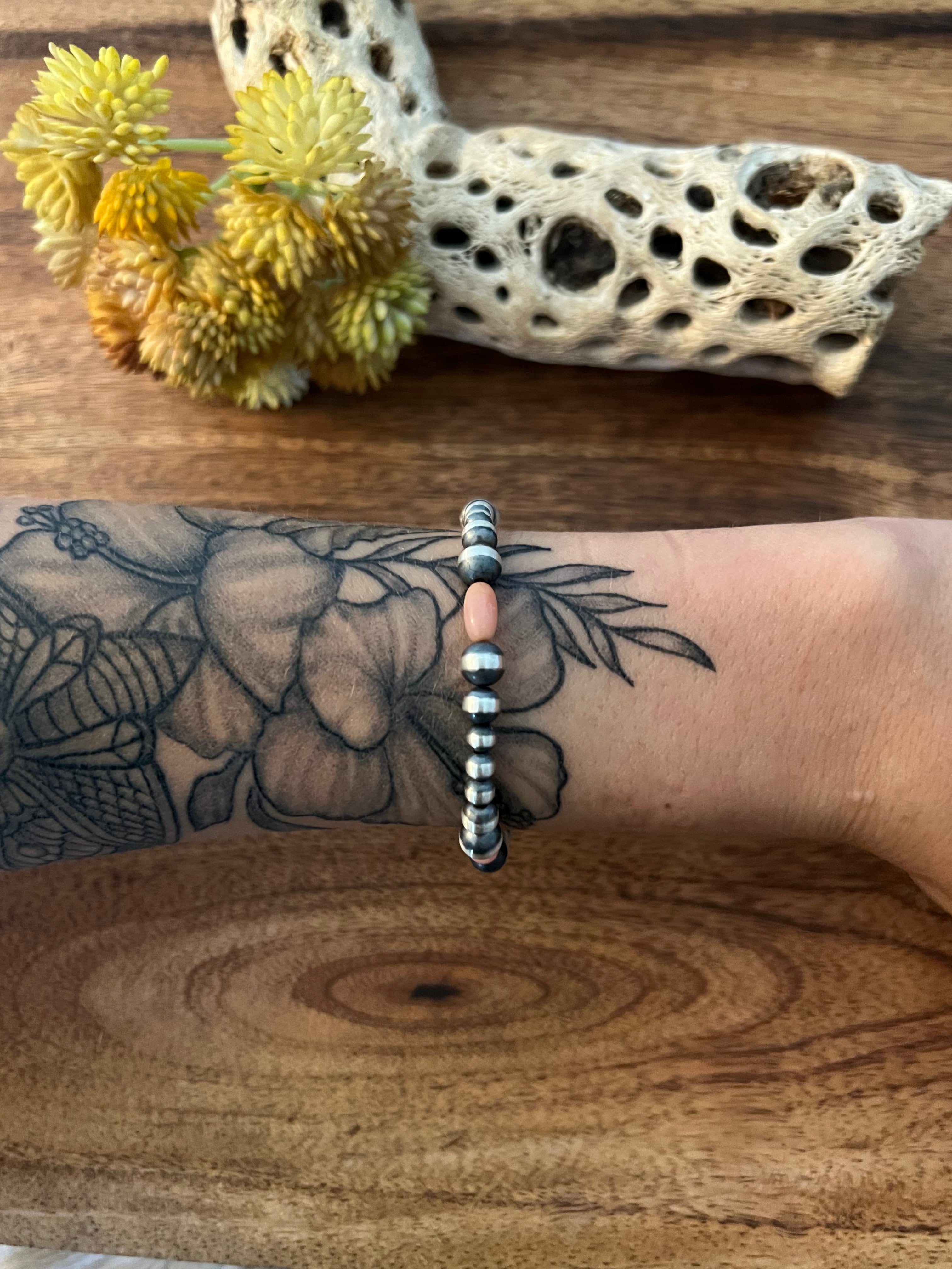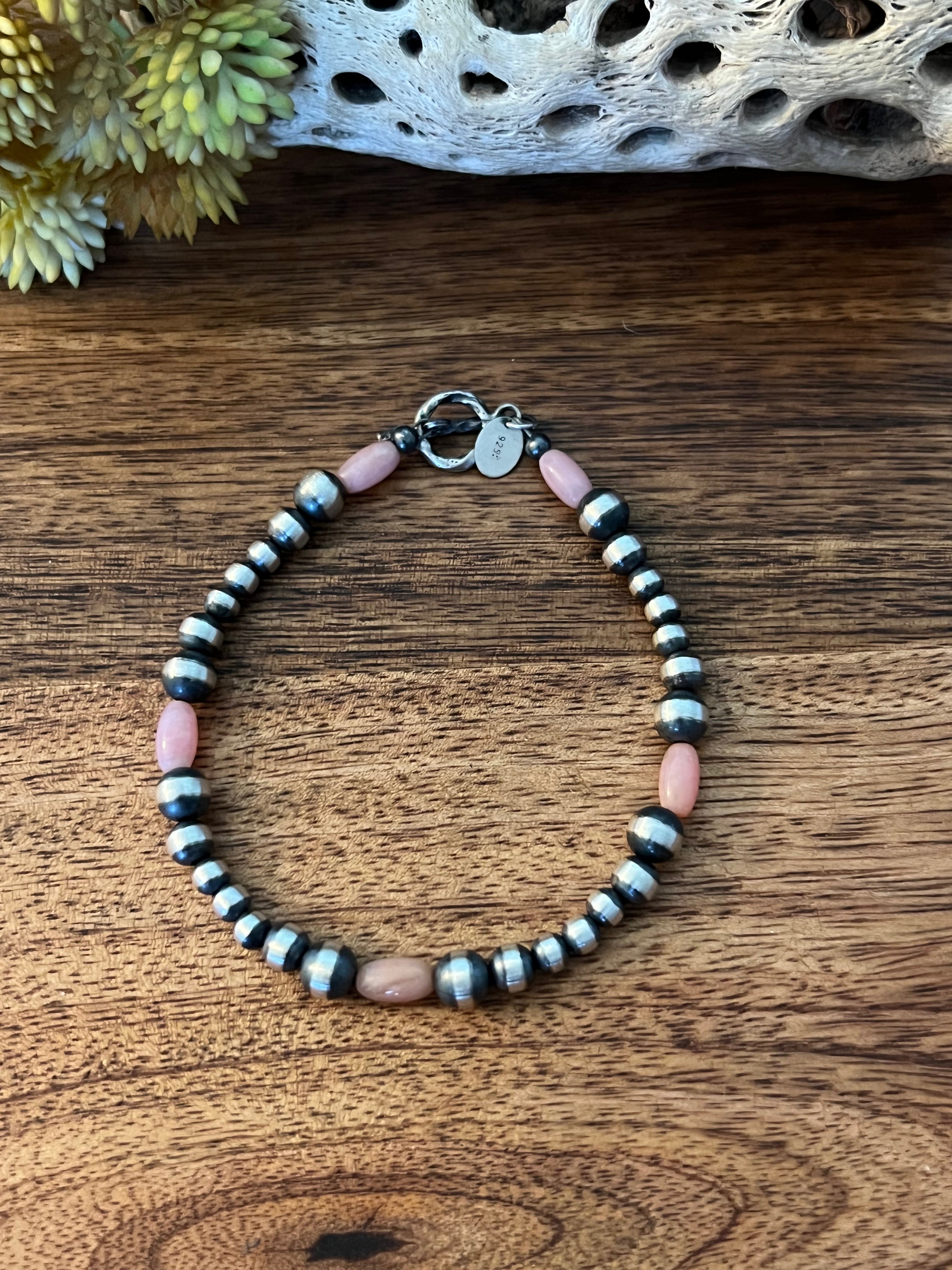 Navajo Strung Pink Coral & Sterling Silver Graduated Pearl Bracelet. It measures an inside circumference of 6 3/4 inches with an assortment of different MM pearls. Stamped sterling silver.