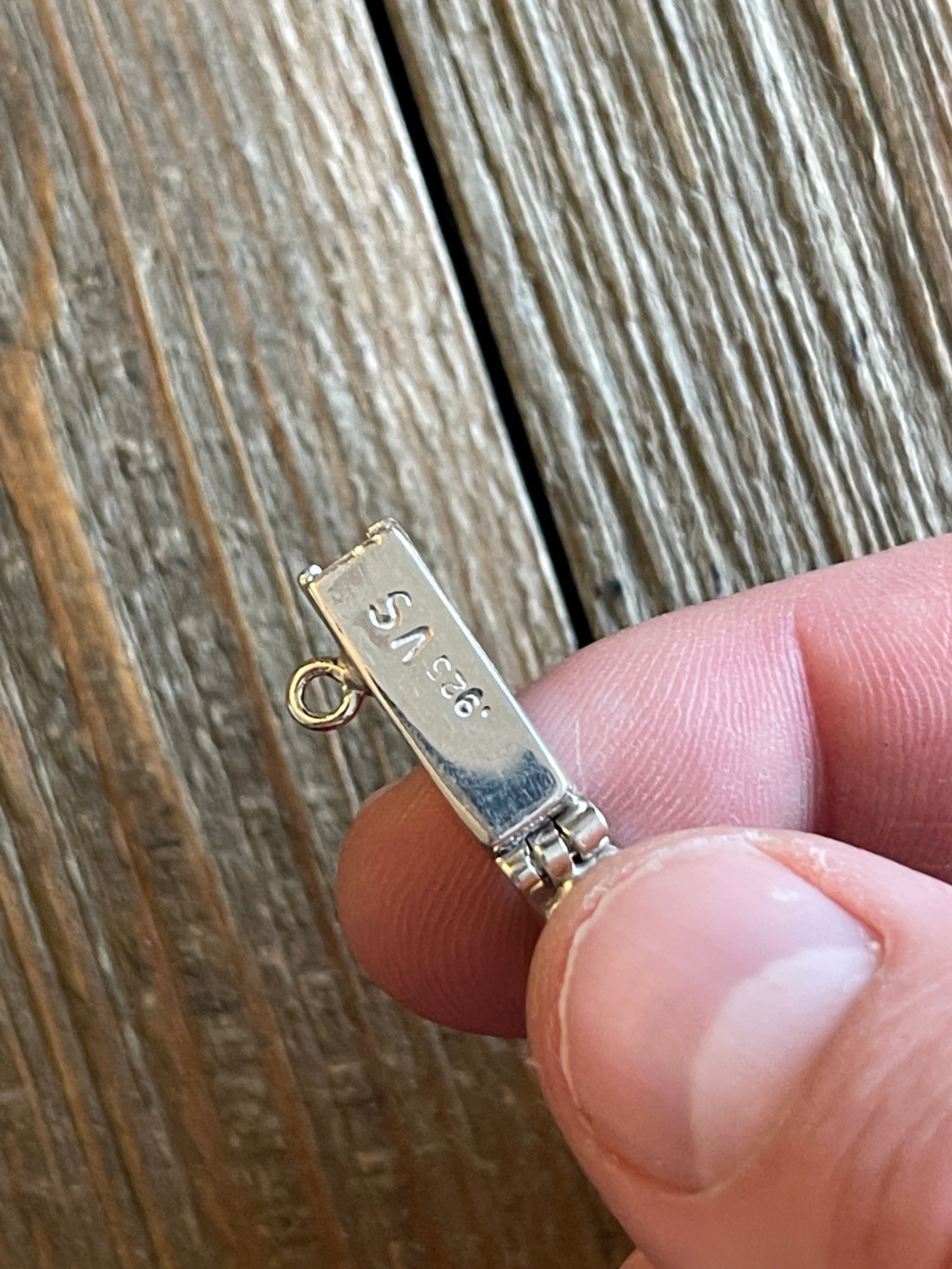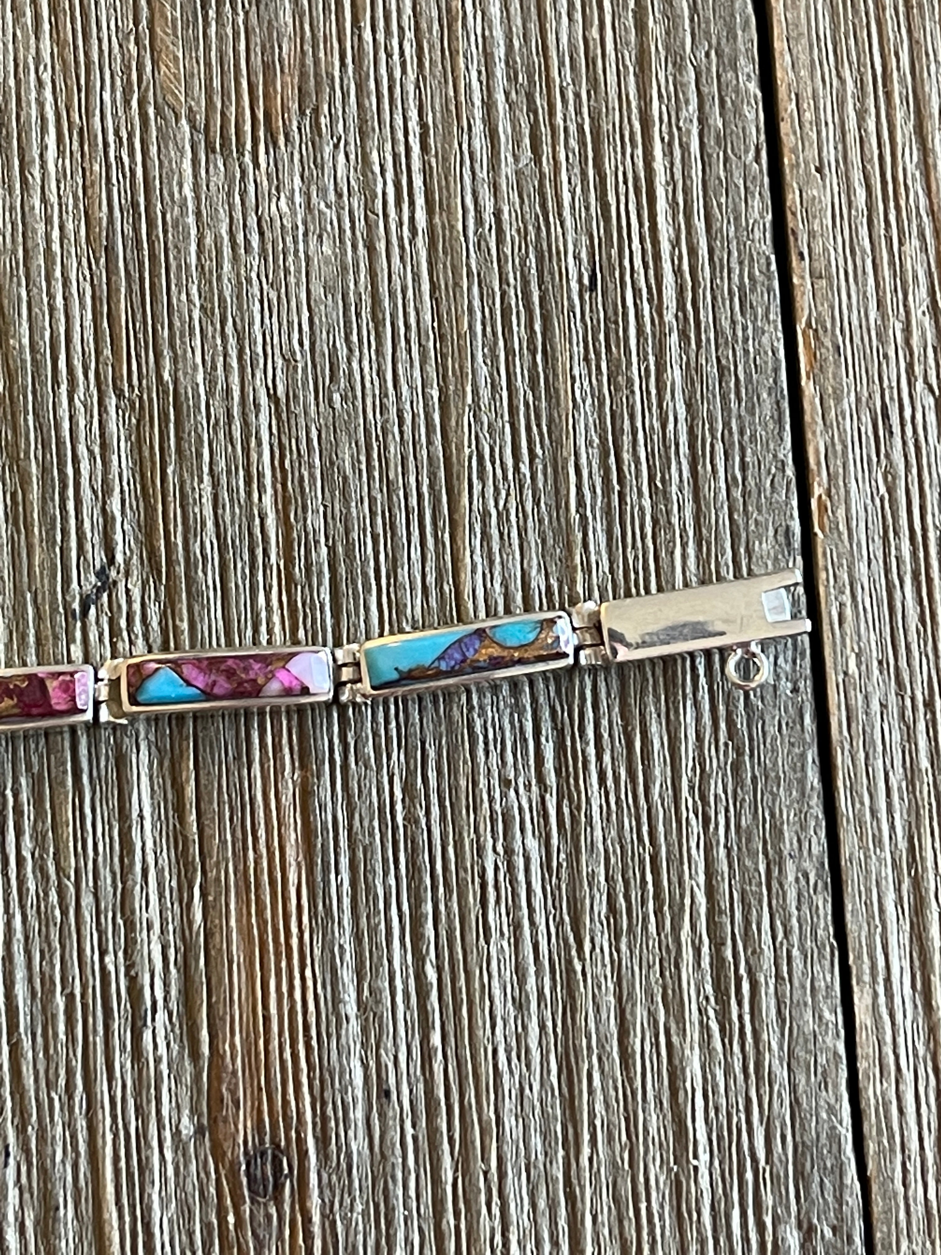 Navajo Pink Dream Mohave Turquoise & Sterling Silver Link Bracelet. It measures 7 inches long but can be adjusted with chain and 1/4 of an inch wide. Signed by the artist and stamped sterling silver.