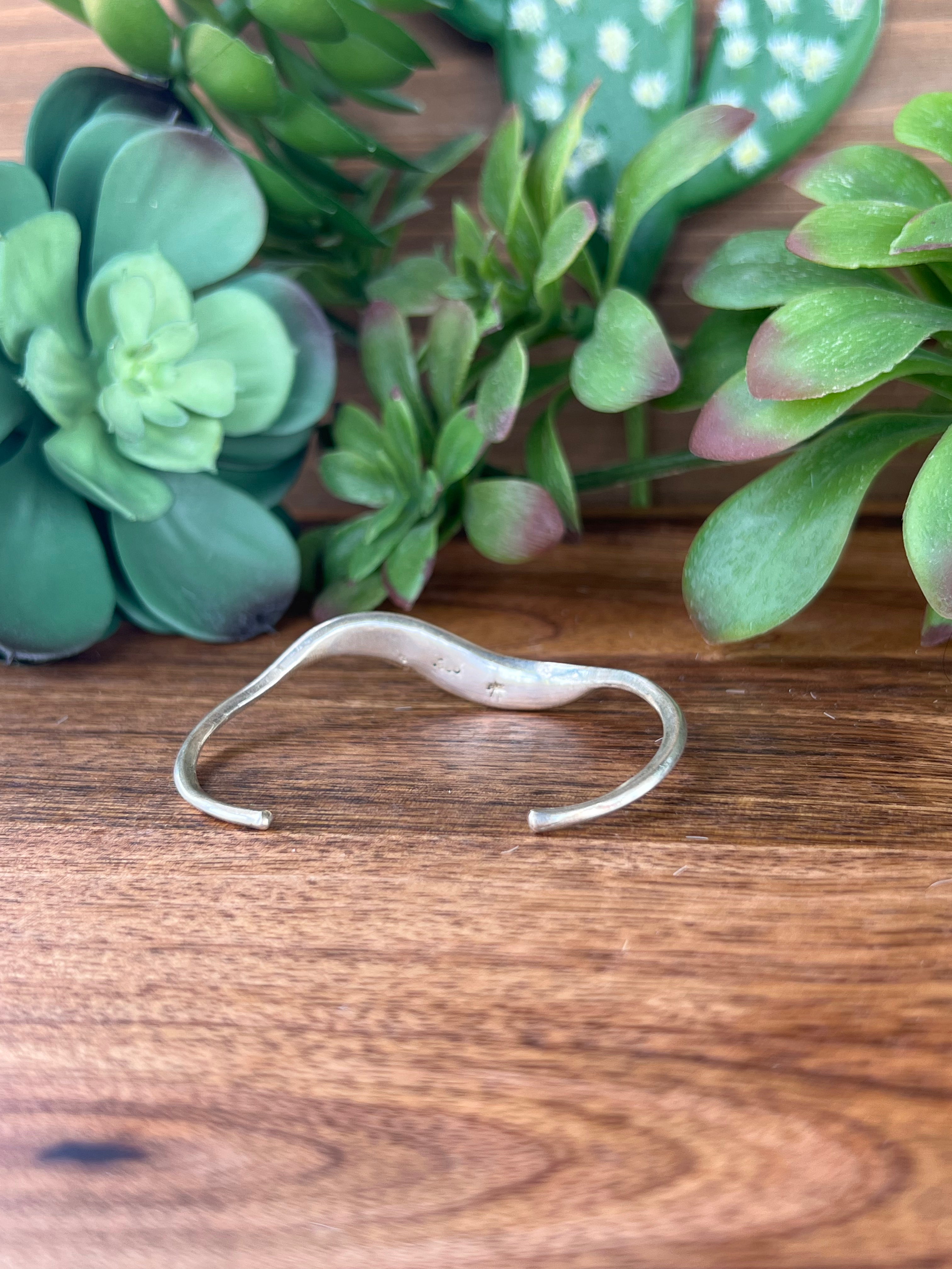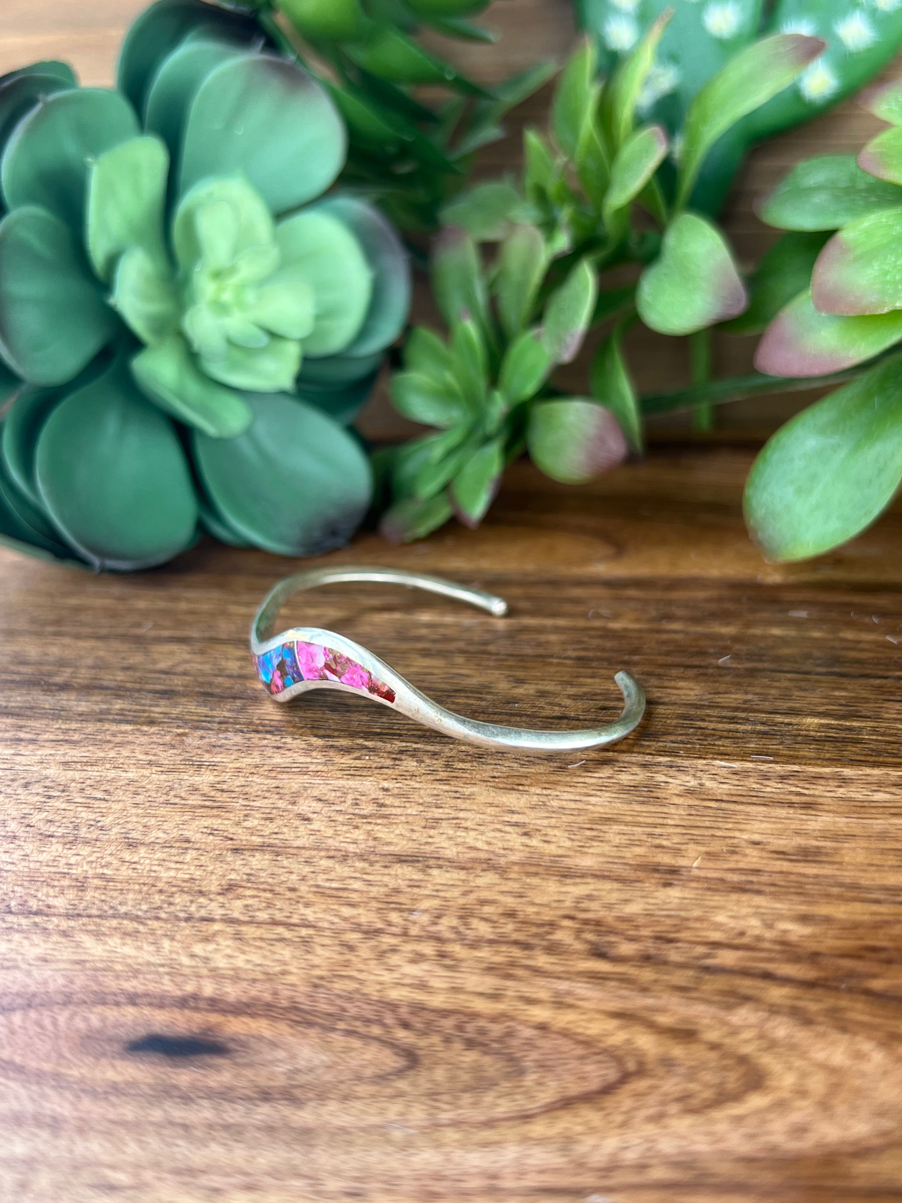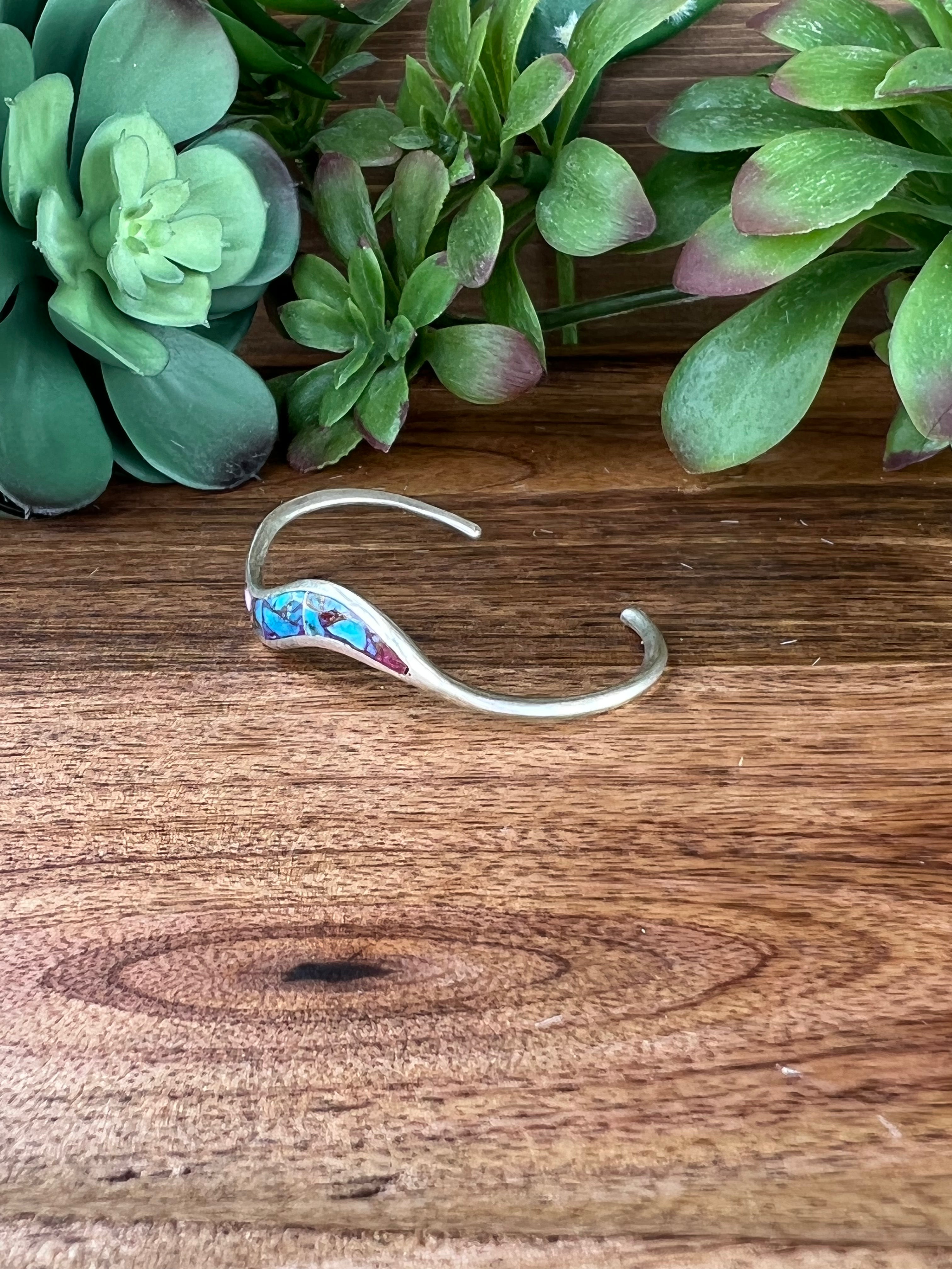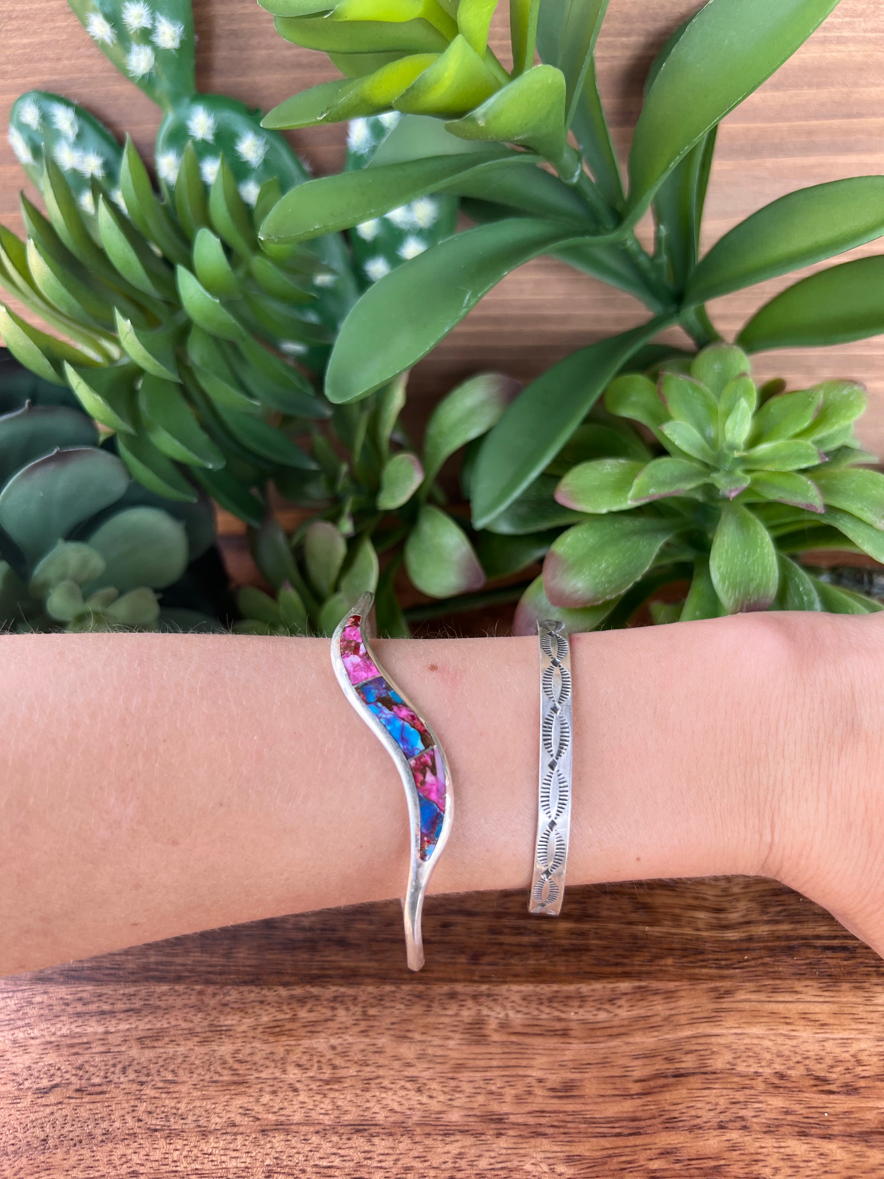 Navajo Pink Mohave Turquoise & Sterling Silver Cuff Bracelet. It measures just over 1/4 of an inch wide with an inside circumference of 5 3/8 inches and a gap of 1 1/4 inches. Signed by the artist and stamped sterling silver.