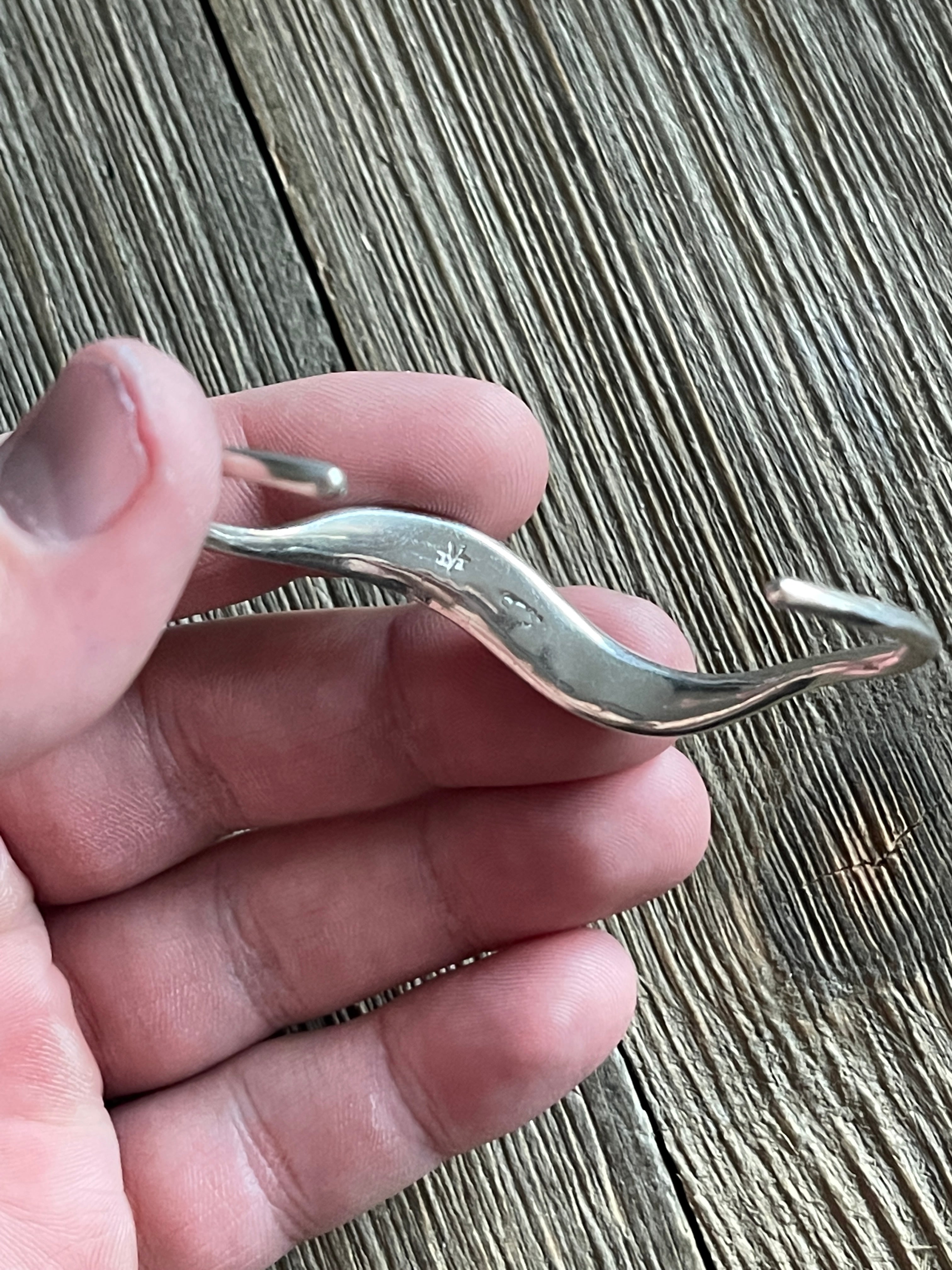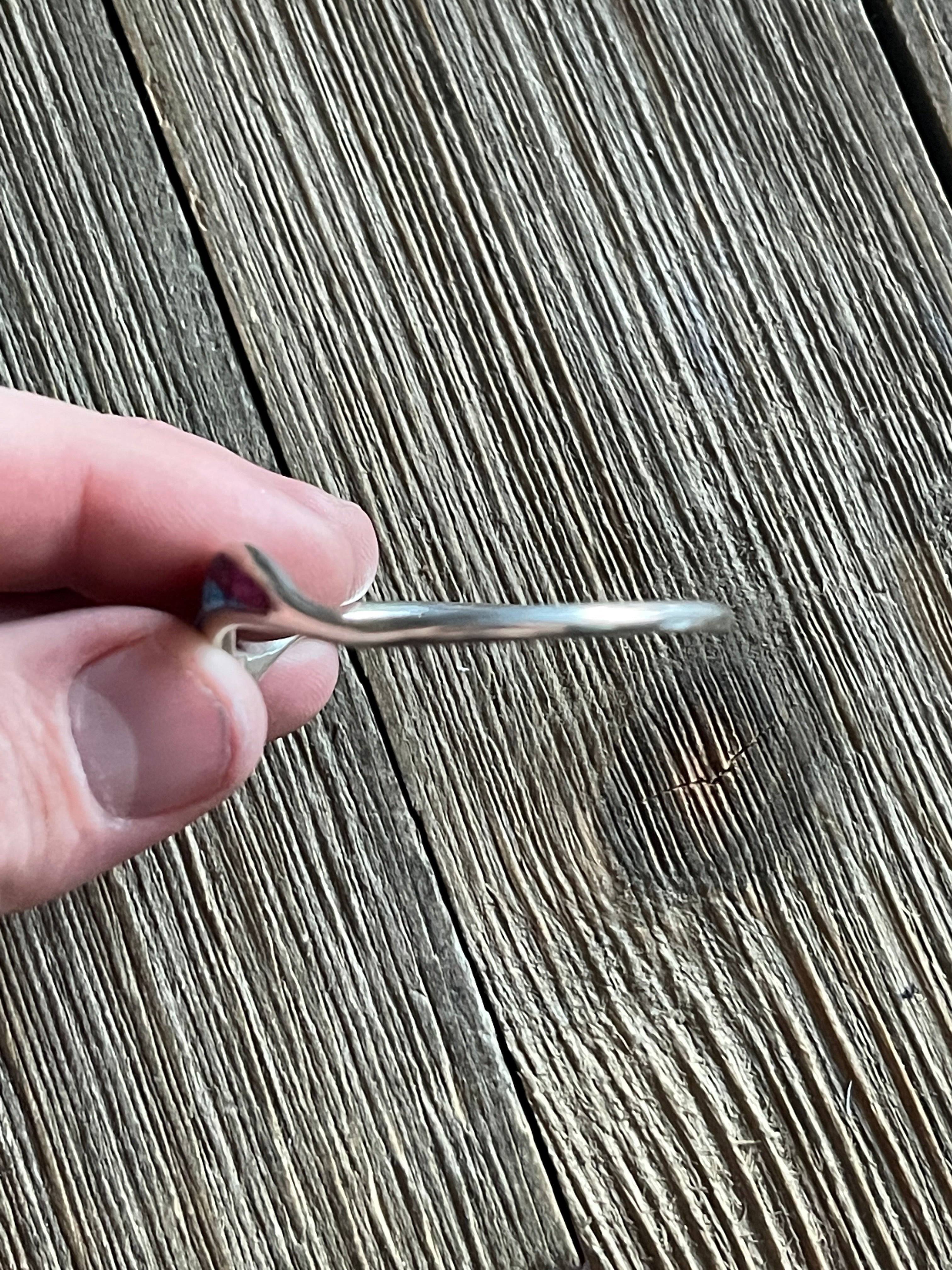 Navajo Pink Mohave Turquoise & Sterling Silver Cuff Bracelet. It measures just over 1/4 of an inch wide with an inside circumference of 5 3/8 inches and a gap of 1 1/4 inches. Signed by the artist and stamped sterling silver.