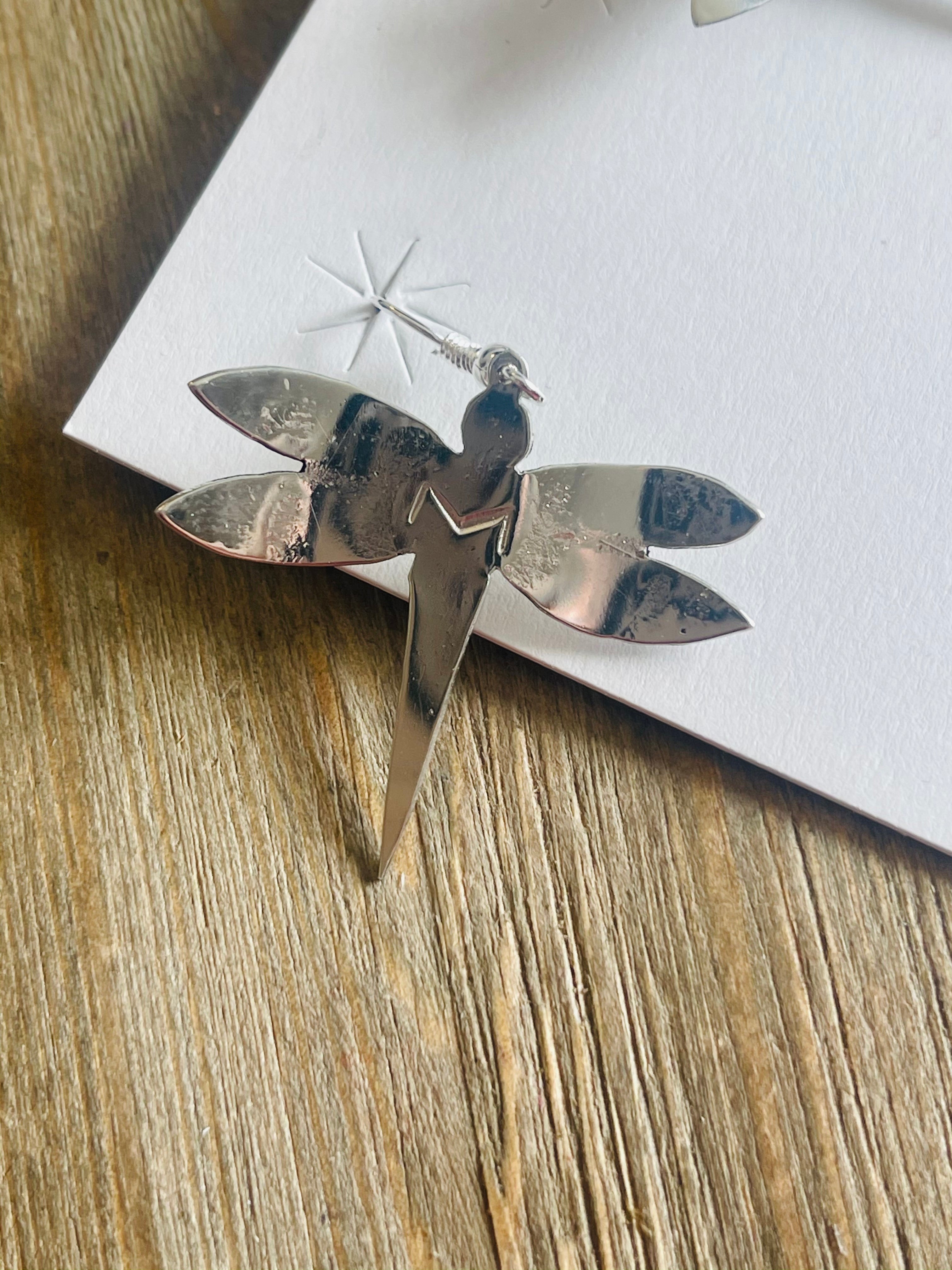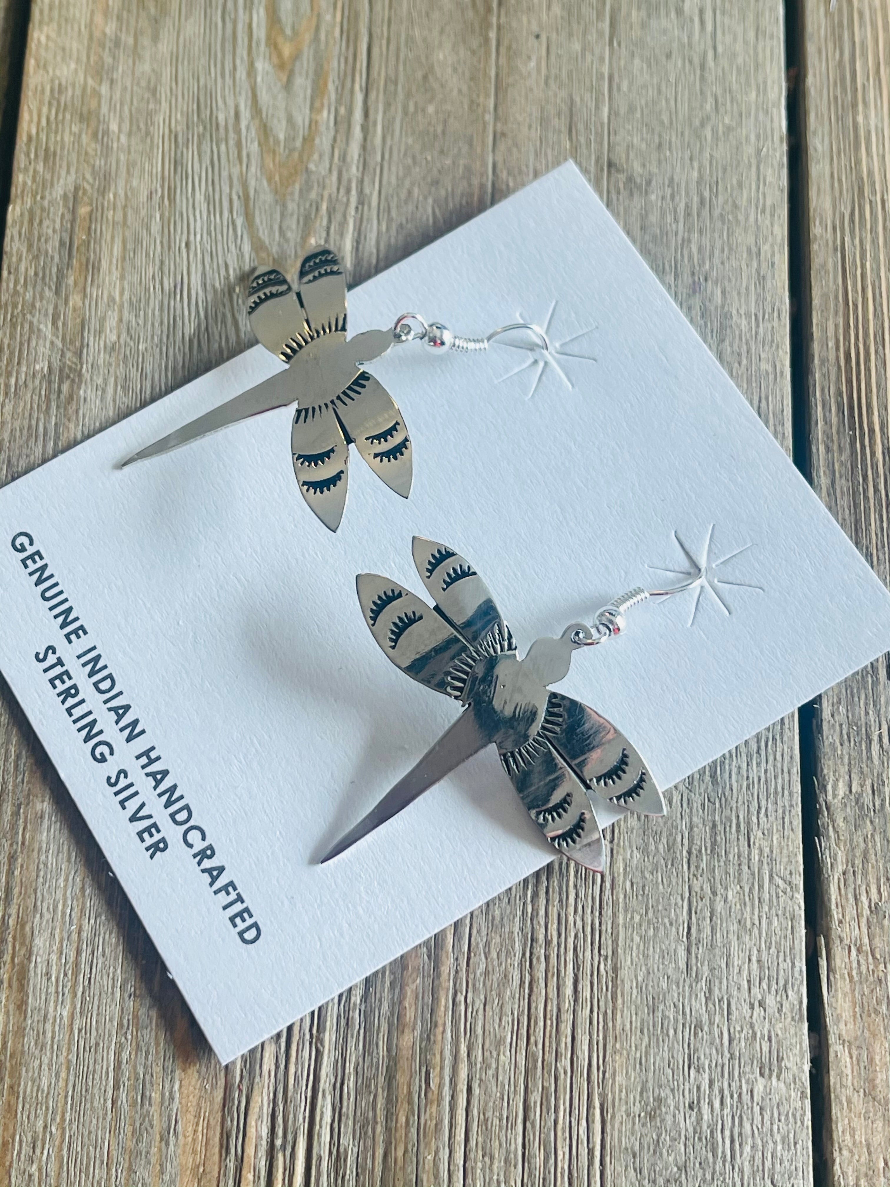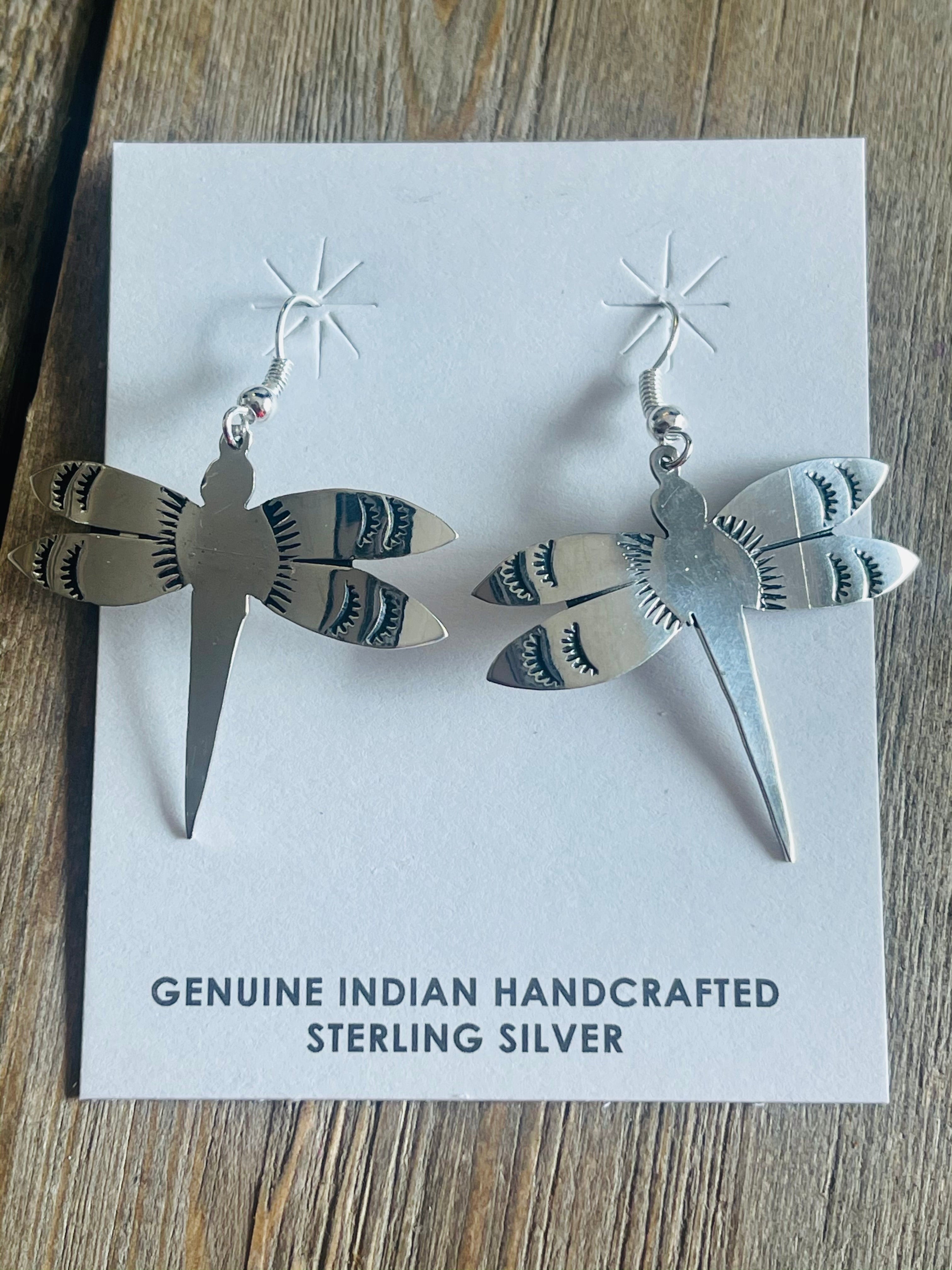 Navajo Sterling Silver Dragonfly Dangles. It measures 1 7/8 inches long and 1 3/8 inches wide. Signed by artist.
