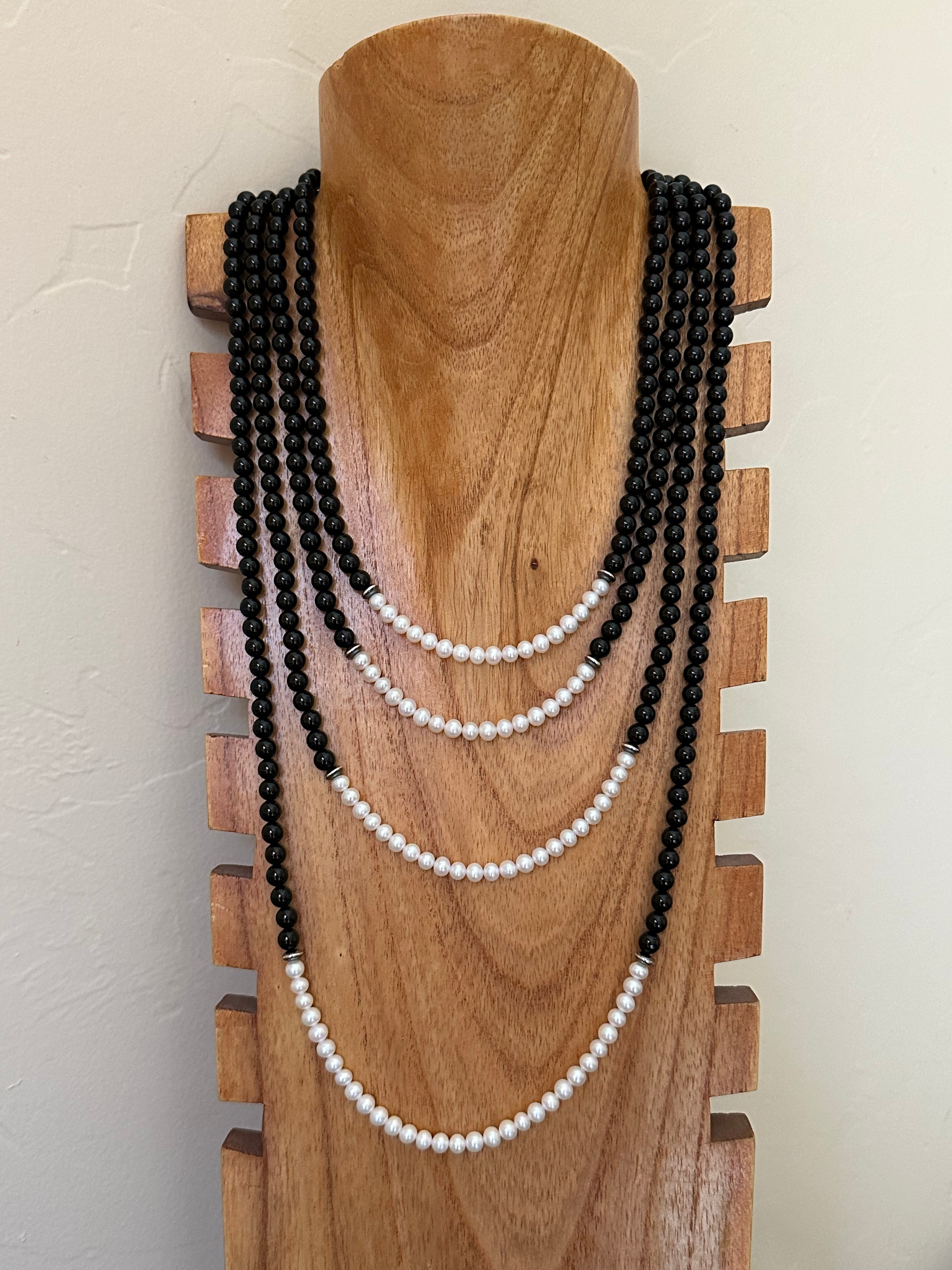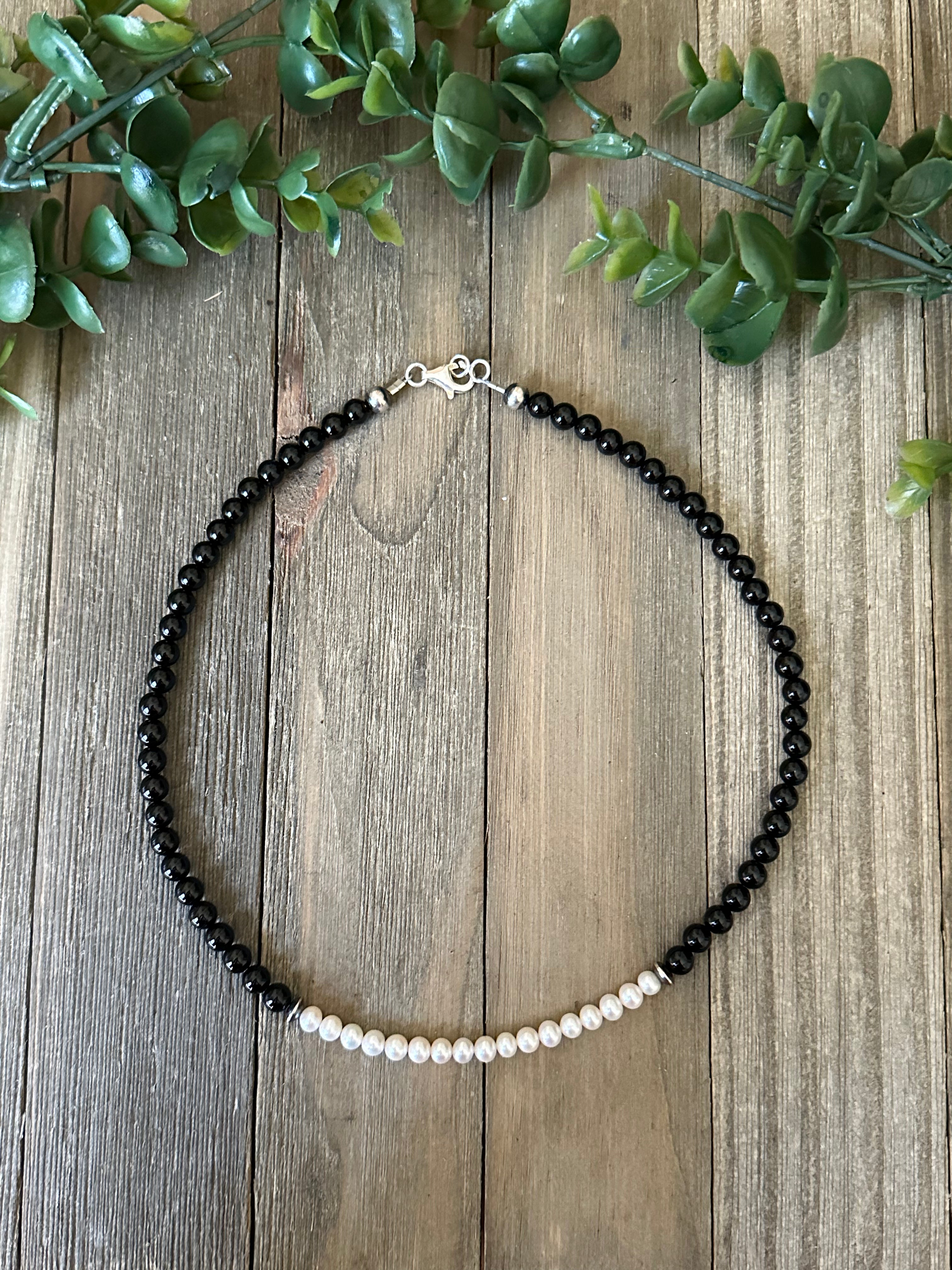 Navajo Strung Onyx & Fresh Wayer Pearls & Sterling Silver Beaded Necklace
