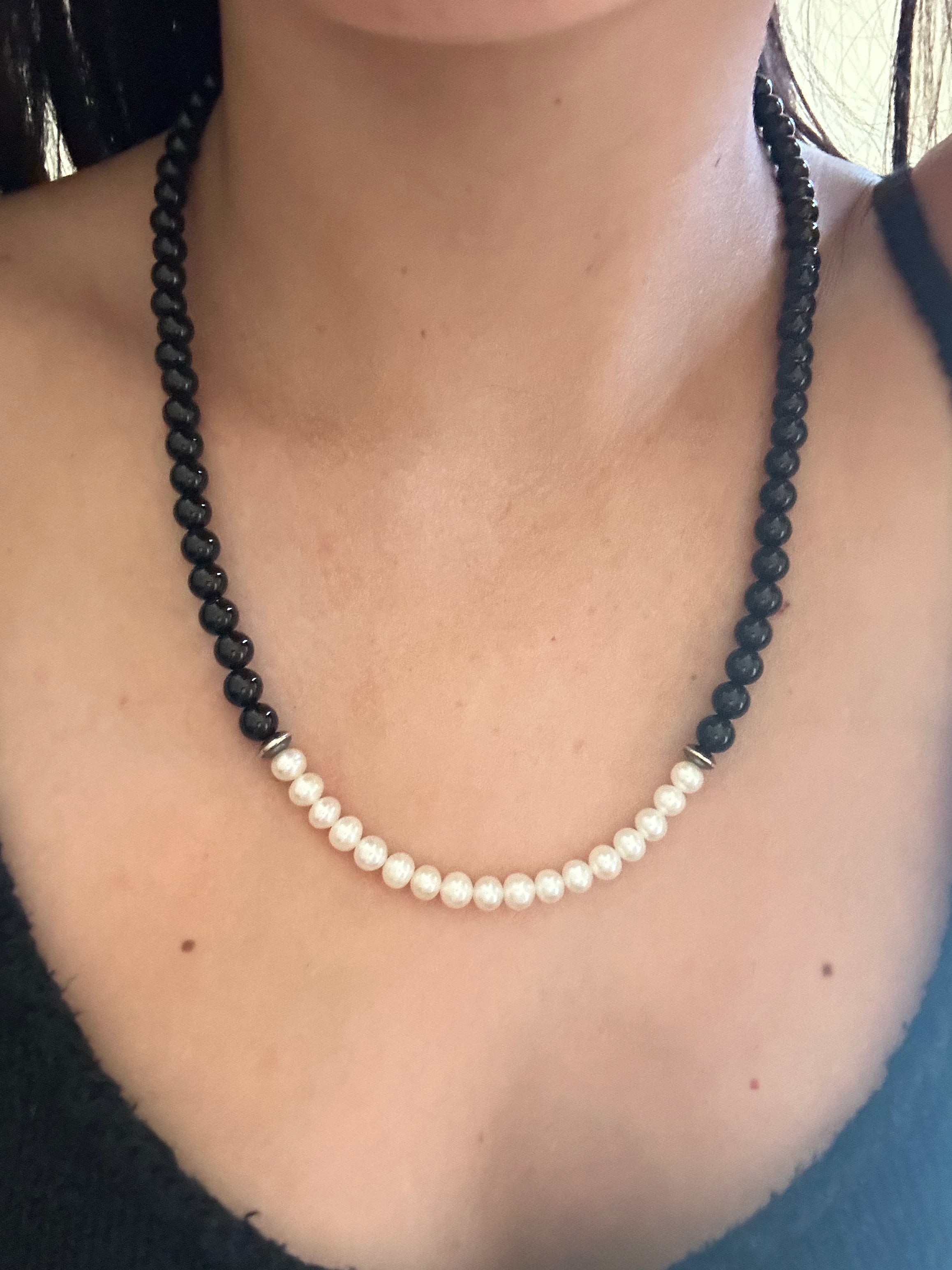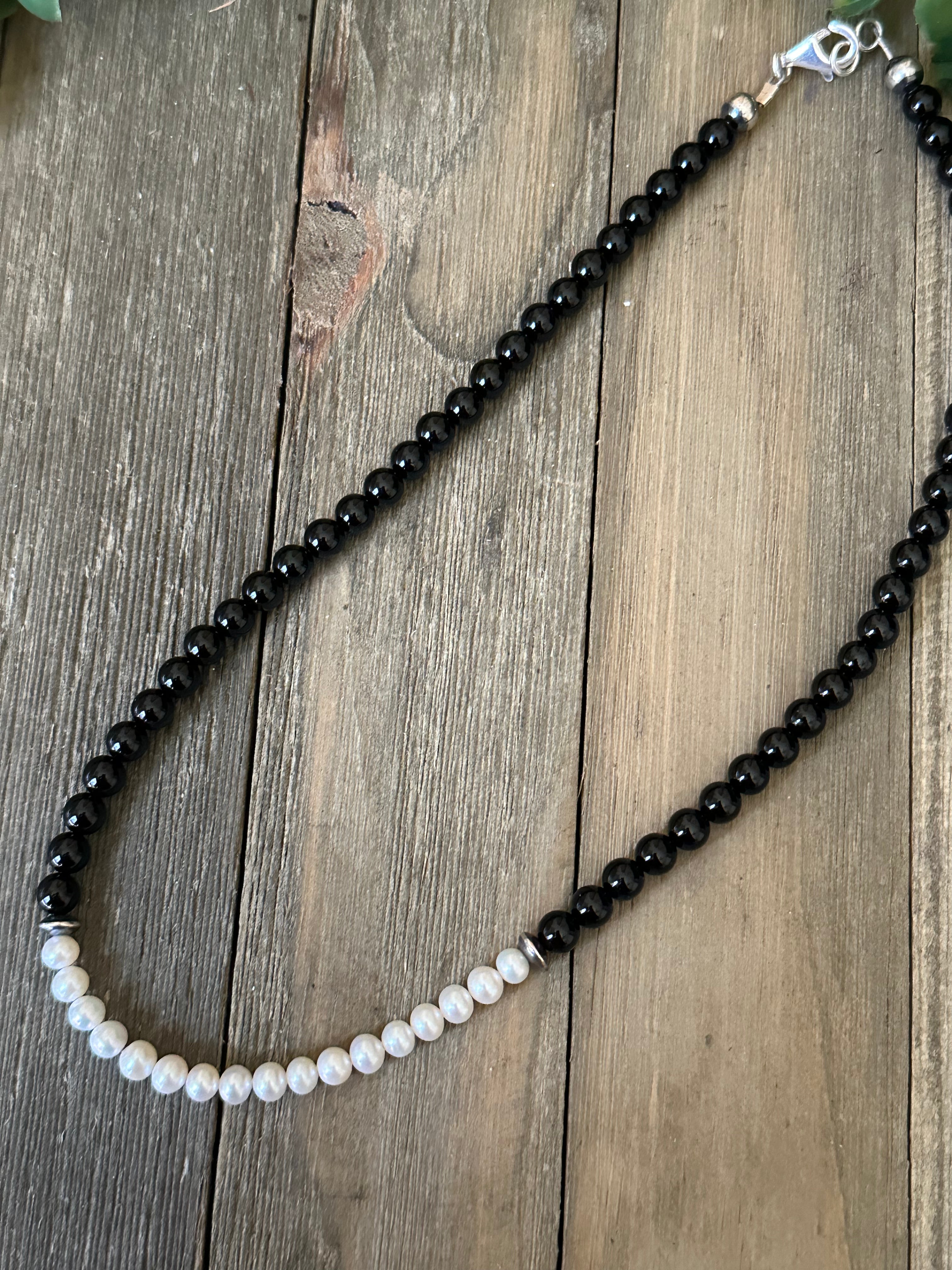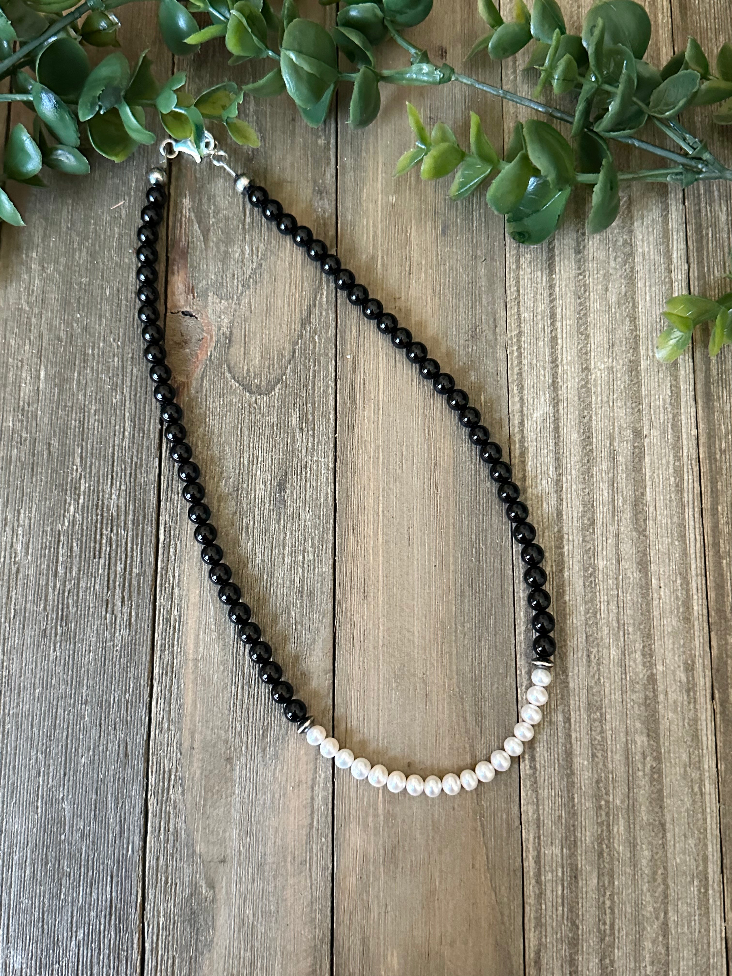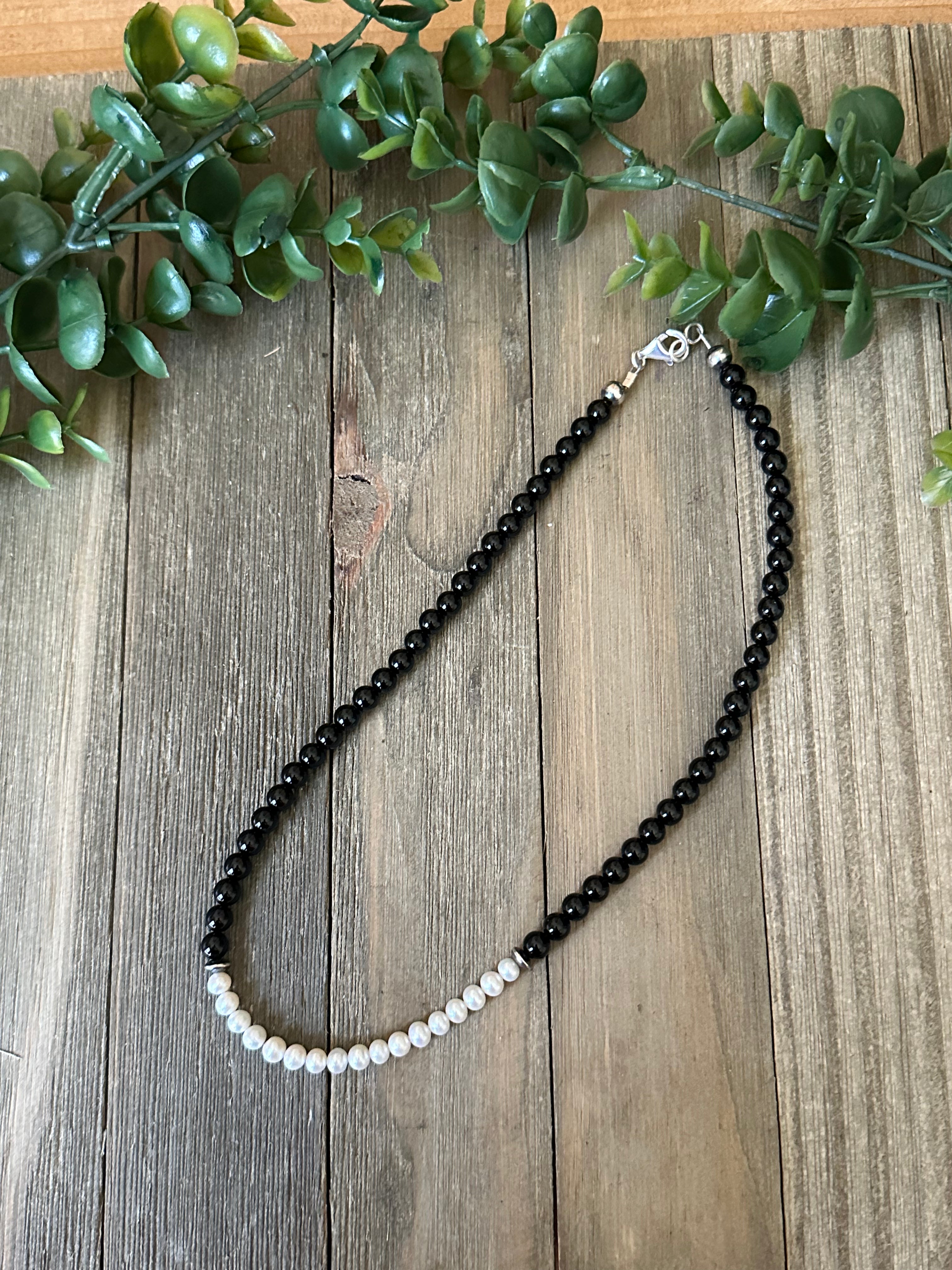 Navajo Strung Onyx & Fresh Wayer Pearls & Sterling Silver Beaded Necklace. It measures 20 inches long.
