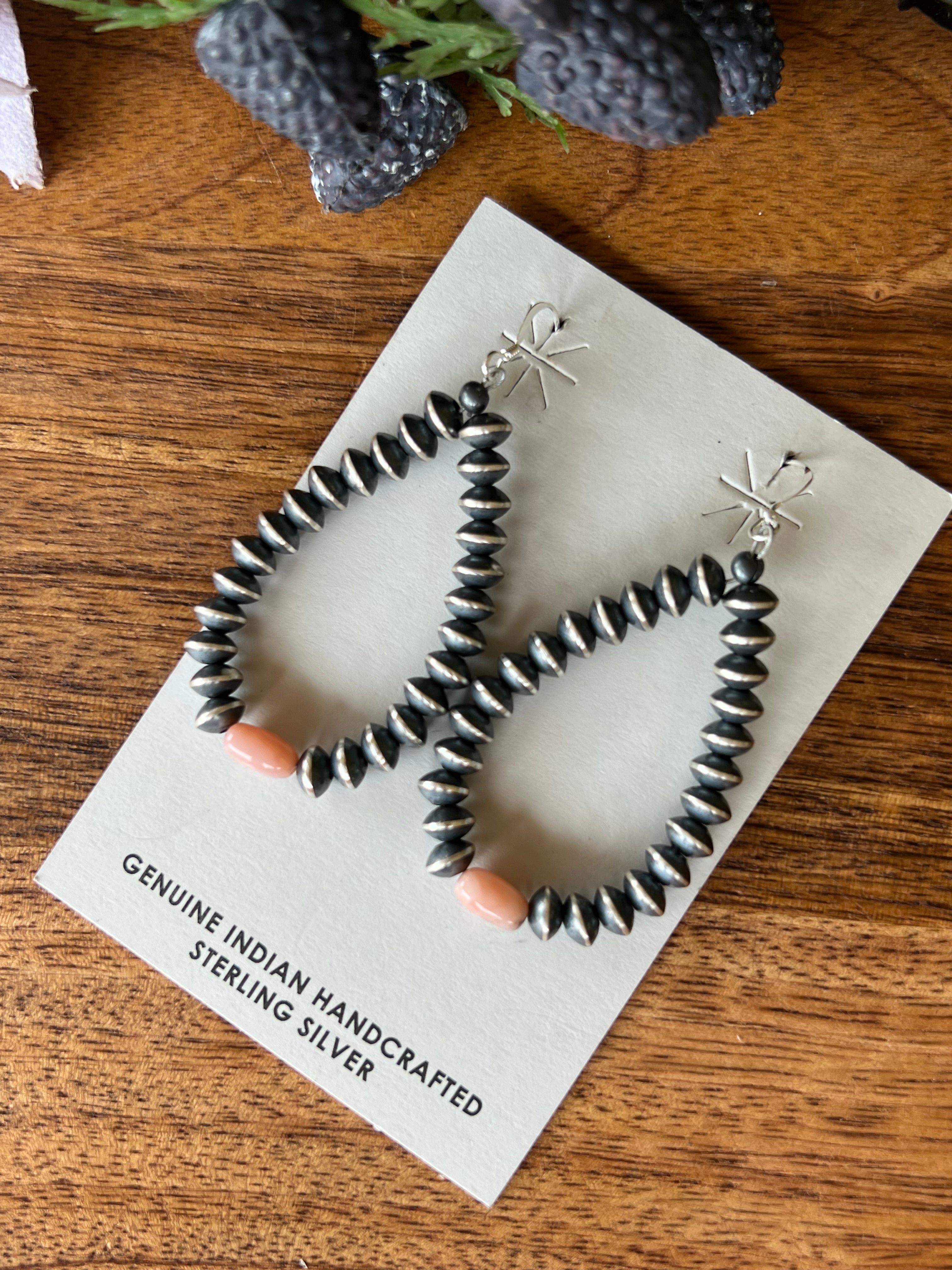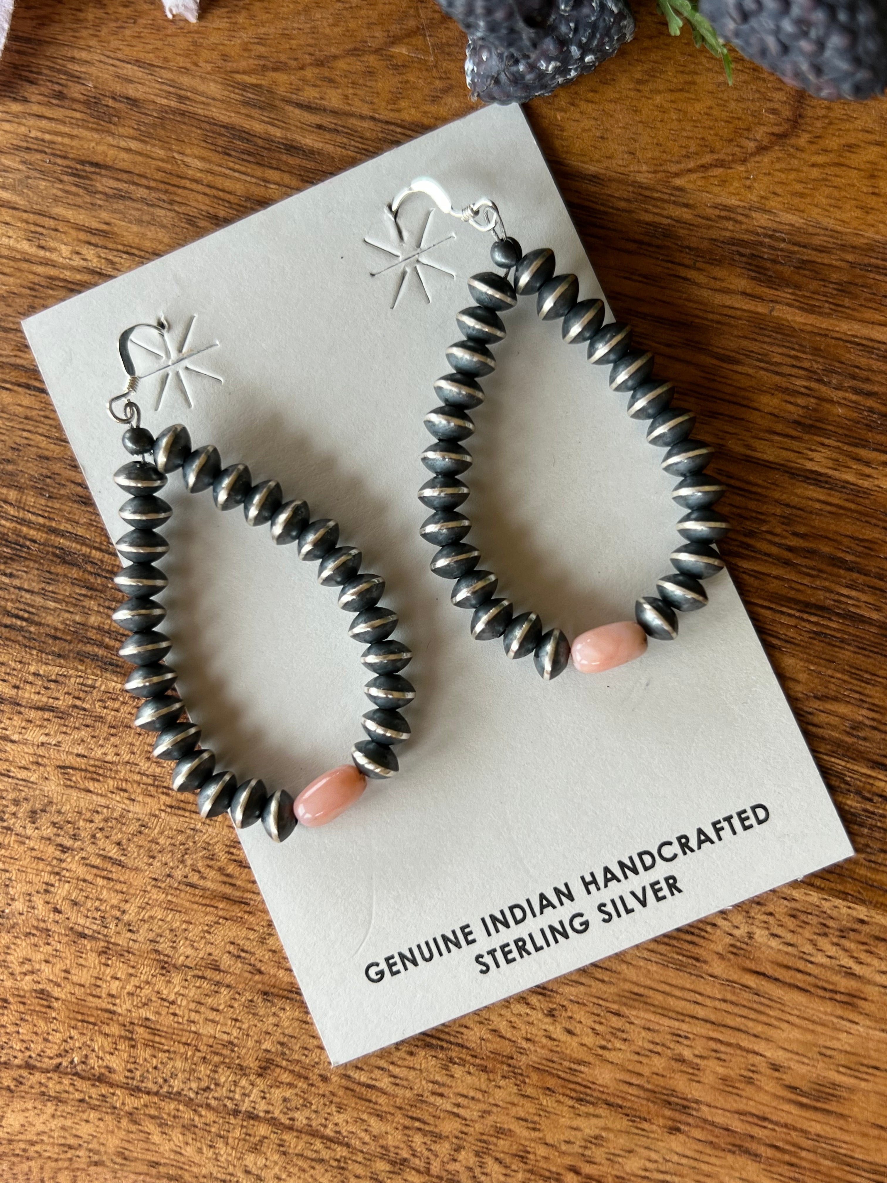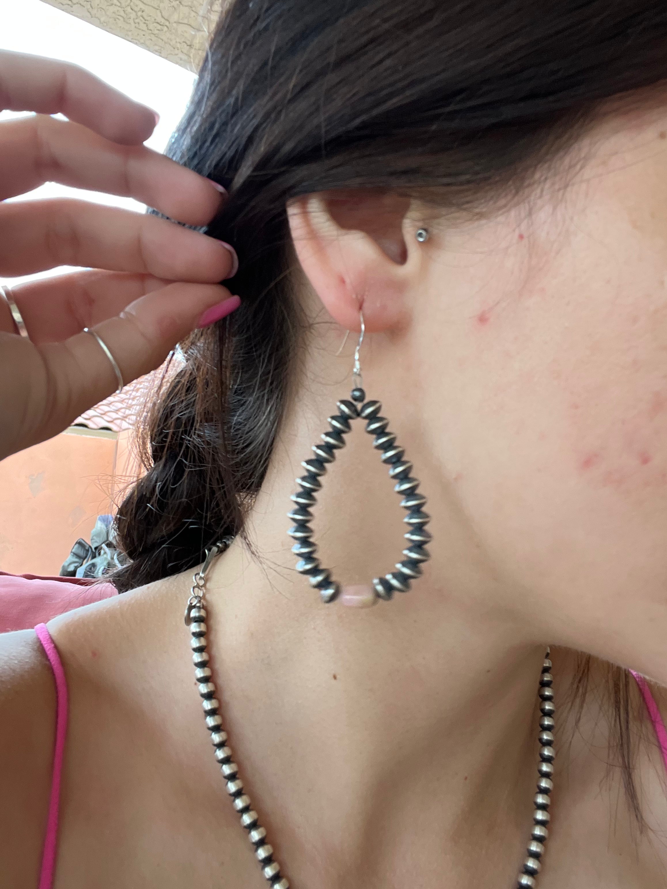 Navajo Strung Pink Peruvian Opal & Sterling Silver Pearl Dangles. It measures just under 2 inches long and 1 1/8 inches wide. Signed by artist and stamped sterling silver.