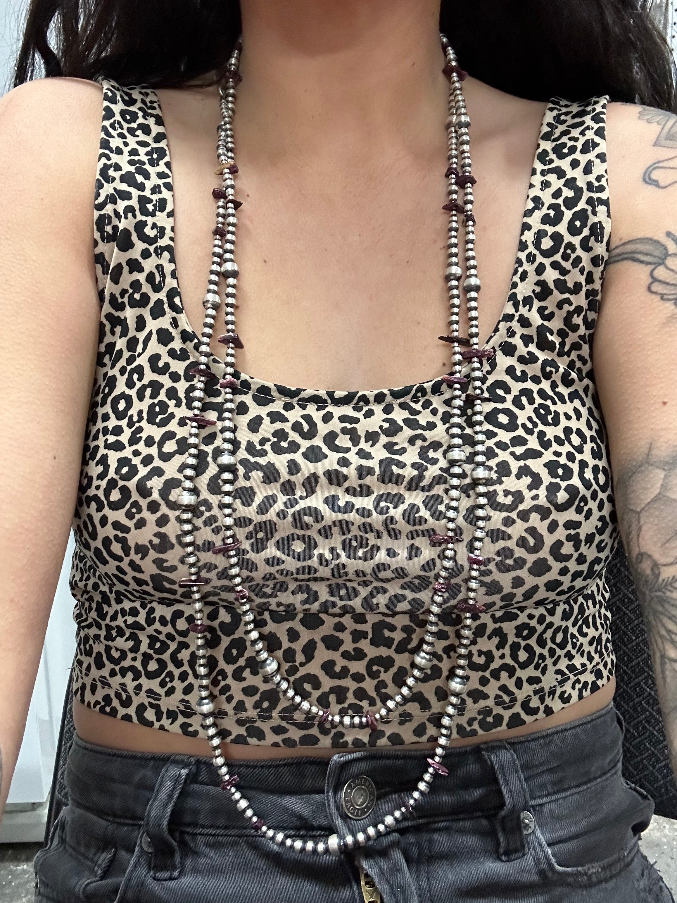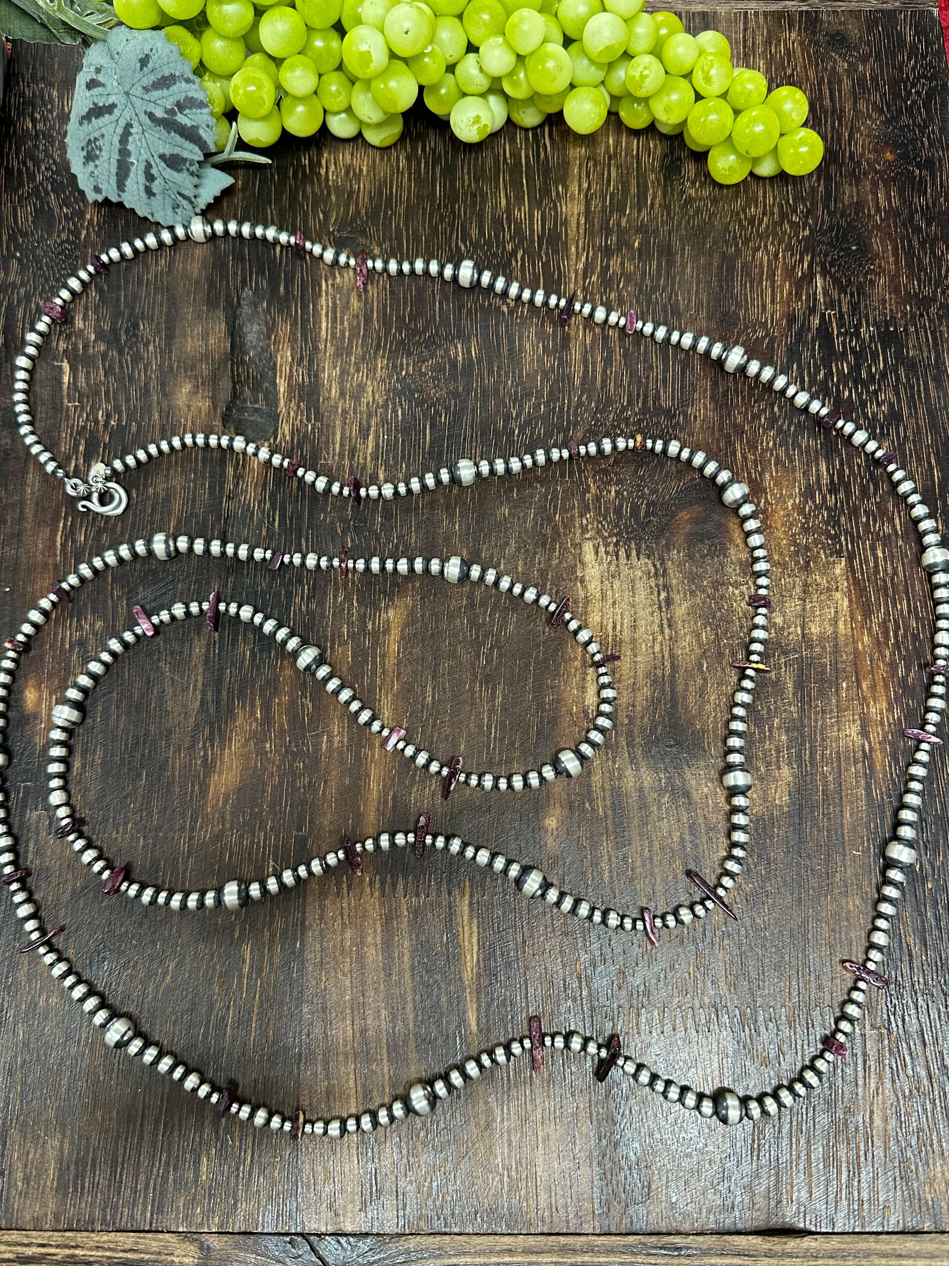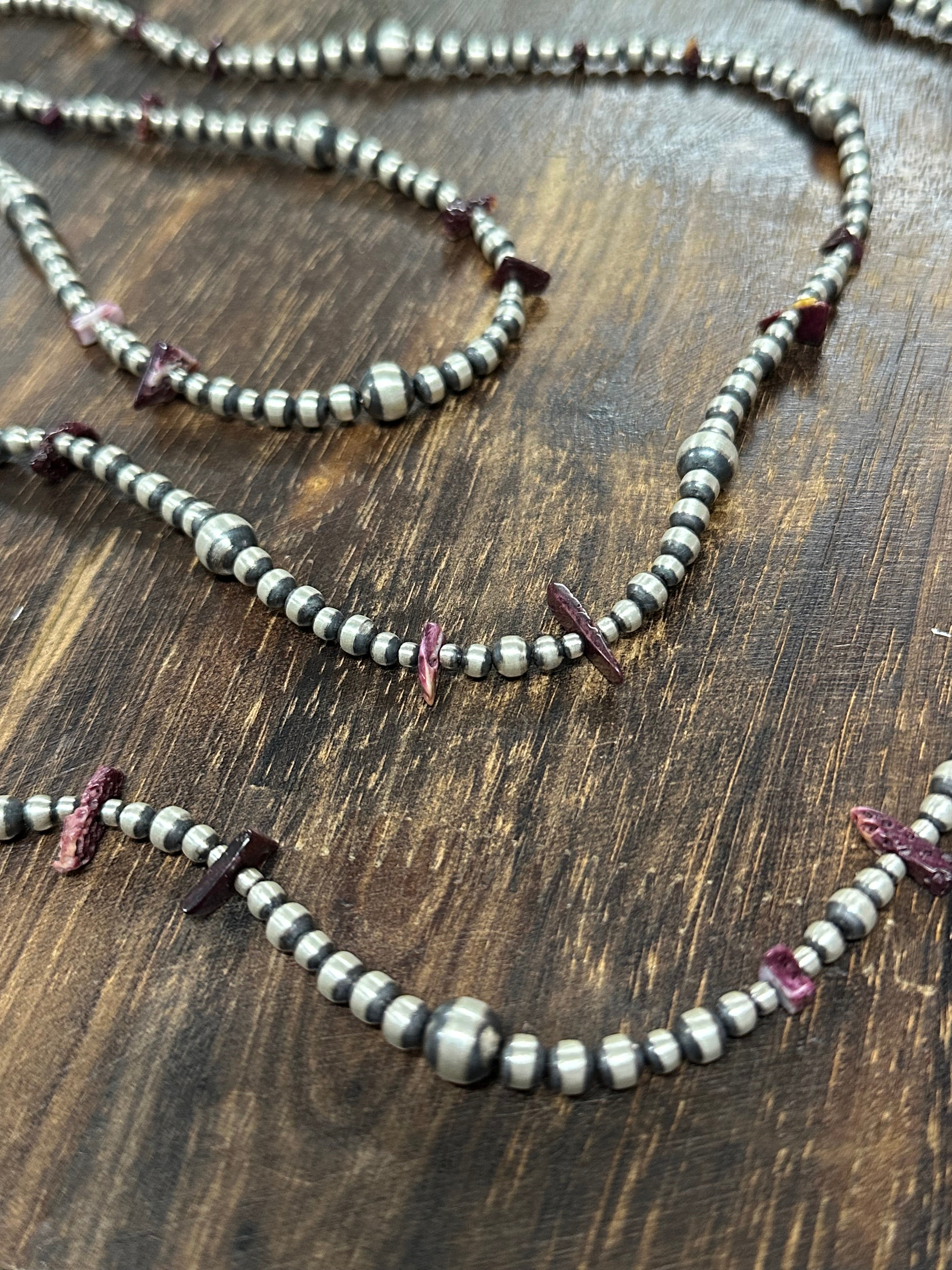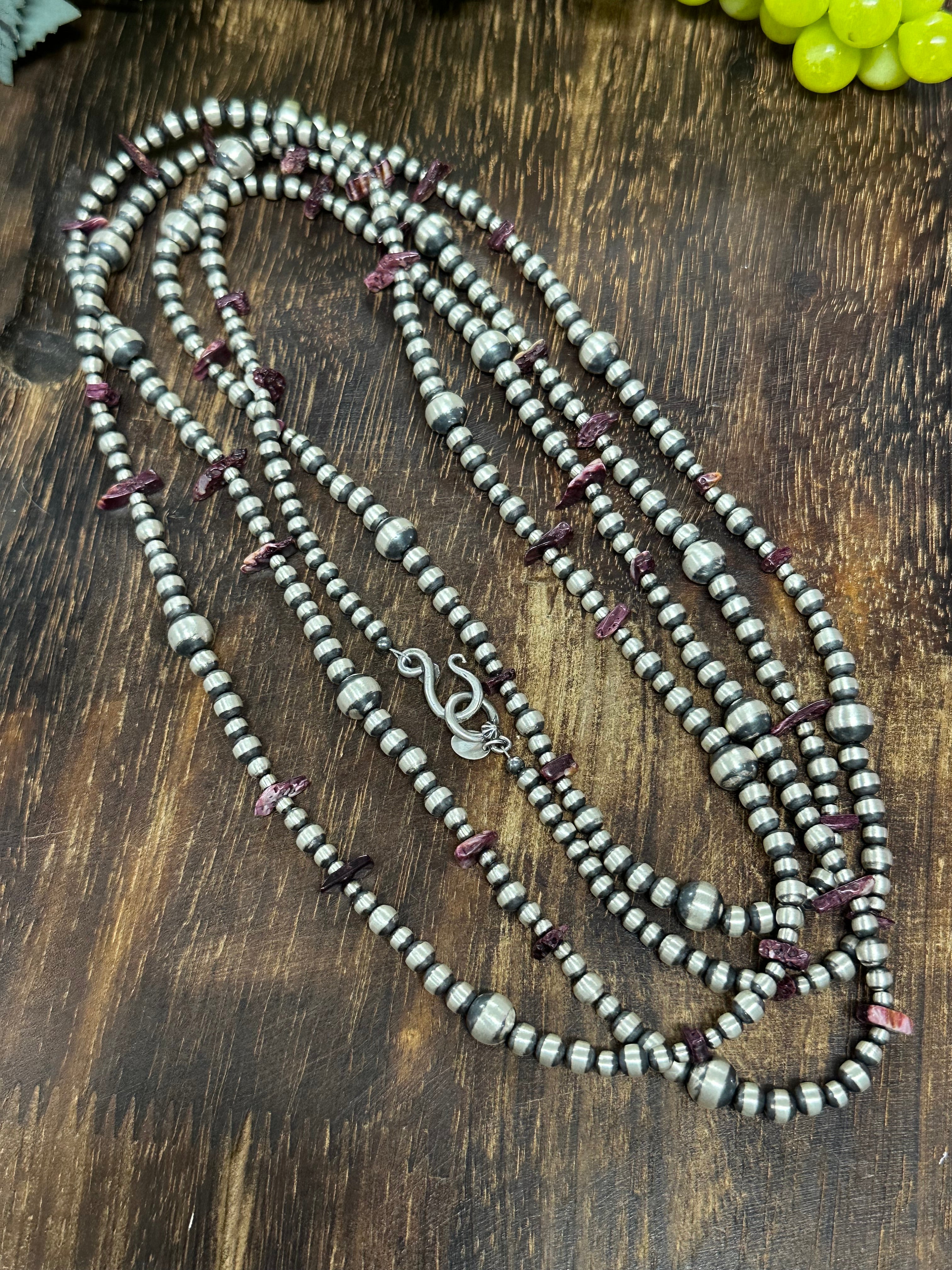Navajo Strung Purple Spiny Oyster & Sterling Silver Pearls Beaded Necklace. It measure 72 inches long. Single Stranded Necklace.