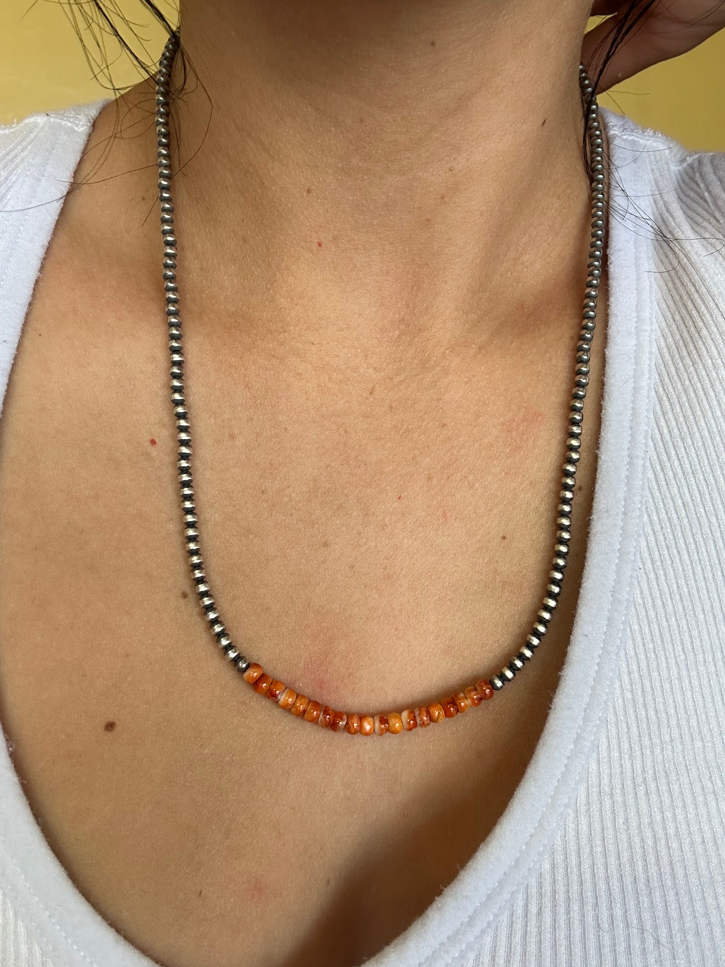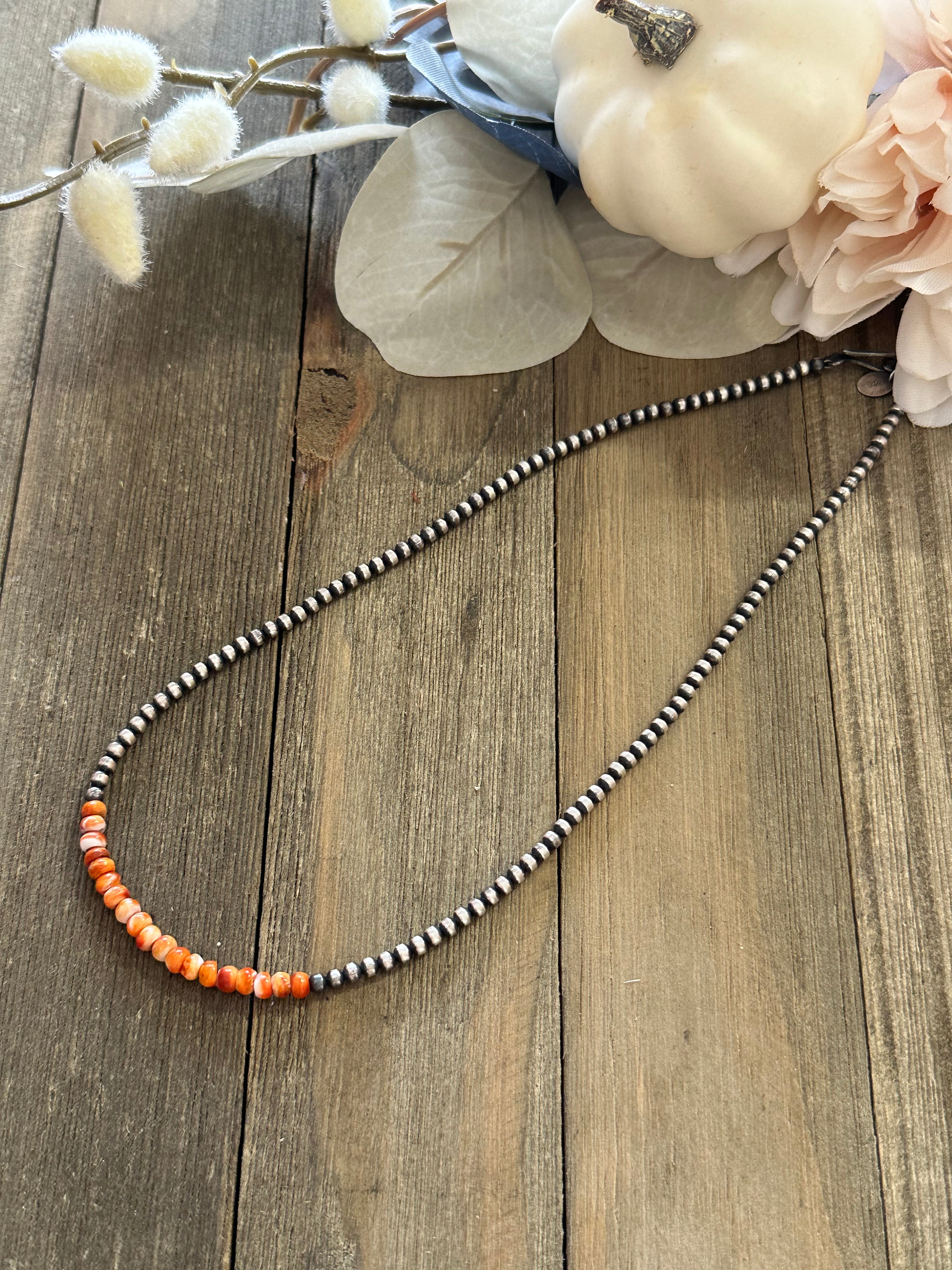 Navajo Strung Spiny Oyster & Sterling Silver Pearls Beaded Necklace. It measures 20 inches long. Stones will differ due to natural stones.