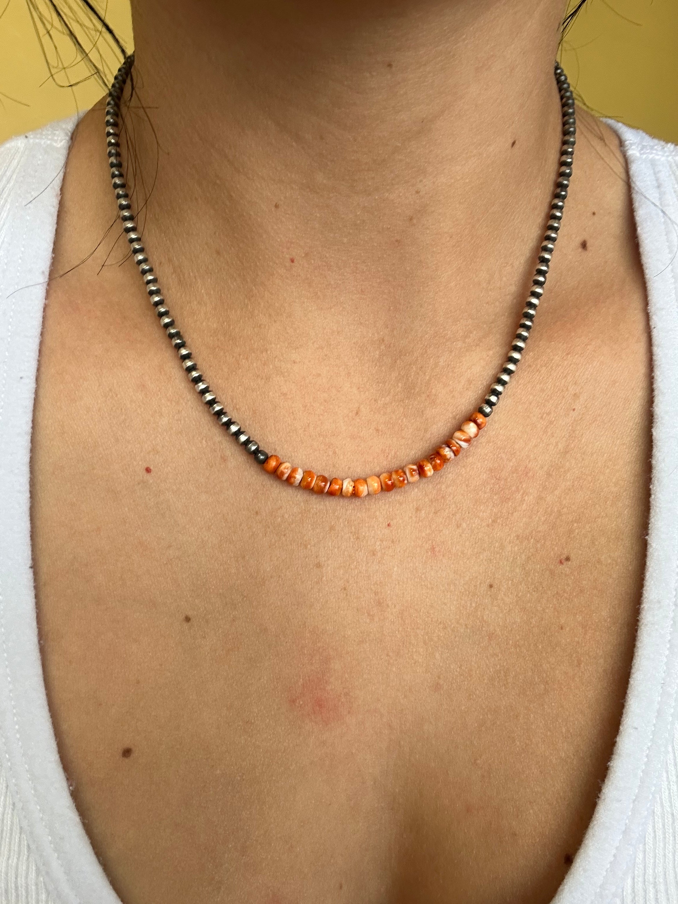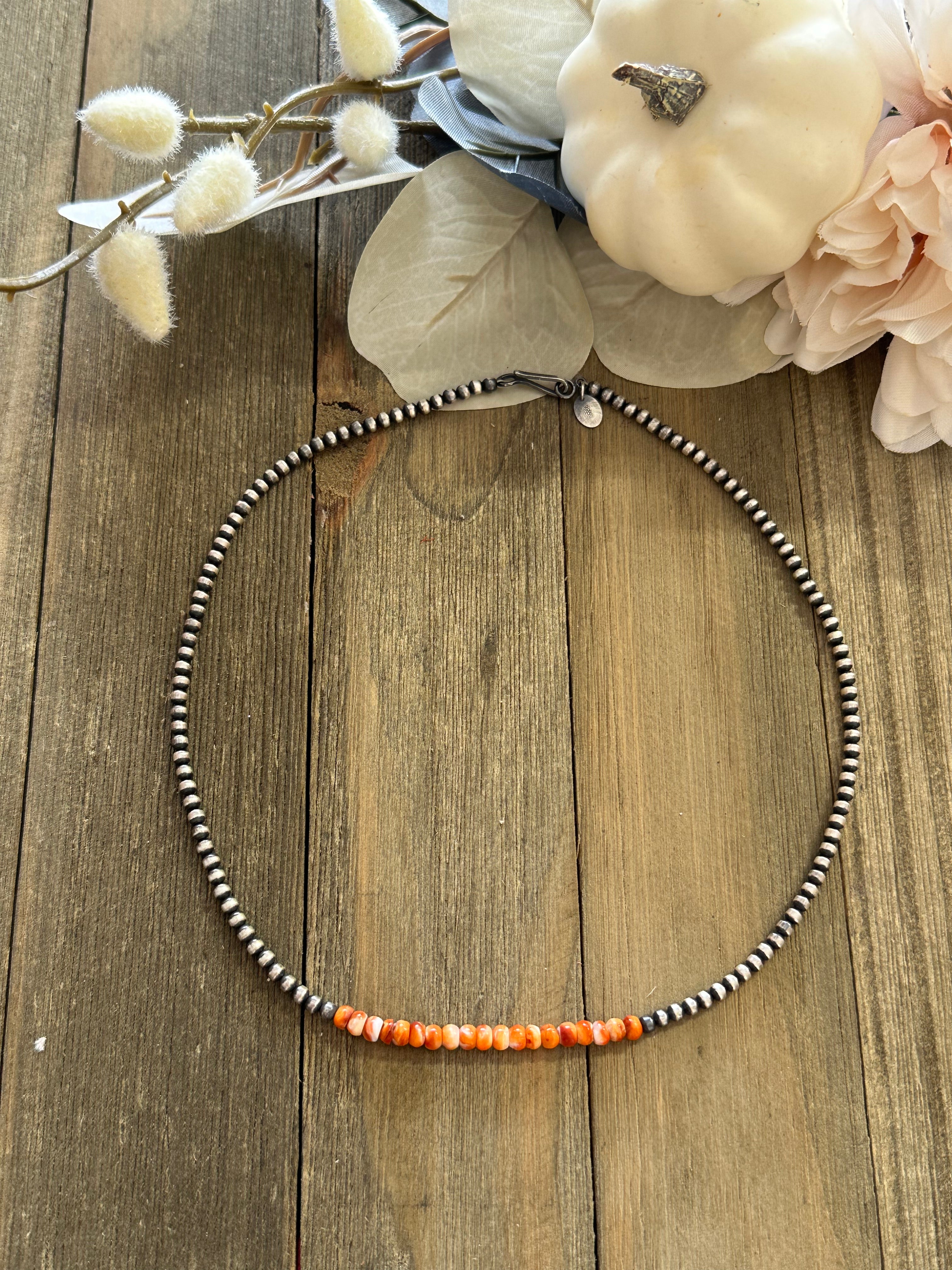 Navajo Strung Spiny Oyster & Sterling Silver Pearls Beaded Necklace. It measures 16 inches long. Stones will differ due to natural stones.