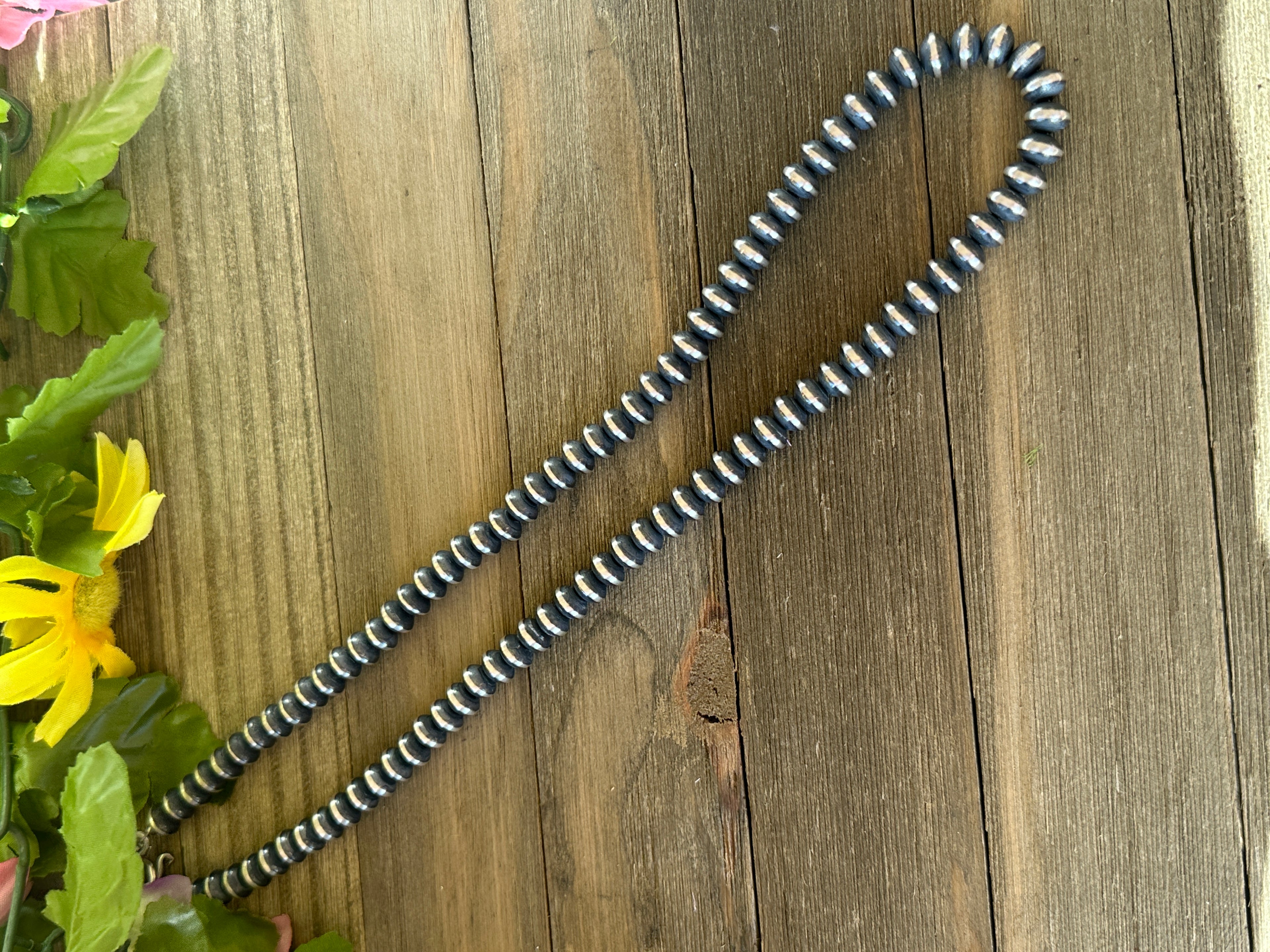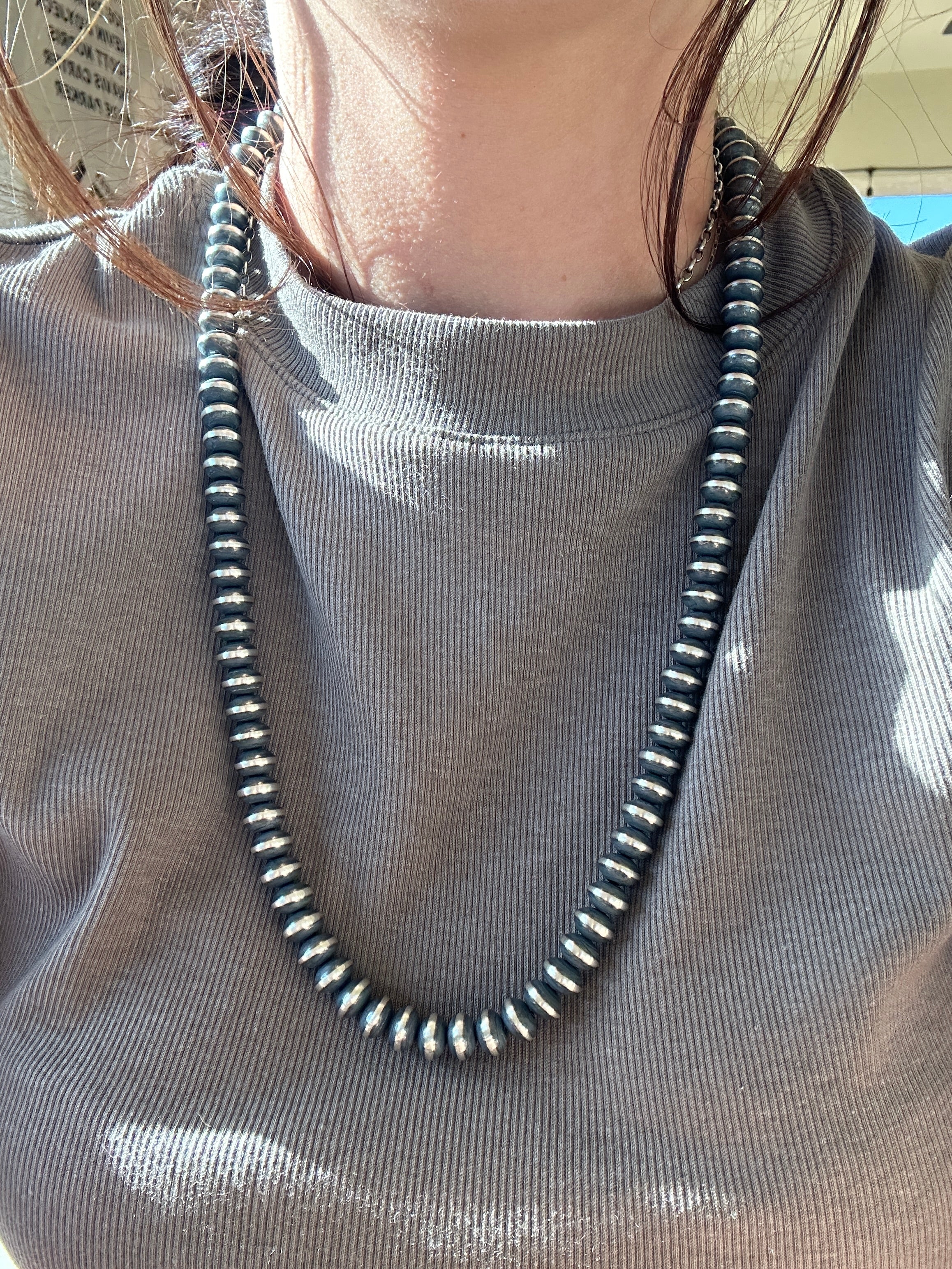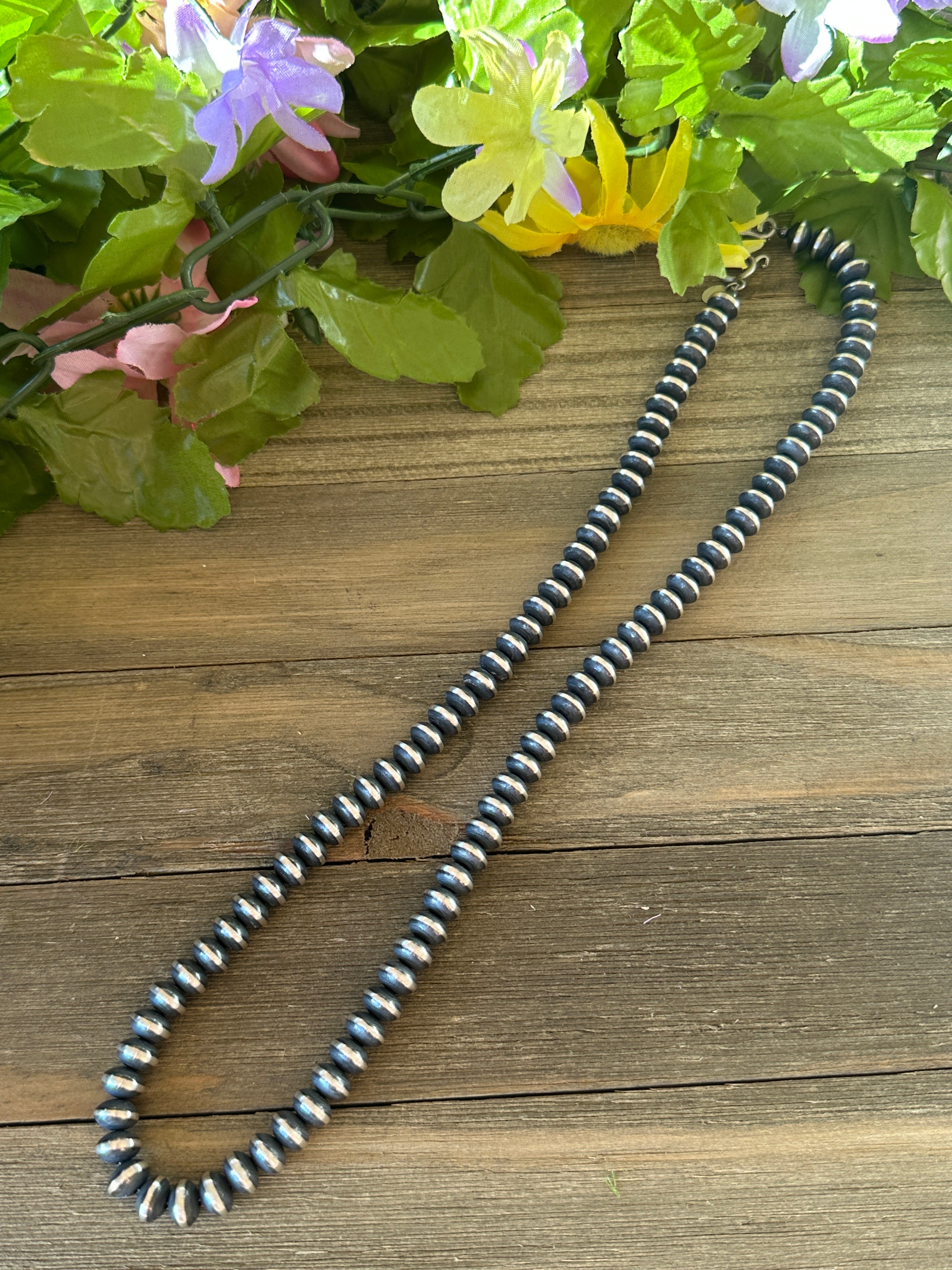 Navajo Strung Sterling Silver 9 MM Saucer Pearl Necklace. They measure 24 inches long. Stamped sterling silver.