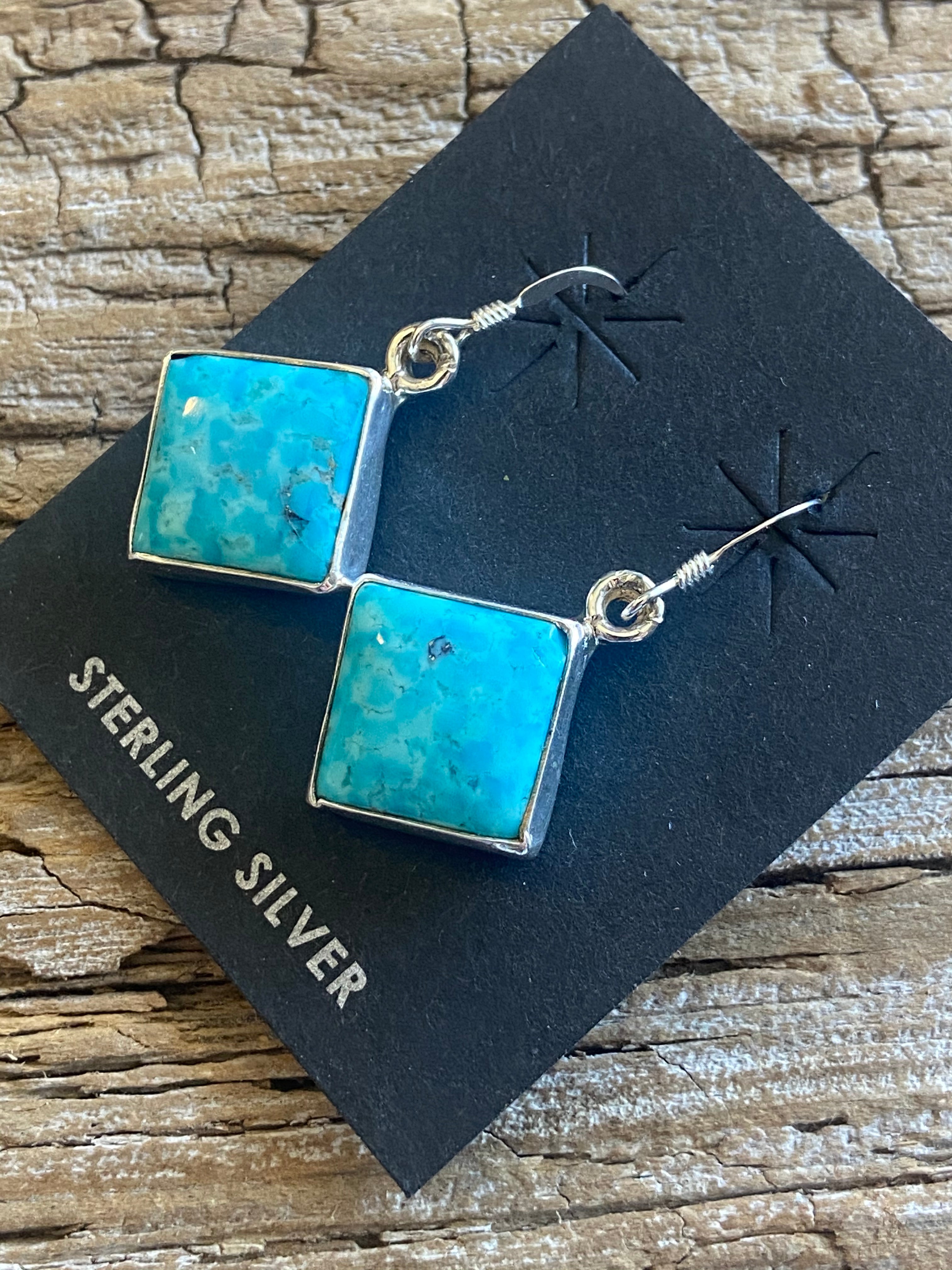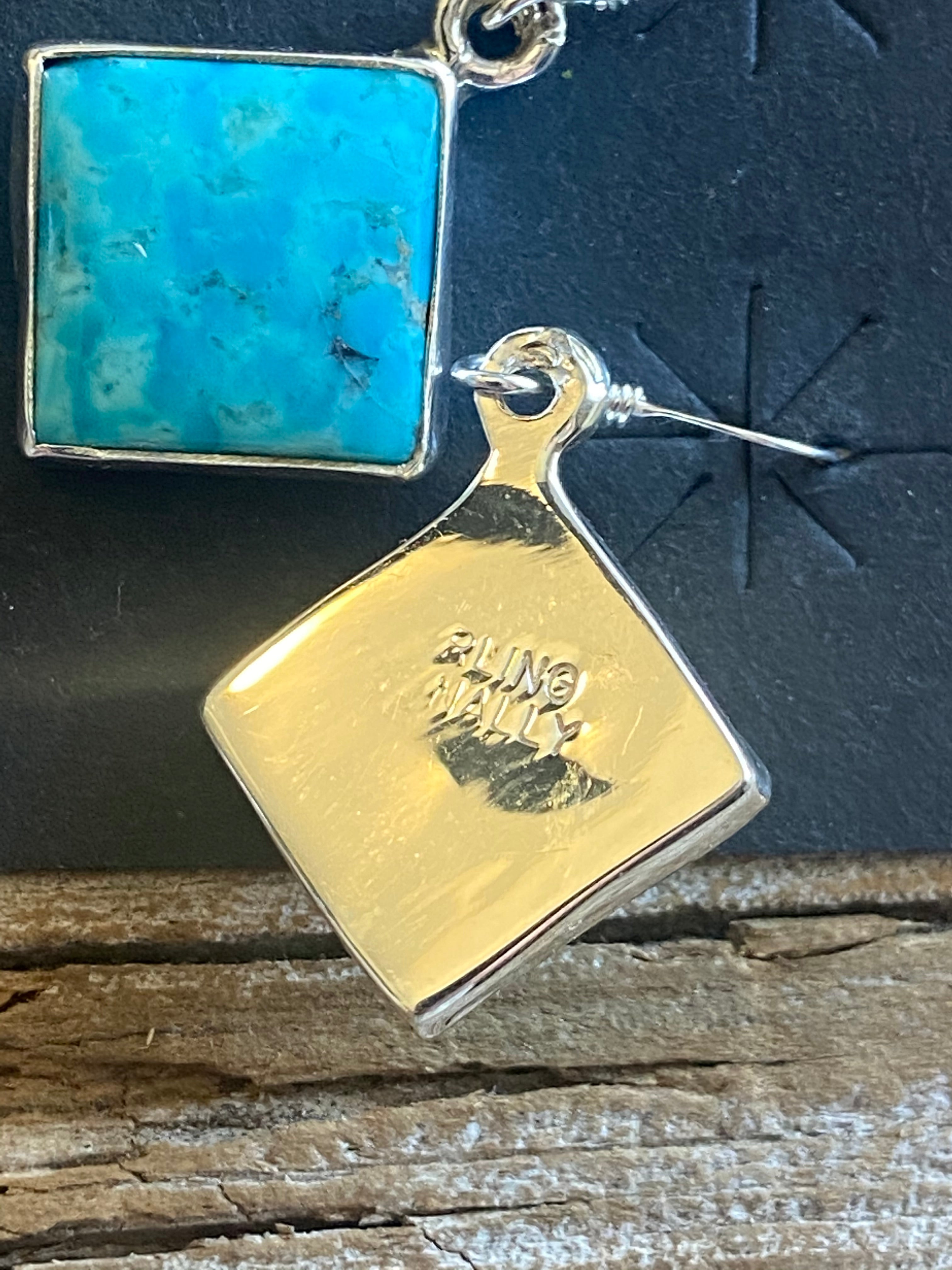 Navajo Turquoise & Sterling Silver Dangles. It measures 1 1/4 inches long and 5/8 of an inch wide. Signed by the artist and stamped sterling.