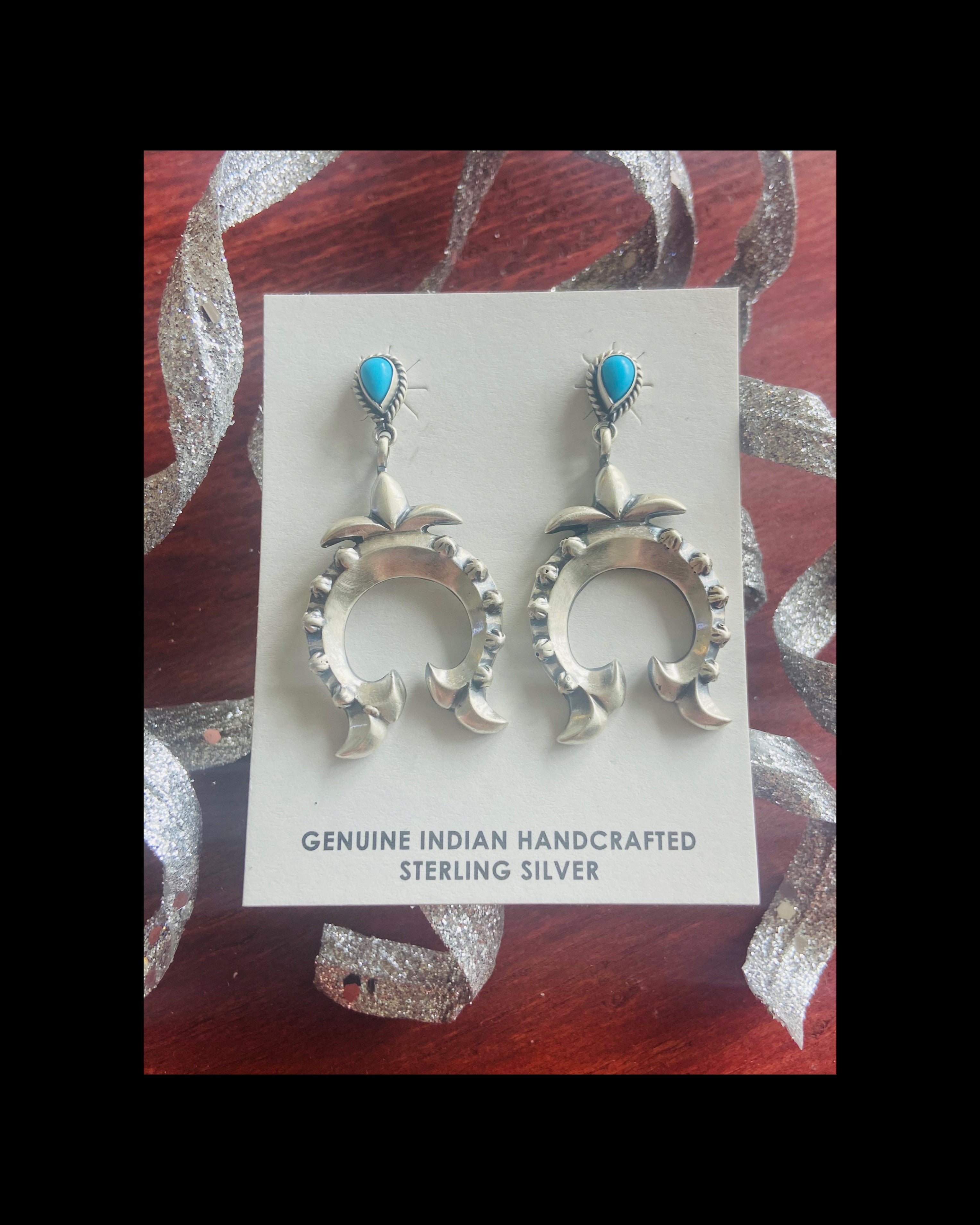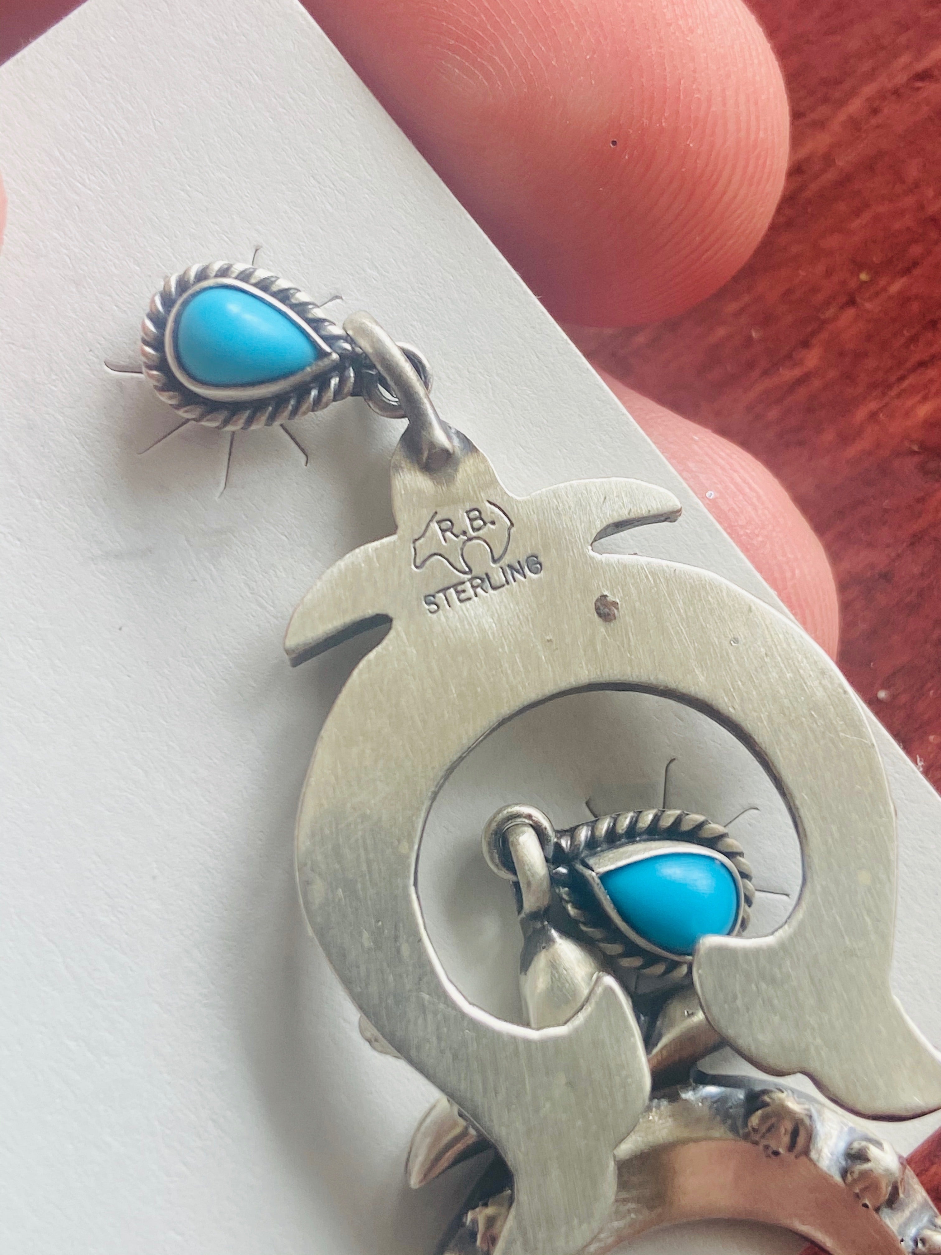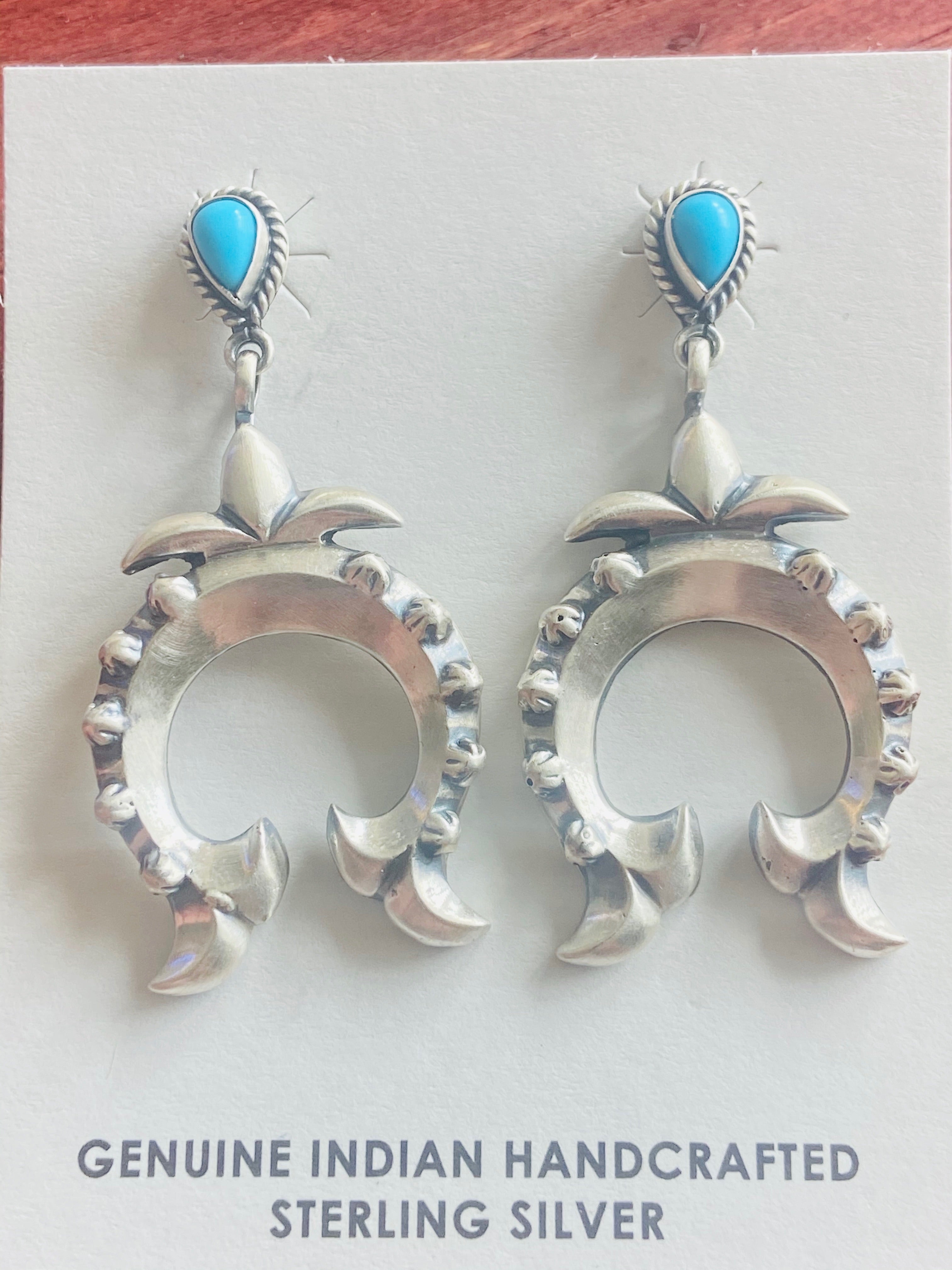 Navajo Turquoise & Sterling Silver Naja Dangles. They measure 1 7/8 inches long and 1 inch wide. Signed by the artist and stamped sterling silver.