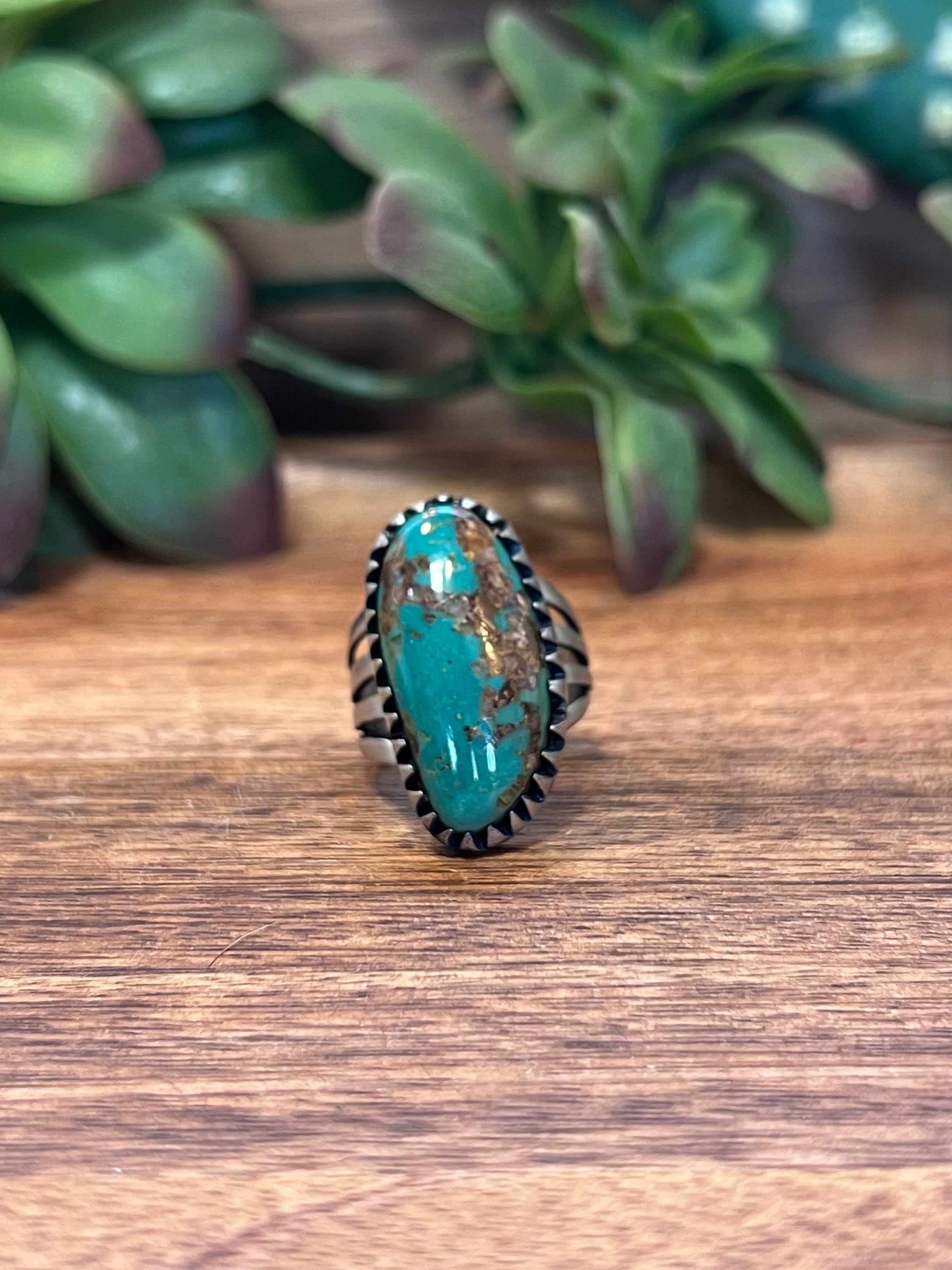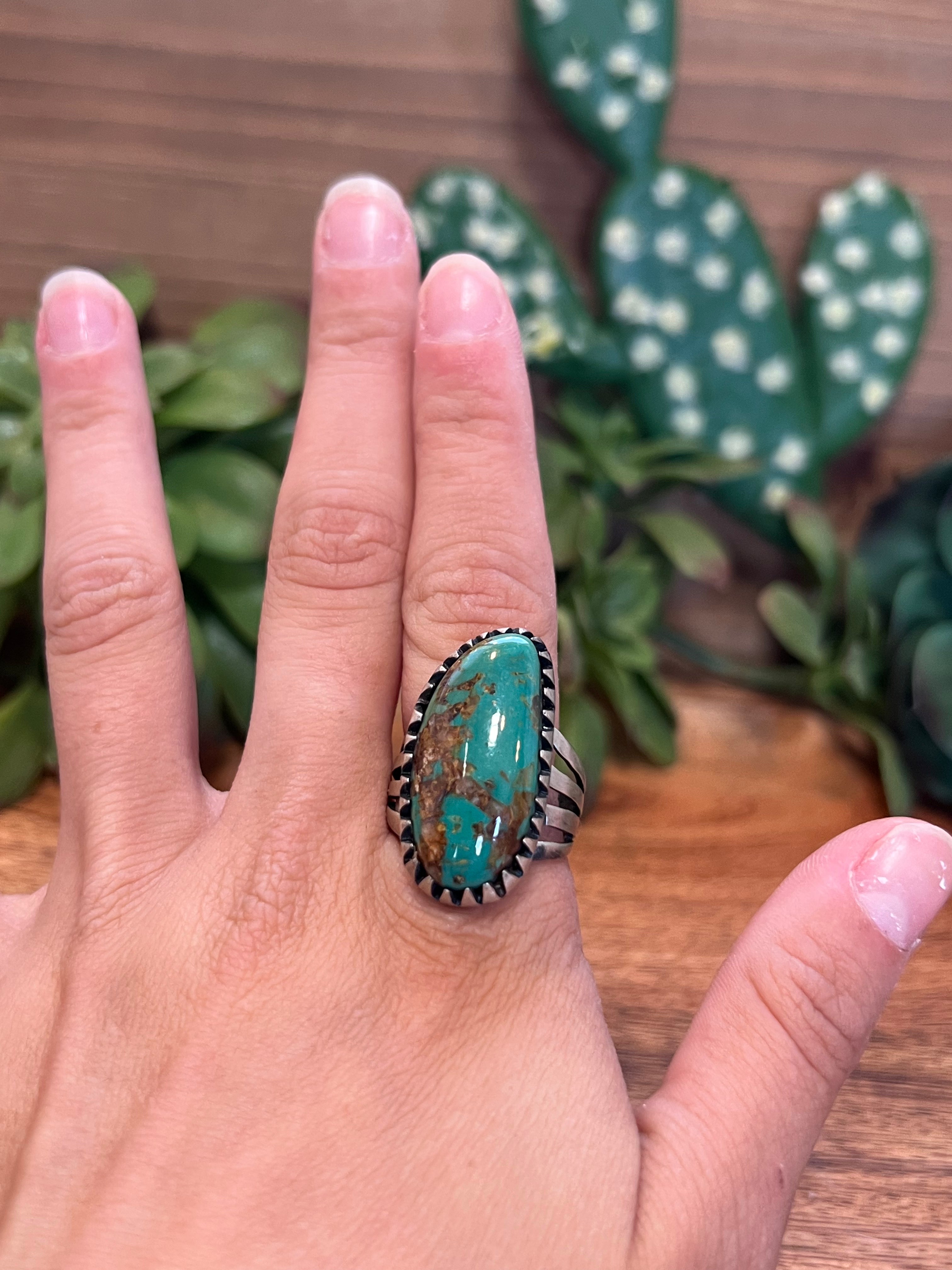 Navajo Turquoise & Sterling Silver Ring Size 9. It measures 1 1/4 inches long & just over 1/2 of an inch wide. Signed by the artist and stamped sterling.