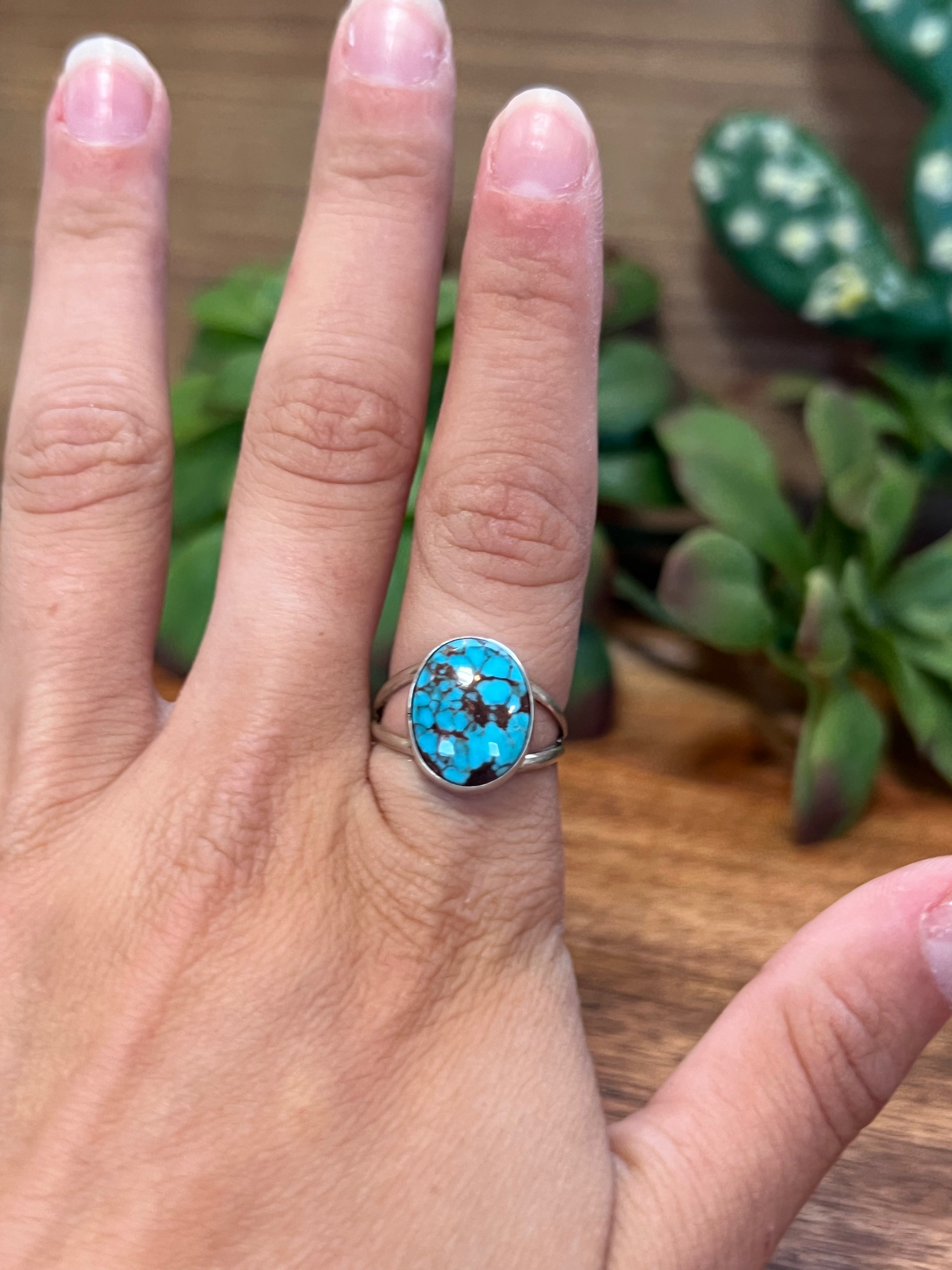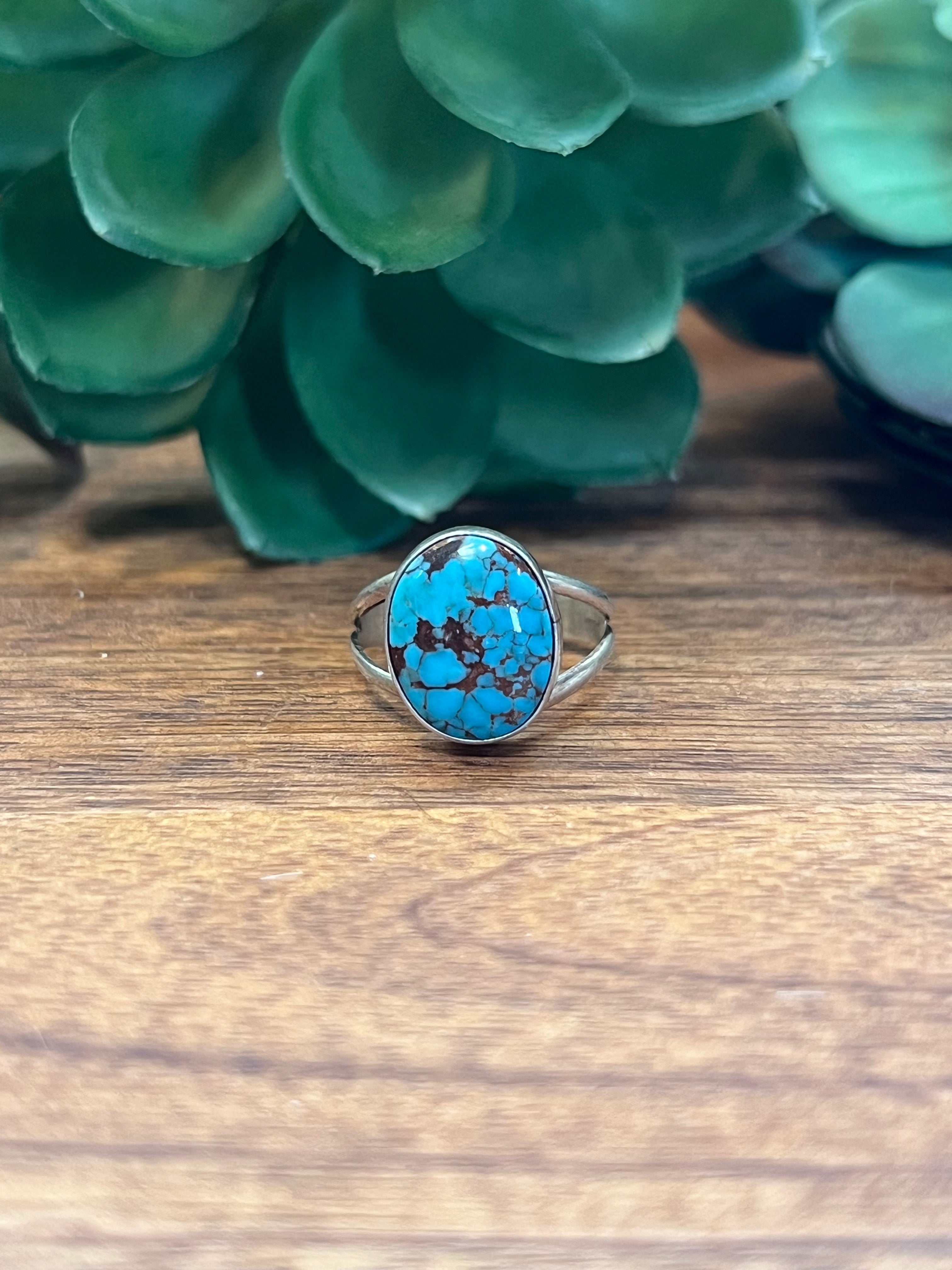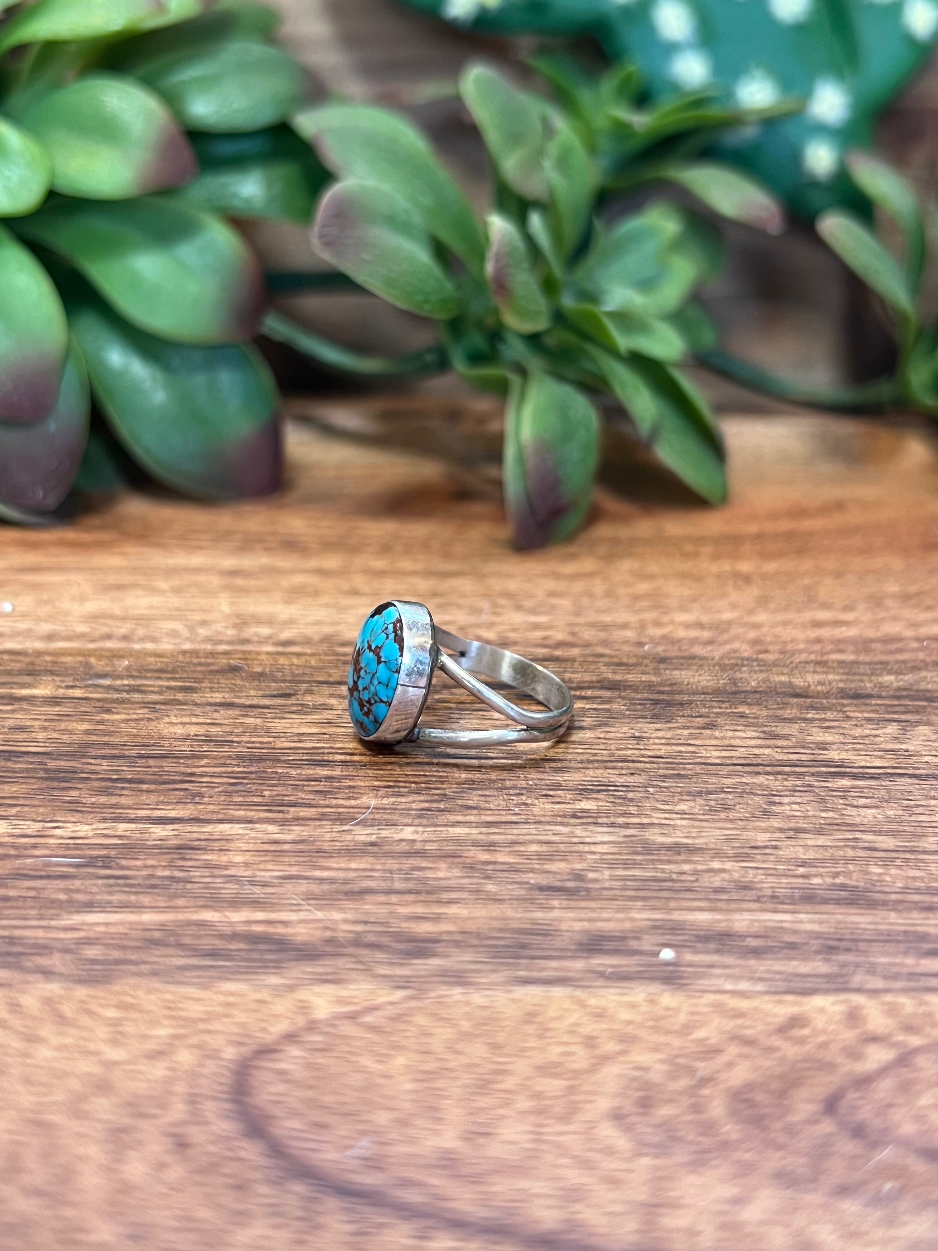 Navajo Turquoise & Sterling Silver Ring Size 6. It measures 1/2 of an inch long and just over 3/8 of an inch wide. Signed by the artist and stamped sterling.