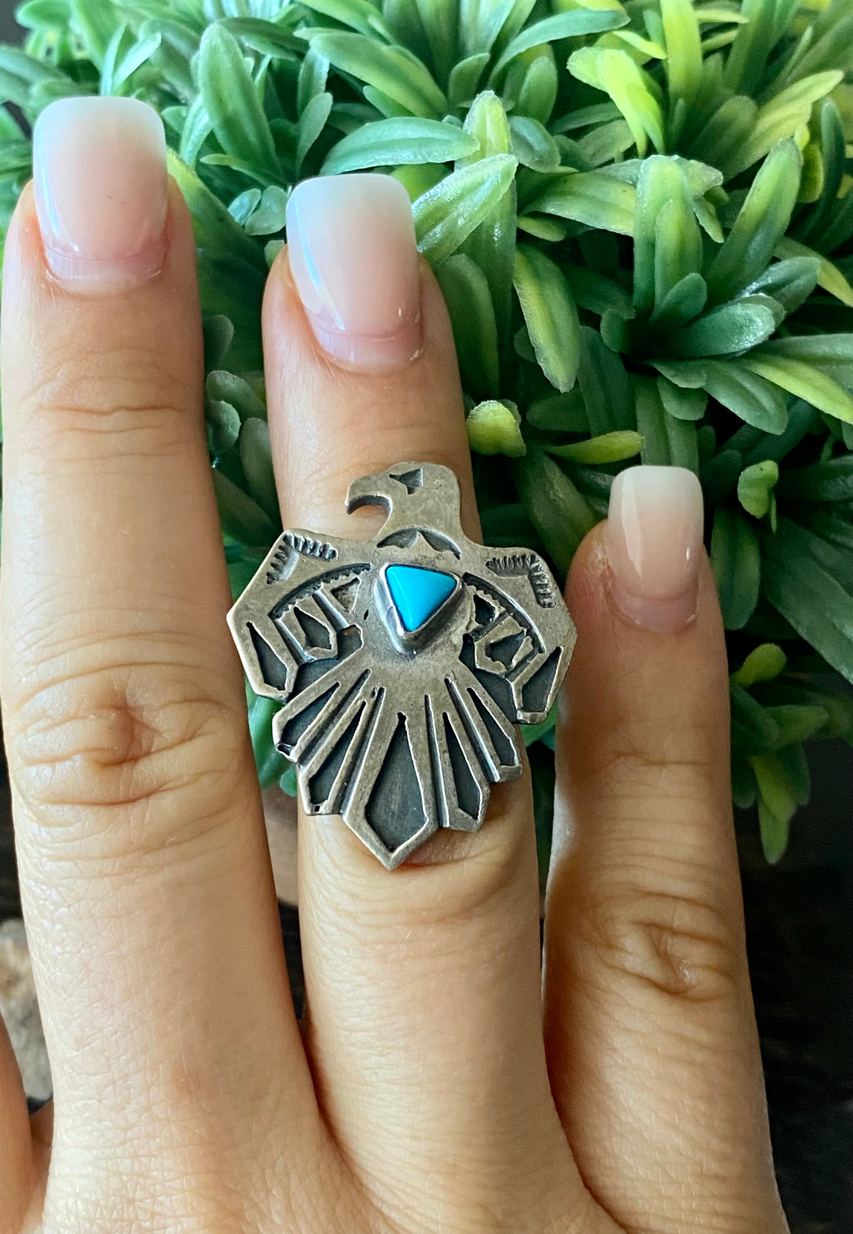 Navajo Turquoise & Sterling Silver Thunderbird Ring Size 5.5. It measures 1 1/4 inches long and 1 1/8 inches wide. Signed by the artist and stamped sterling.