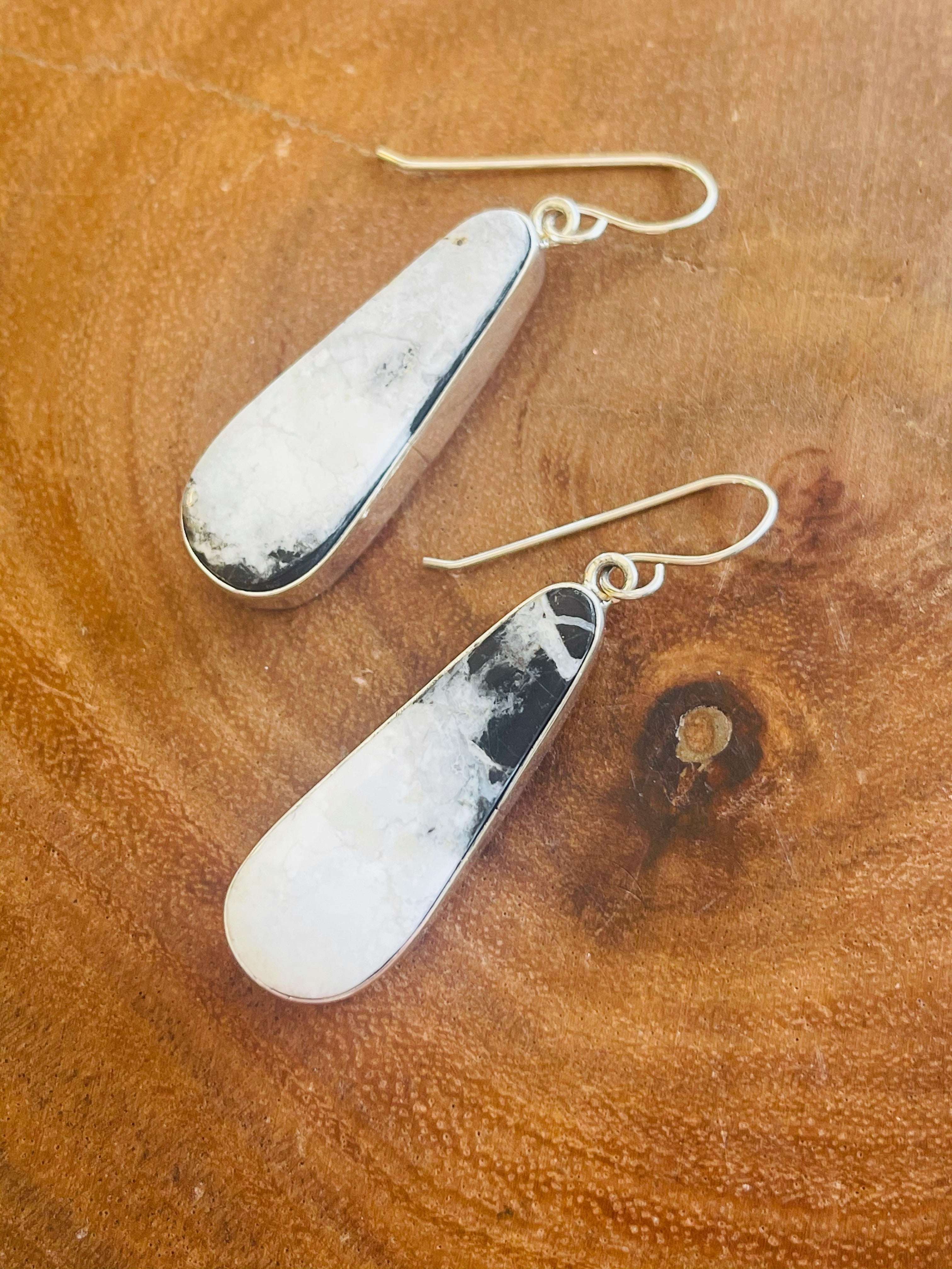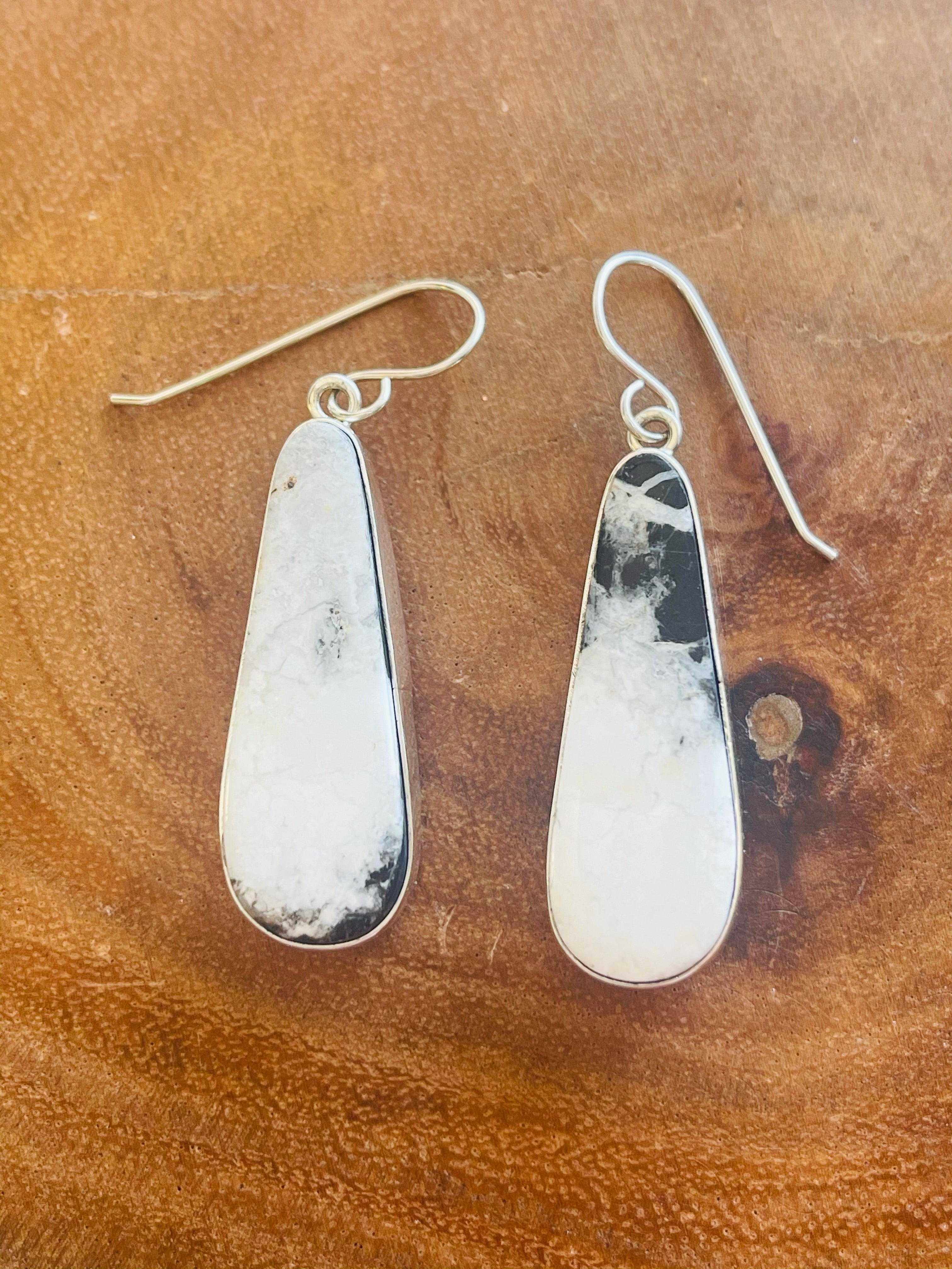 Navajo White Buffalo & Sterling Silver Dangles. They measure 2 inches long and 1/2 of an inch wide. Signed by the artist and stamped sterling silver.