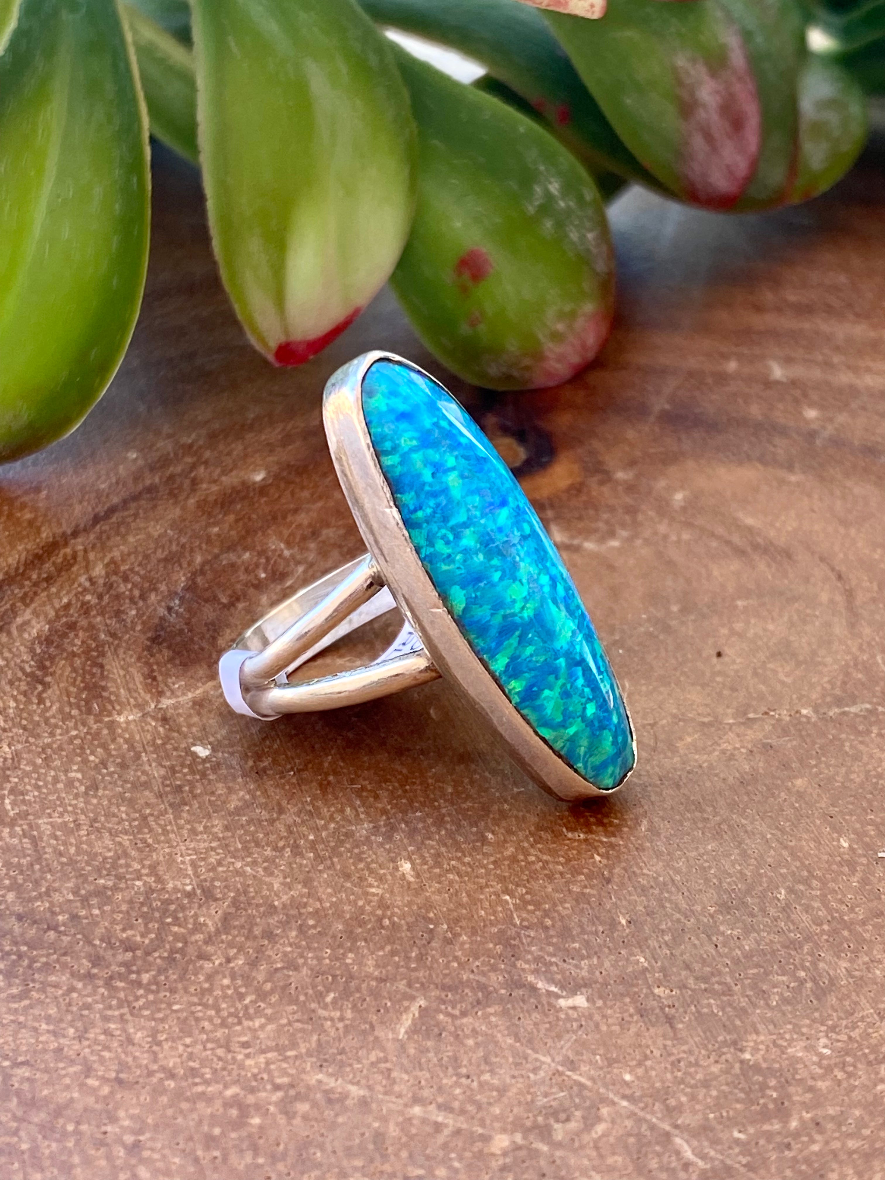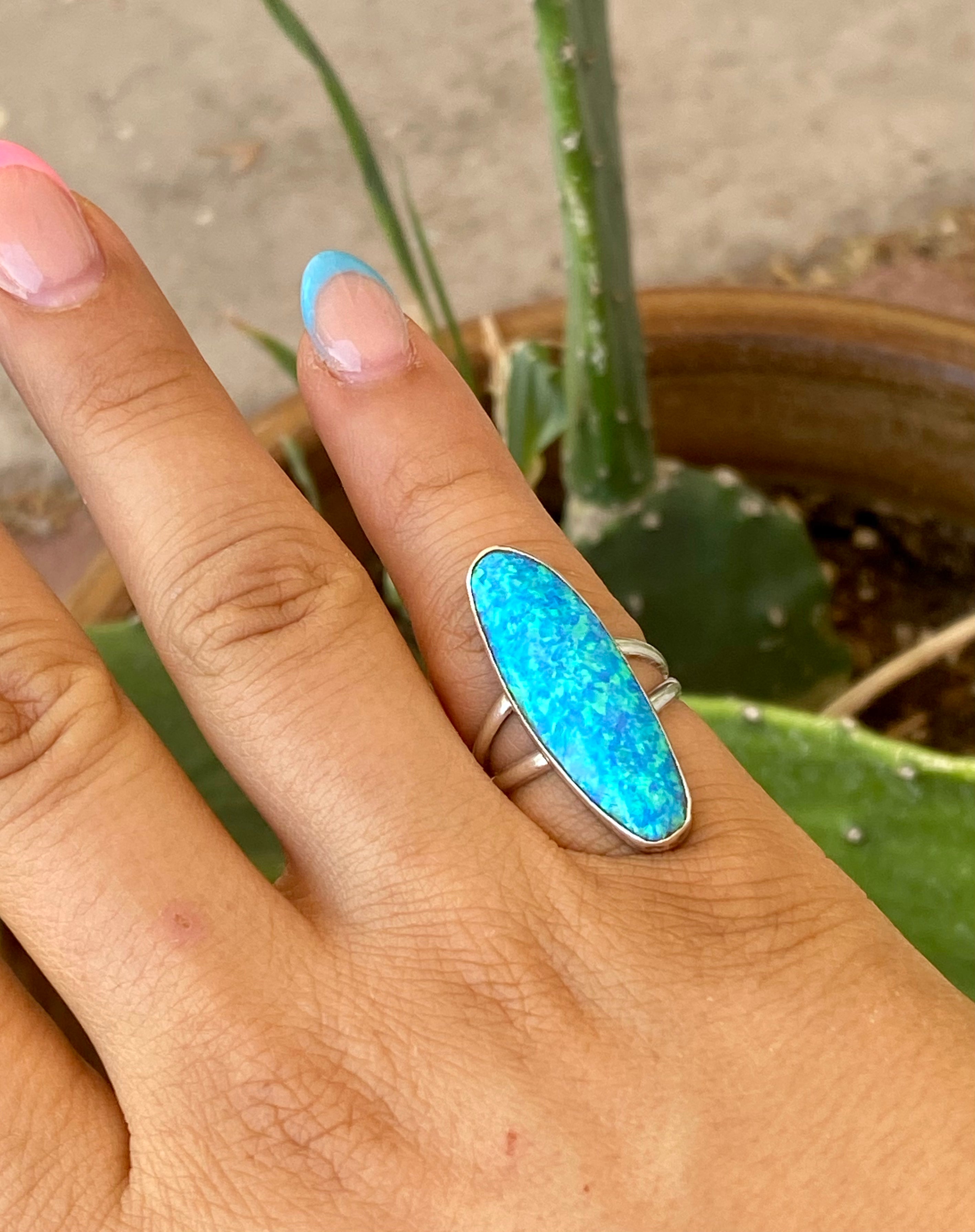 Nelson Wood Blue Opal & Sterling Silver Ring Size 7.5. It measures just over 1 1/8 inches long and 3/8 of an inch wide. Signed by the artist and stamped sterling silver.