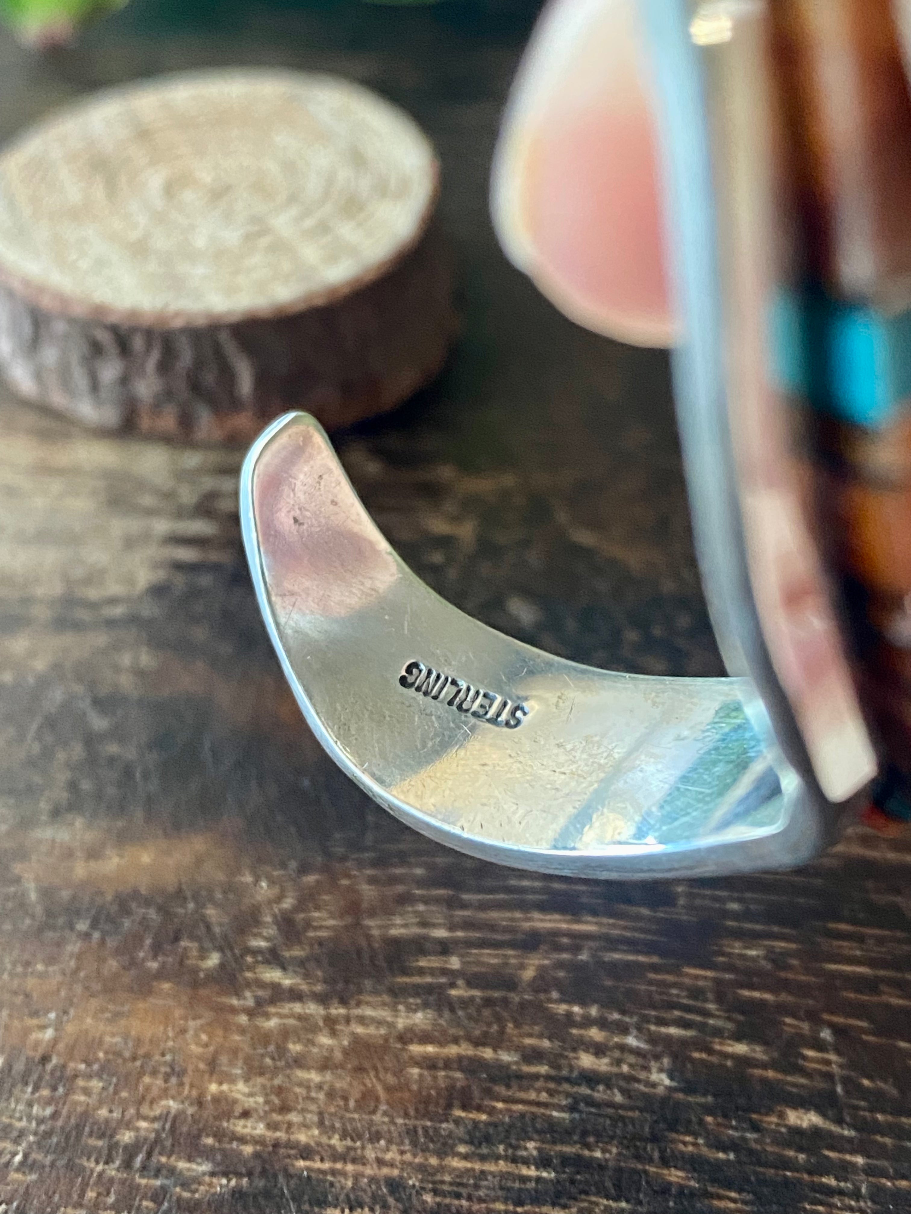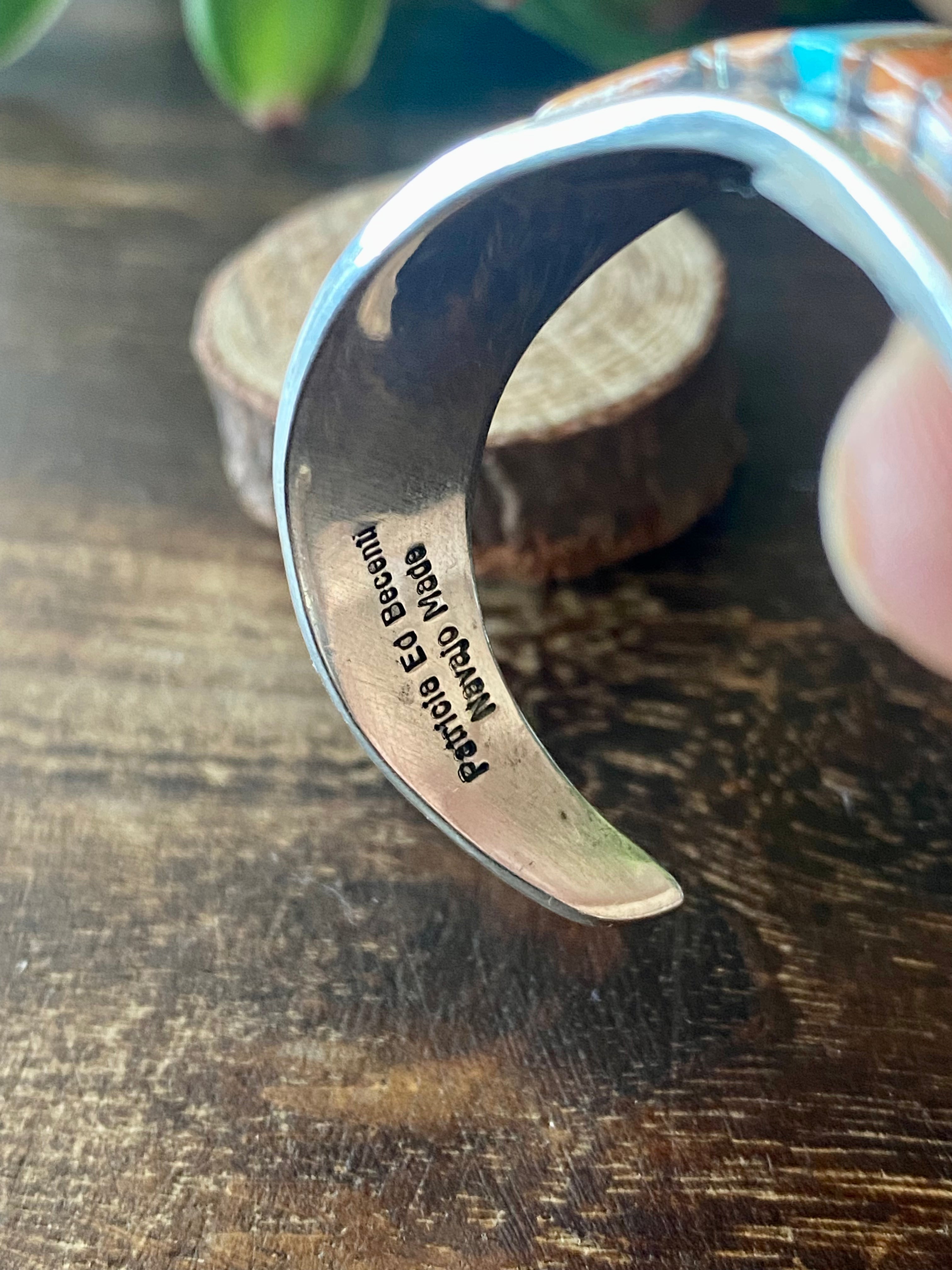 Patricia Ed Becenti Multi Stone & Sterling Silver Inlay Cuff Bracelet. It measures just over 1/2 of an inch wide with an inside circumference of 5 3/4 inches and a gap of 1 1/8 inches. Signed by the artist and stamped sterling silver.