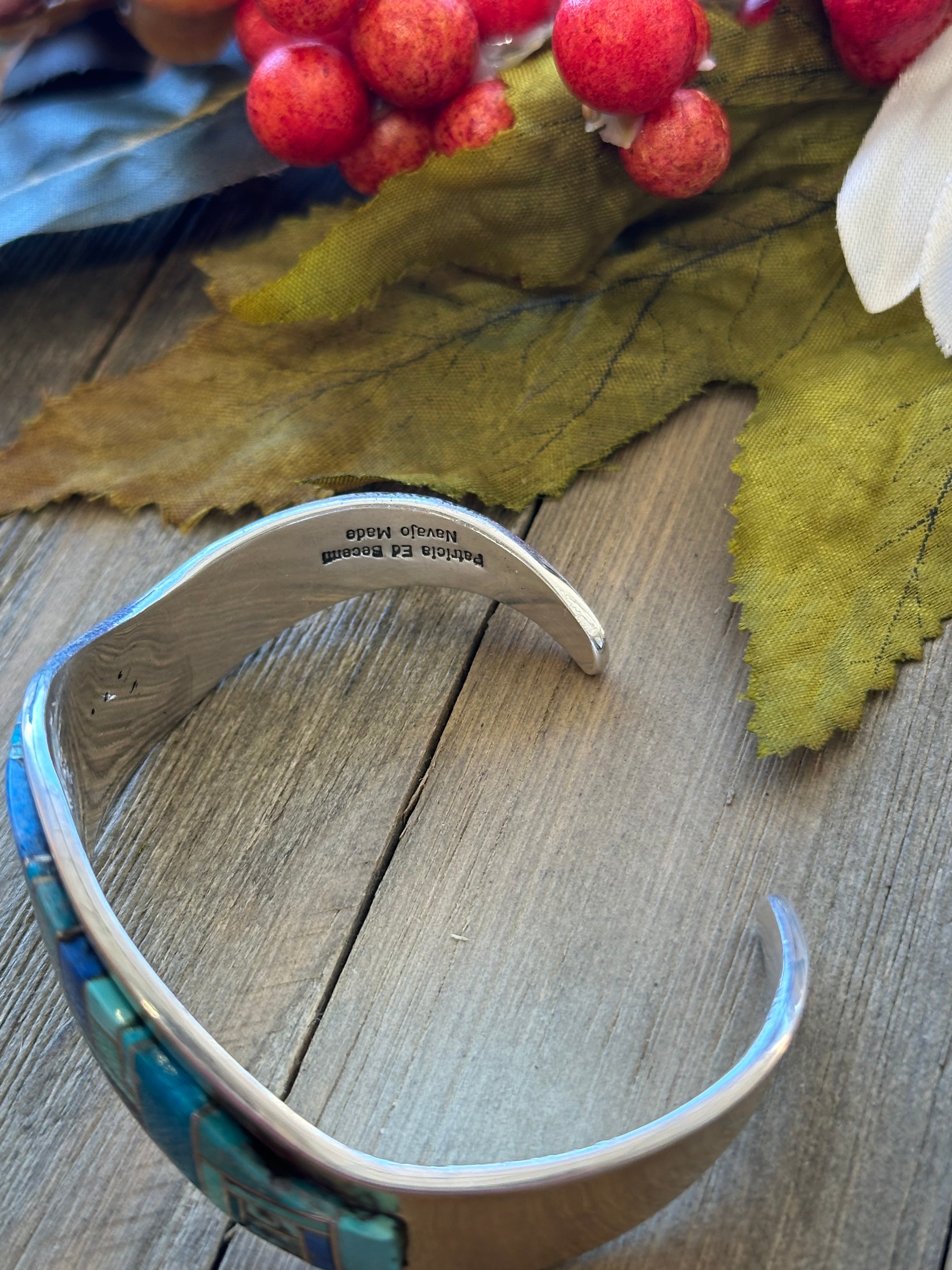 Patricia & Ed Becenti Multi Stone & Sterling Silver Inlay Cuff Bracelet. It measures 3/4 of an inch wide with an inside circumference of 5 3/4 inches and a gap of 1 inch. Signed by artist and stamped sterling silver.