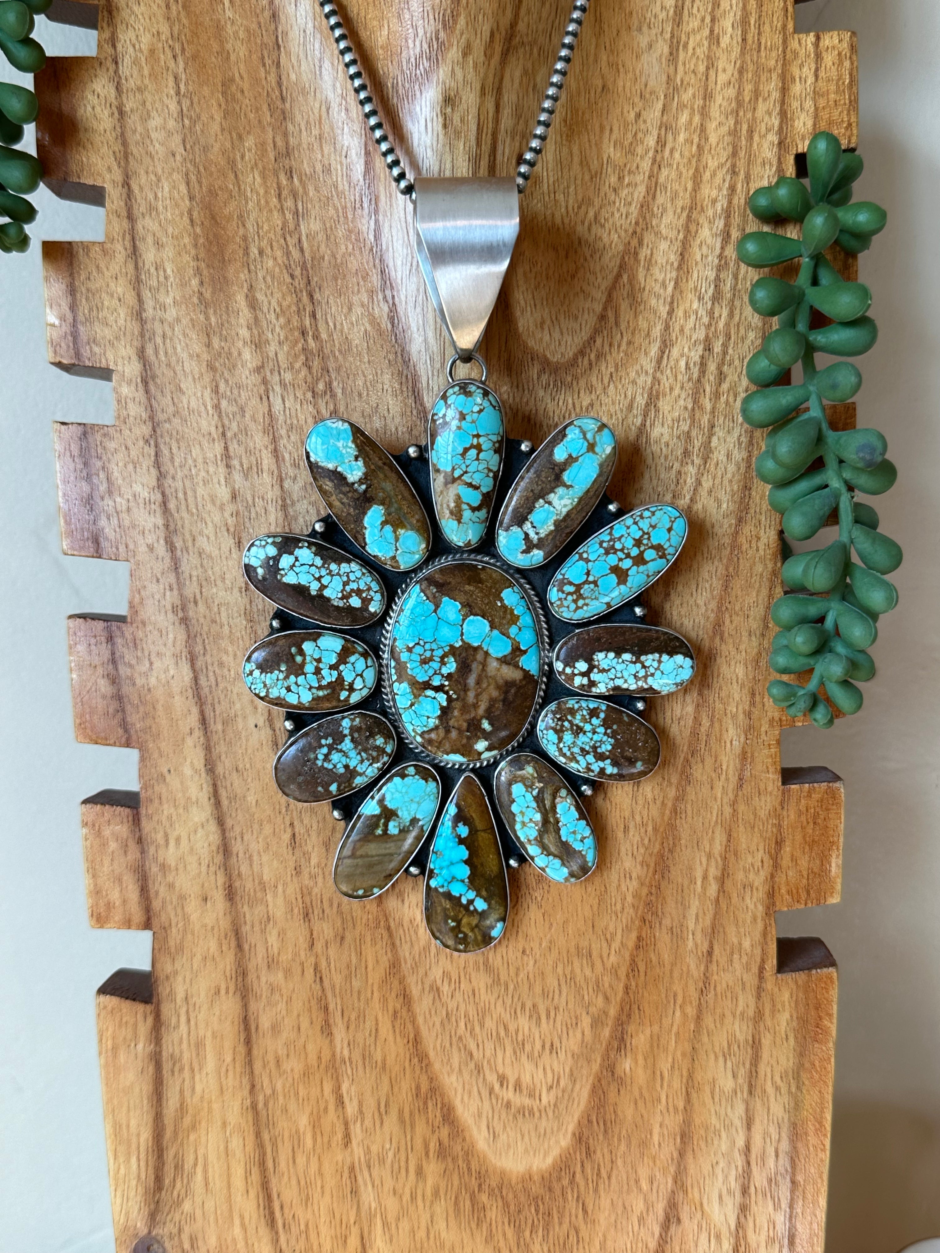 The most stunning pendant, very well made. Patrick Yazzie #8 Turquoise & Sterling Silver Cluster Pendant. It measures 6 inches long and 3 1/2 inches wide. Pendant Only. Signed by the artist and stamped sterling silver.