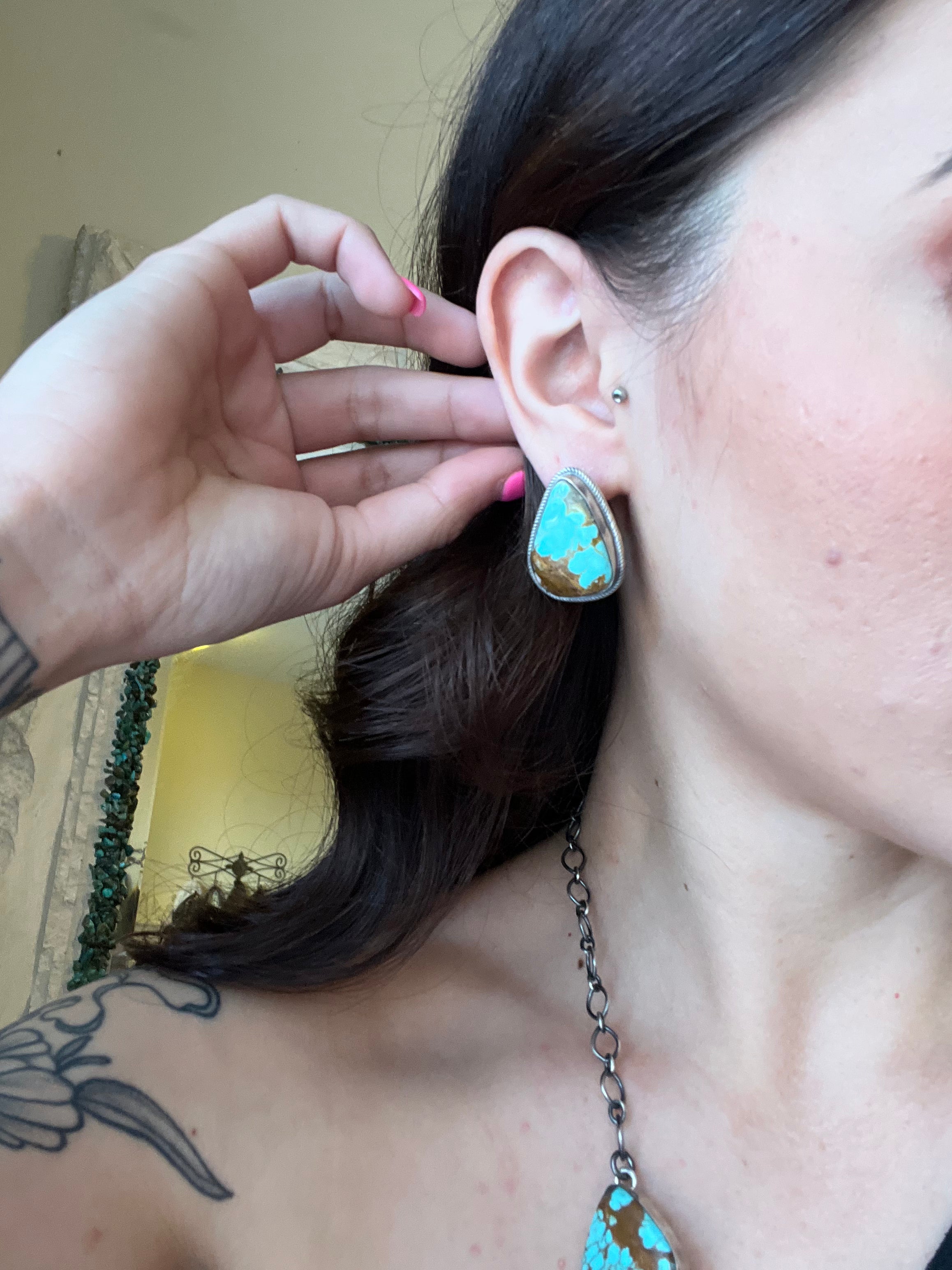 Paul Livingston #8 Turquoise & Sterling Silver Necklace Set. It measures just under 28 inches long with hang while the chain by itself measures 22 inches long. Signed by the artist and stamped sterling silver.