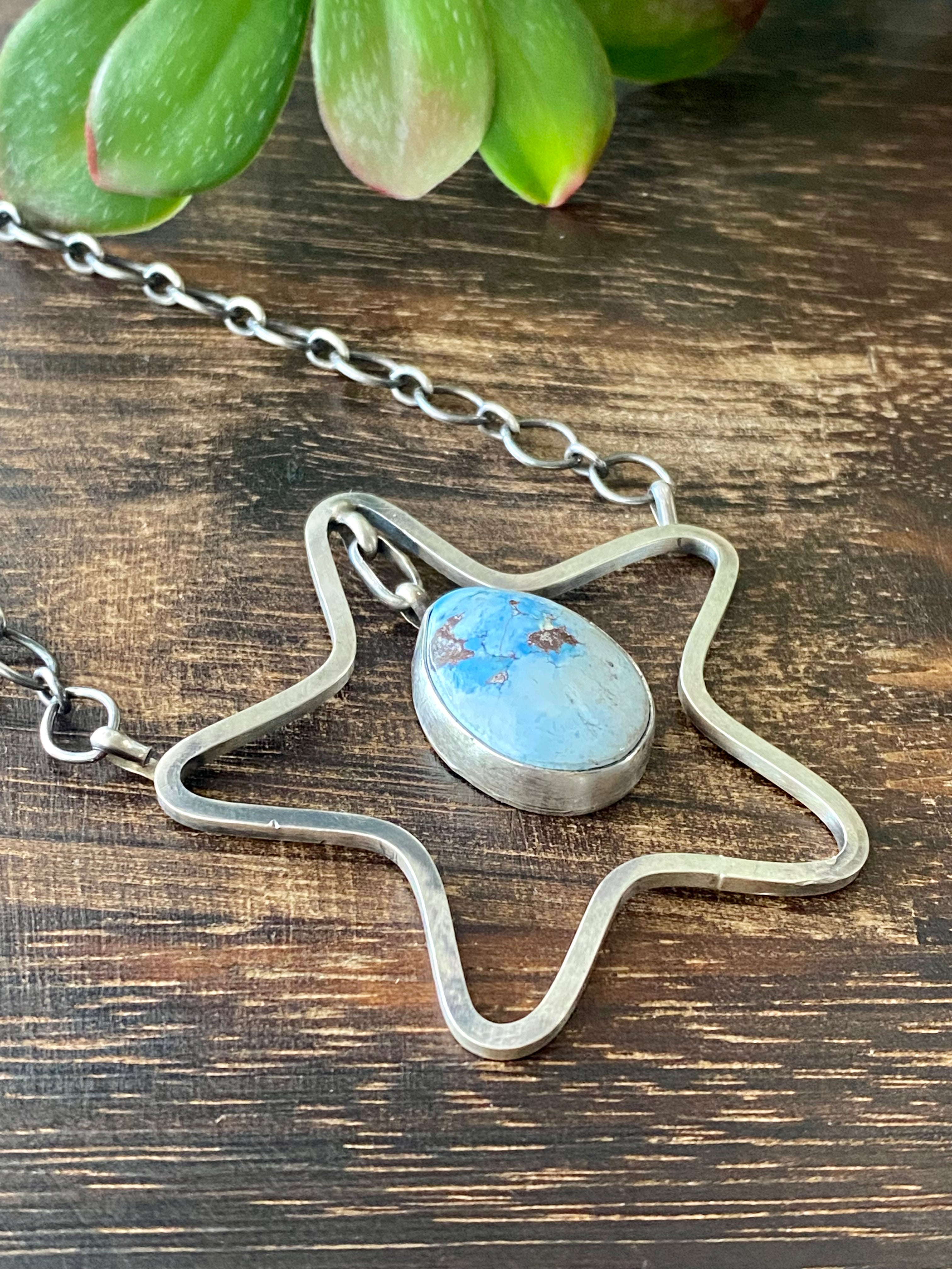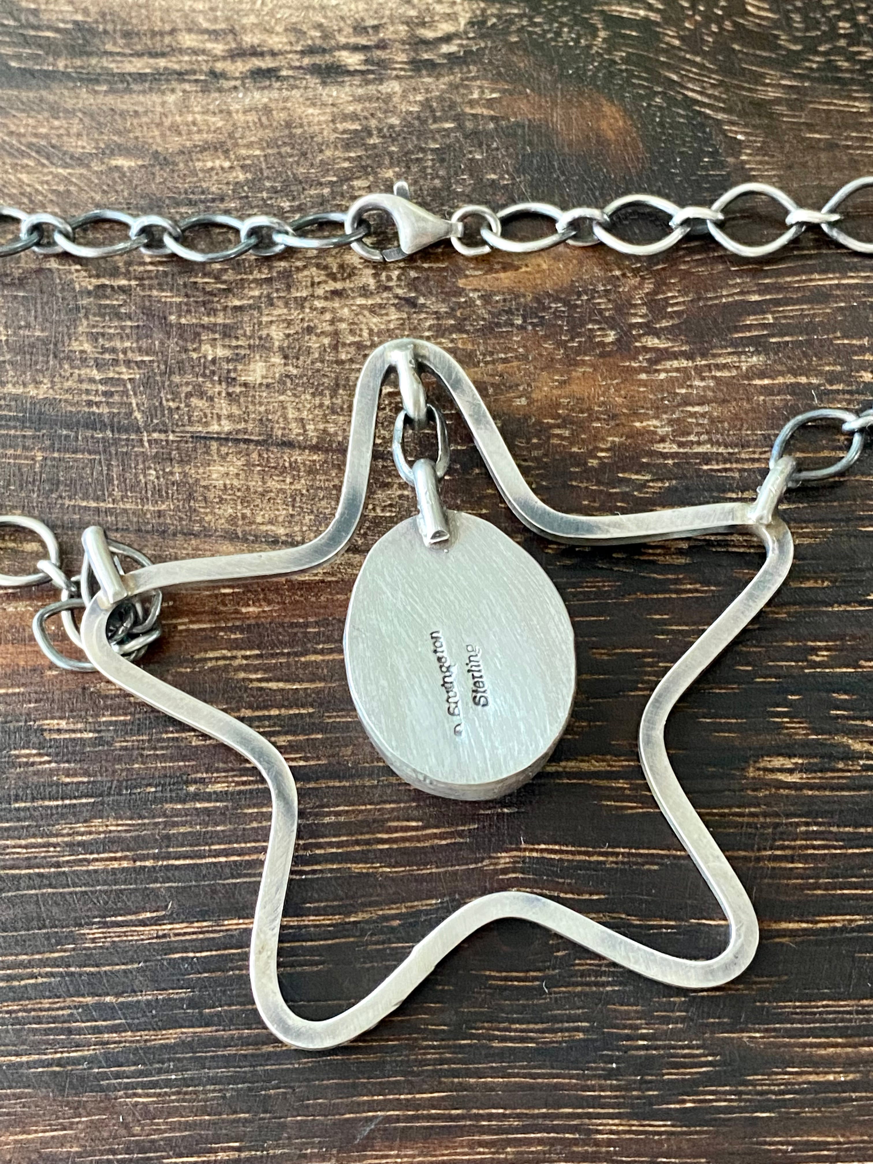 Paul Livingston Golden Hill’s Turquoise & Sterling Silver Star Necklace. It measures 22 inches long with hang while chain by itself measures just over 18 inches long. Signed by the artist and stamped sterling silver.