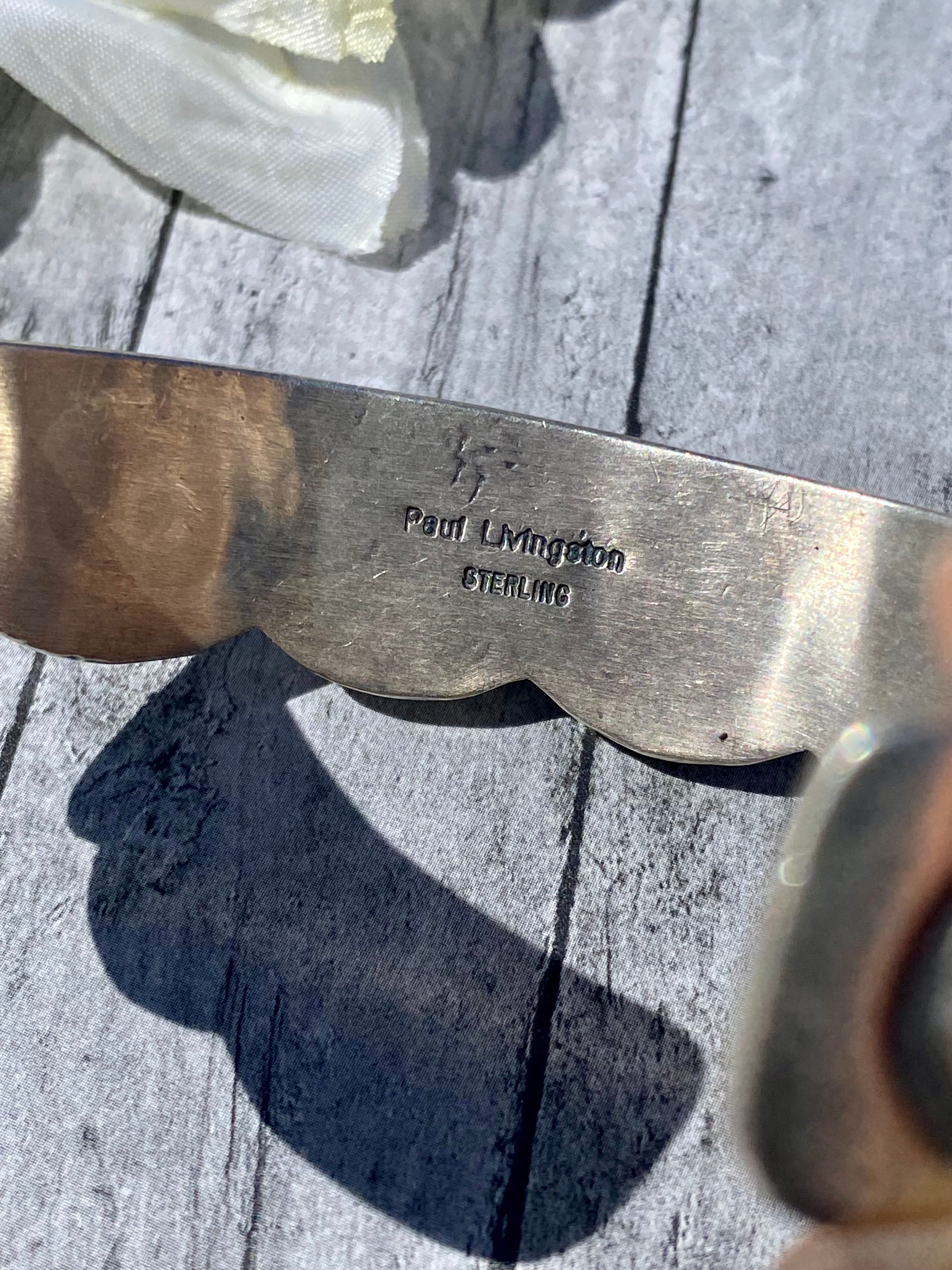 Paul Livingston Navajo Made Sleeping Beauty Turquoise & Sterling Silver Cuff Bracelet. It measures 5/8 of an inch wide and has an inside circumference of 5 3/4 inches and a gap of 1 inch. Signed by the artist and stamped sterling silver.