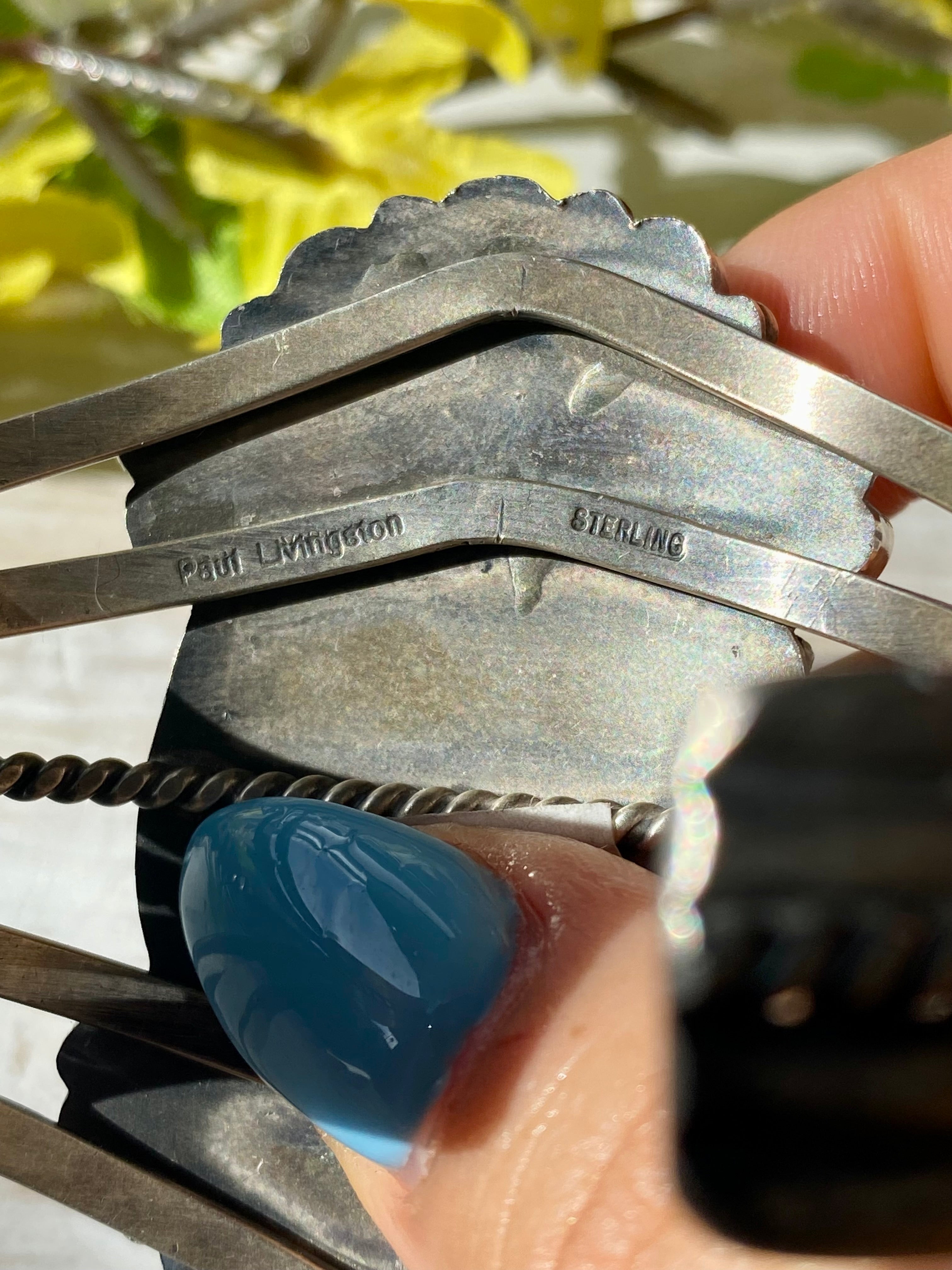 Paul Livingston Spiny Oyster & Kingman Turquoise Sterling Silver Cuff Bracelet. It measures 2 1/2 inches wide with an inside circumference of 5 1/2 inches and a gap of 1 1/8 inches. Signed by the artist and stamped sterling silver.