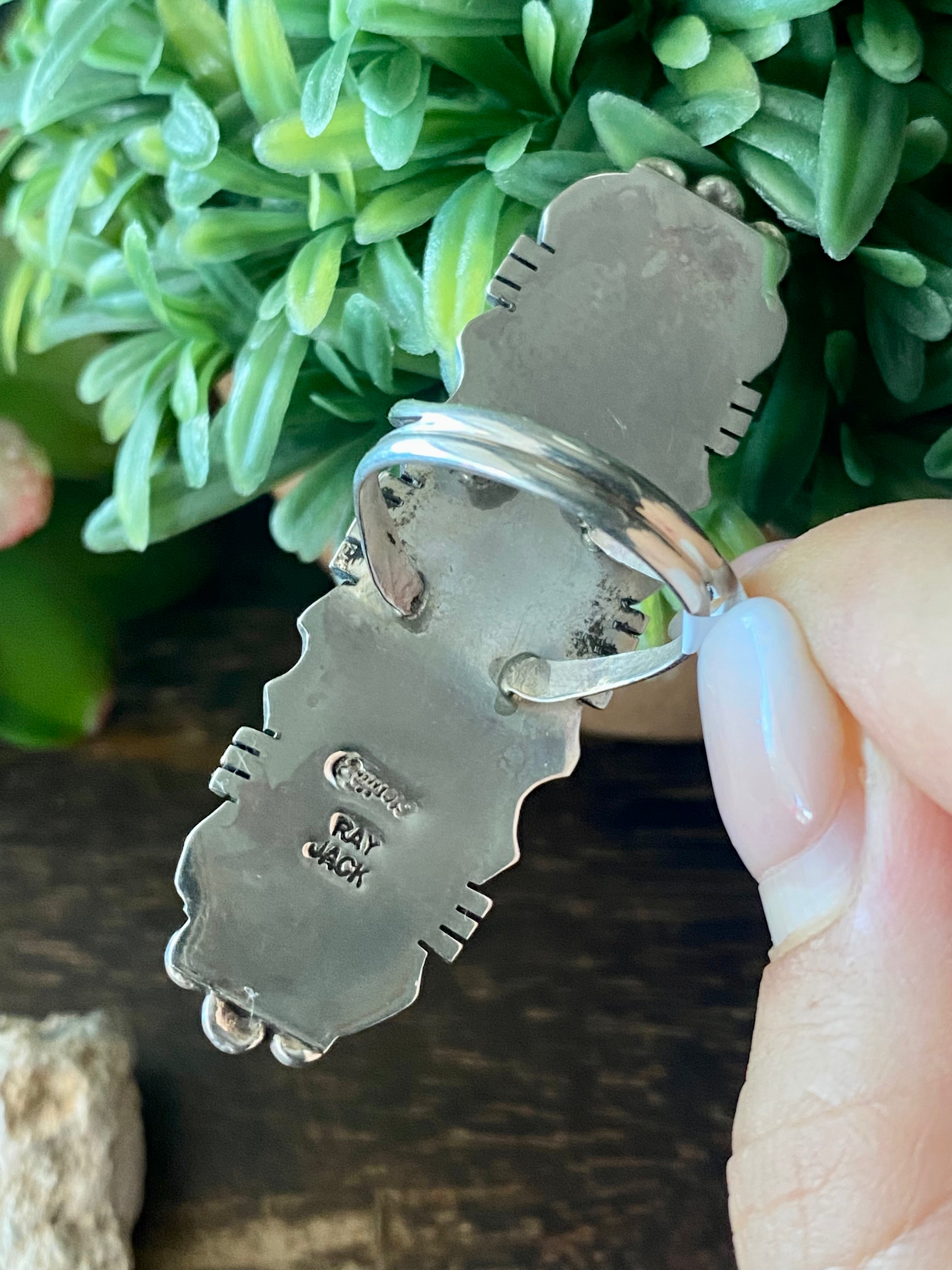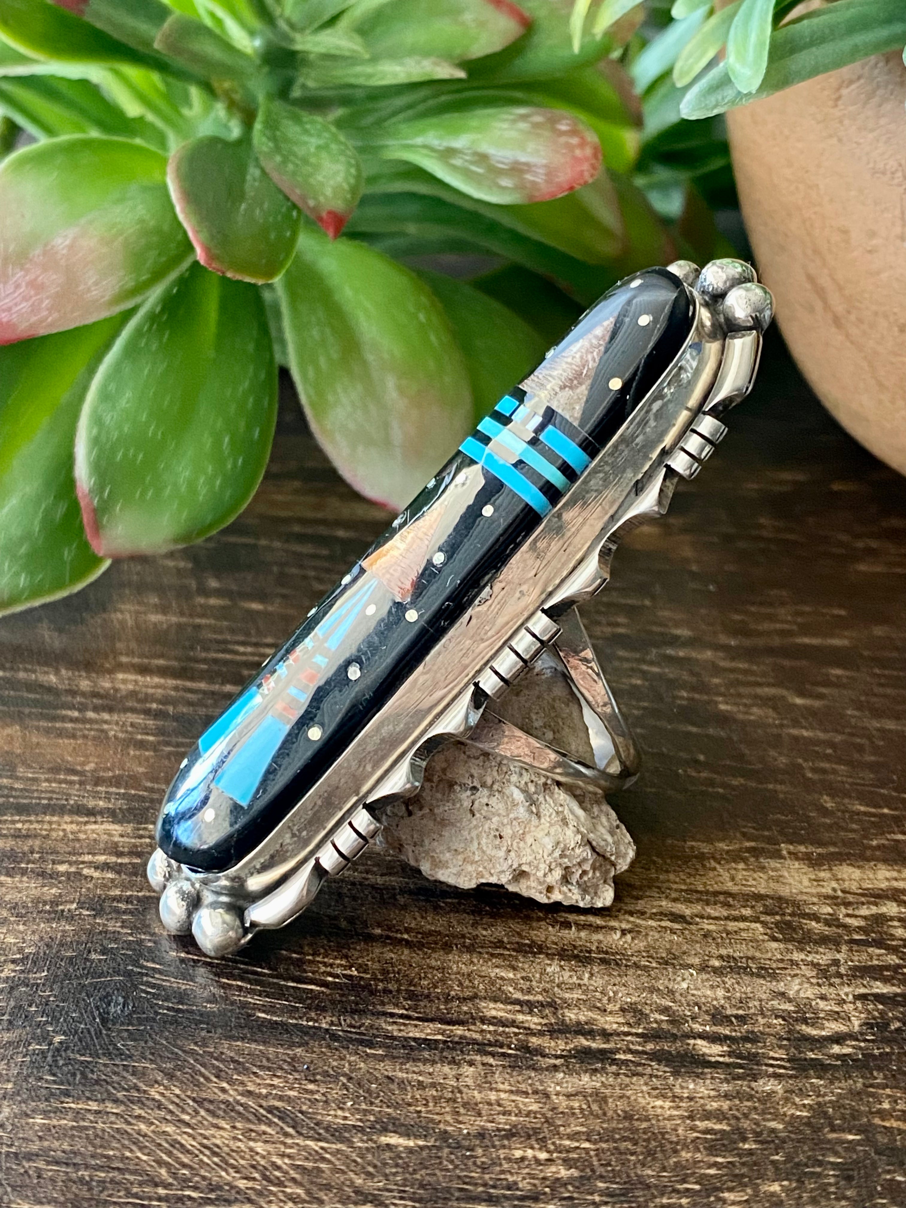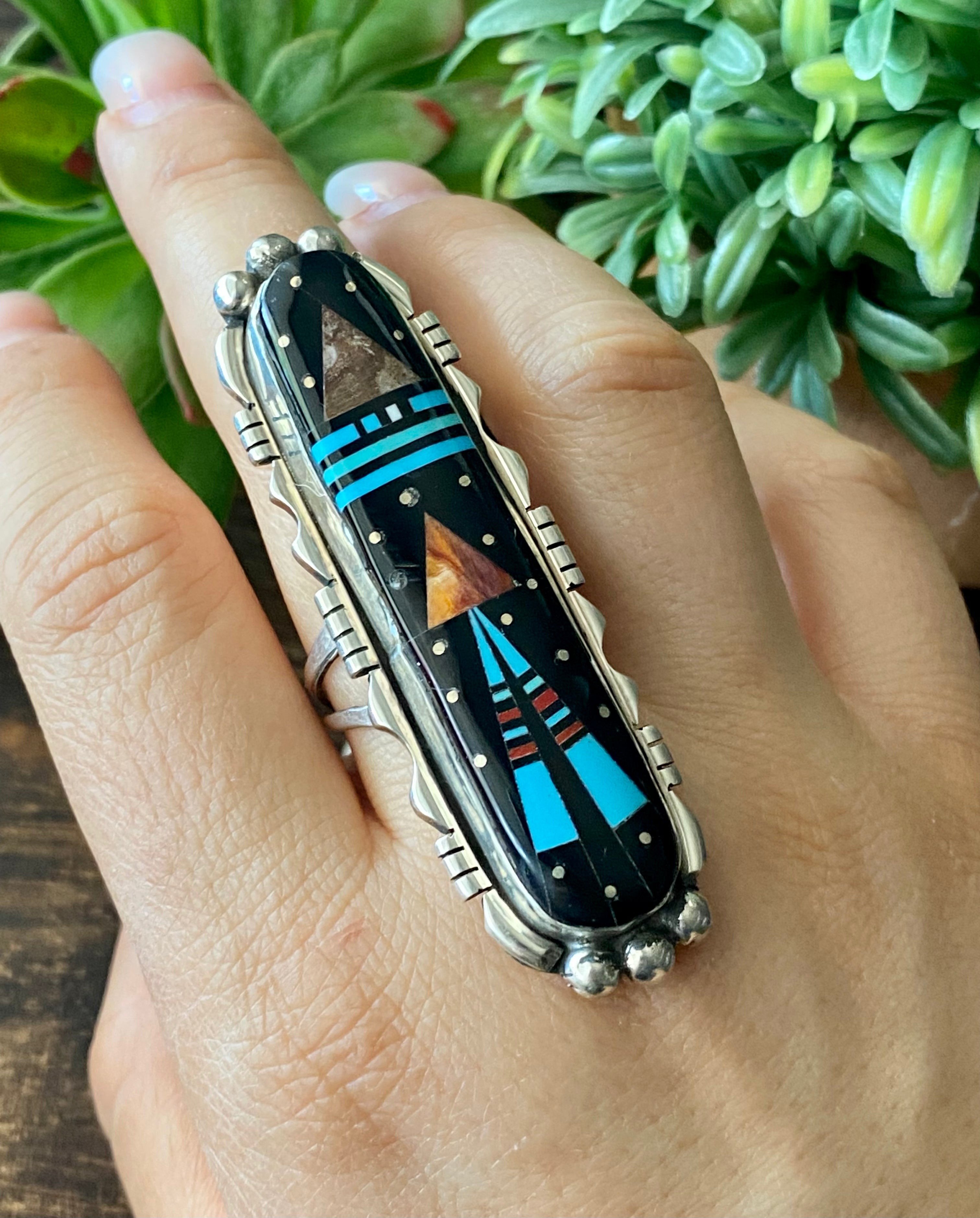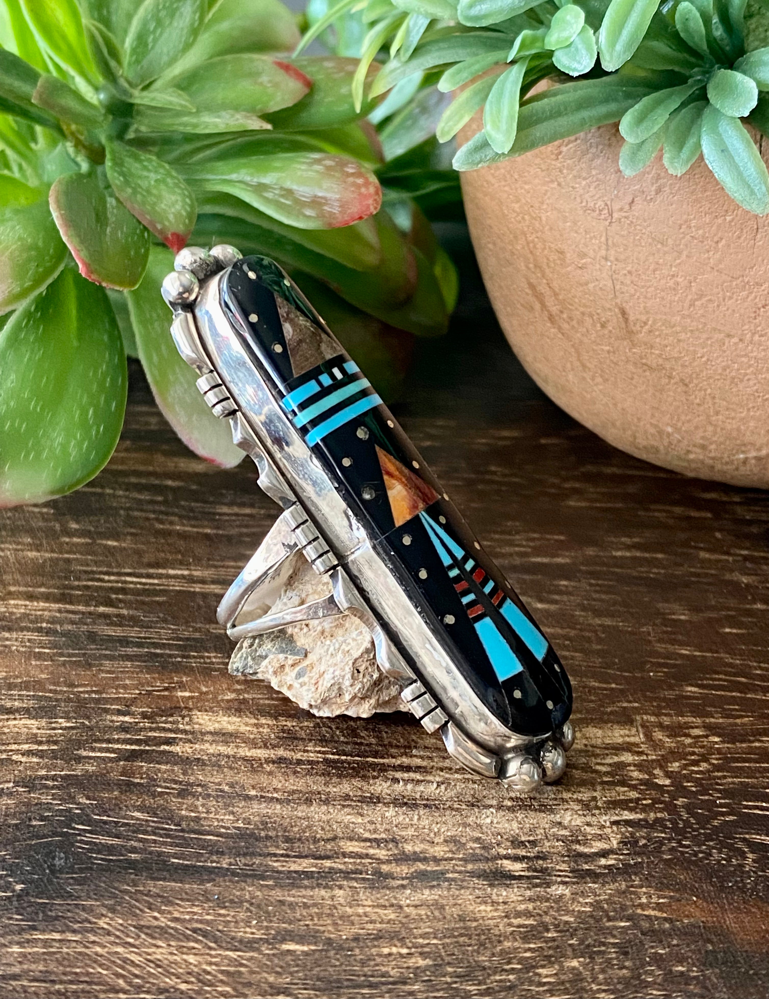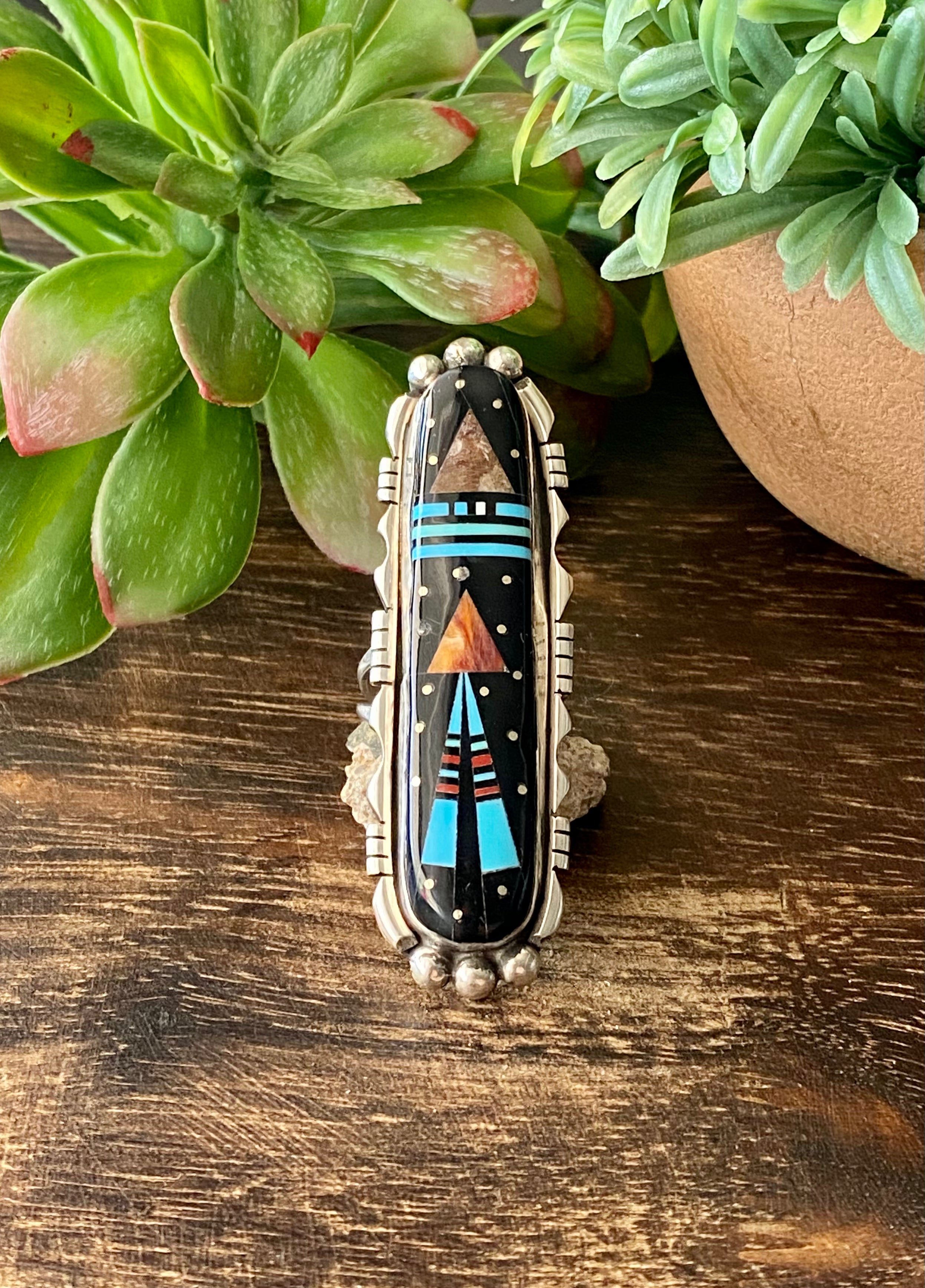 Ray Jack Multi Stone & Sterling Silver Inlay Ring Size 11. It measures 2 5/8 inches long and 7/8 of an inch wide. Signed by the artist and stamped sterling silver.