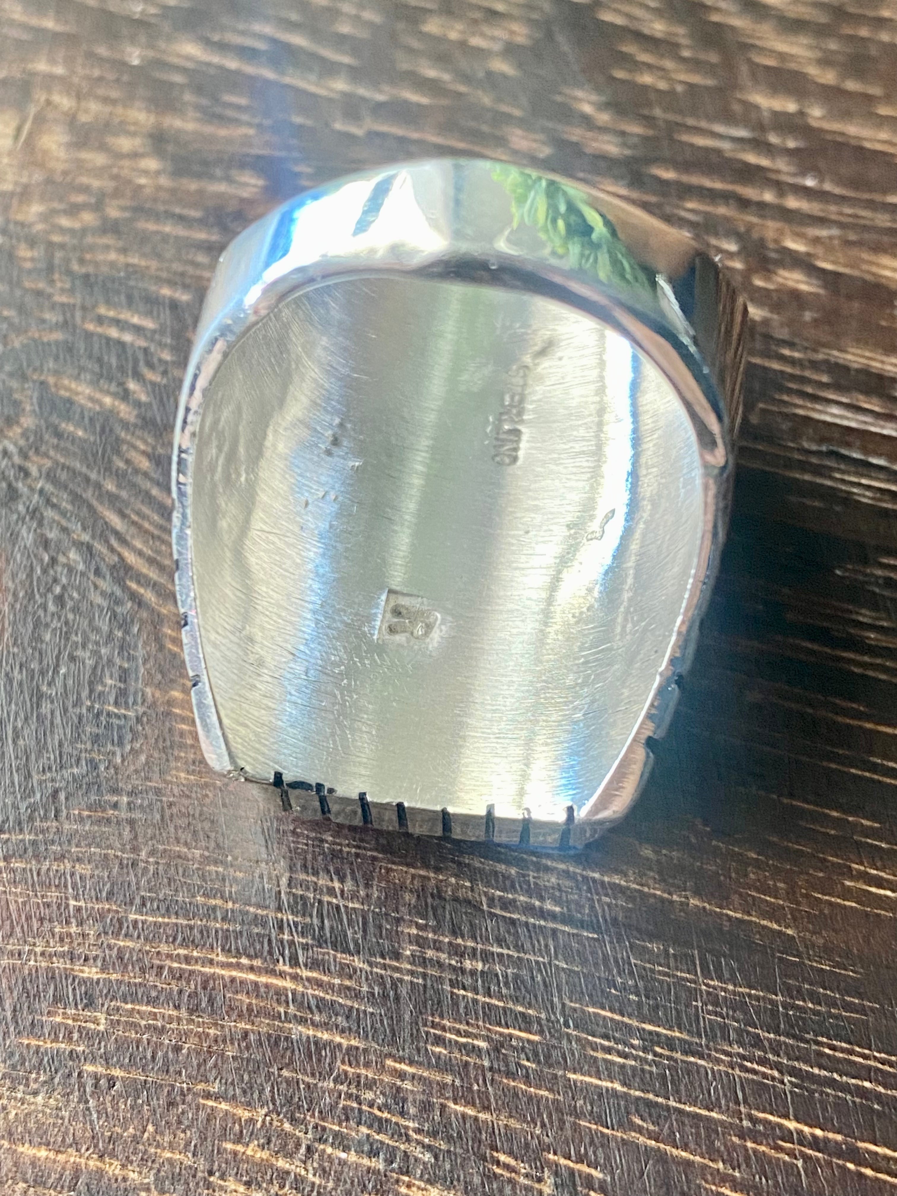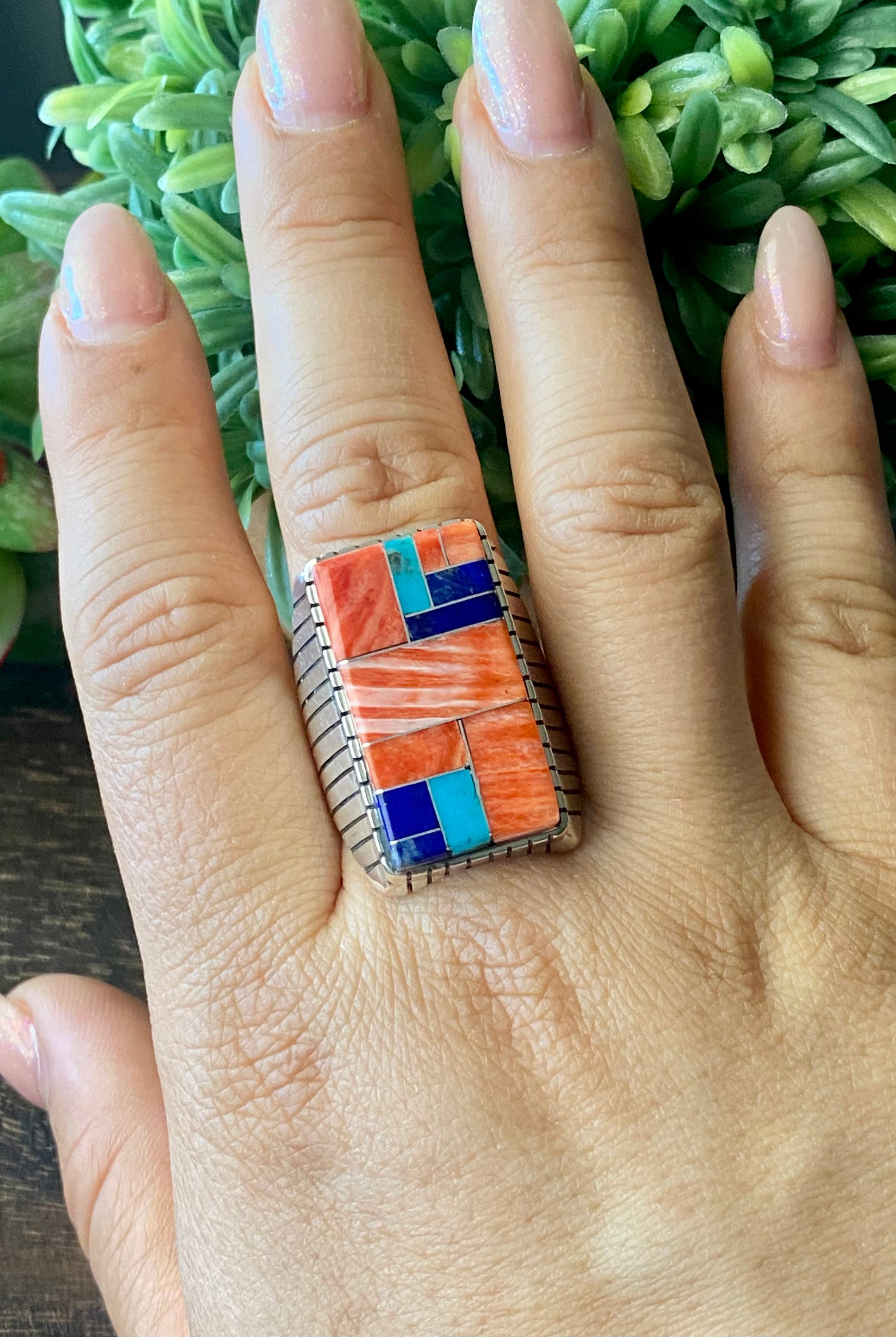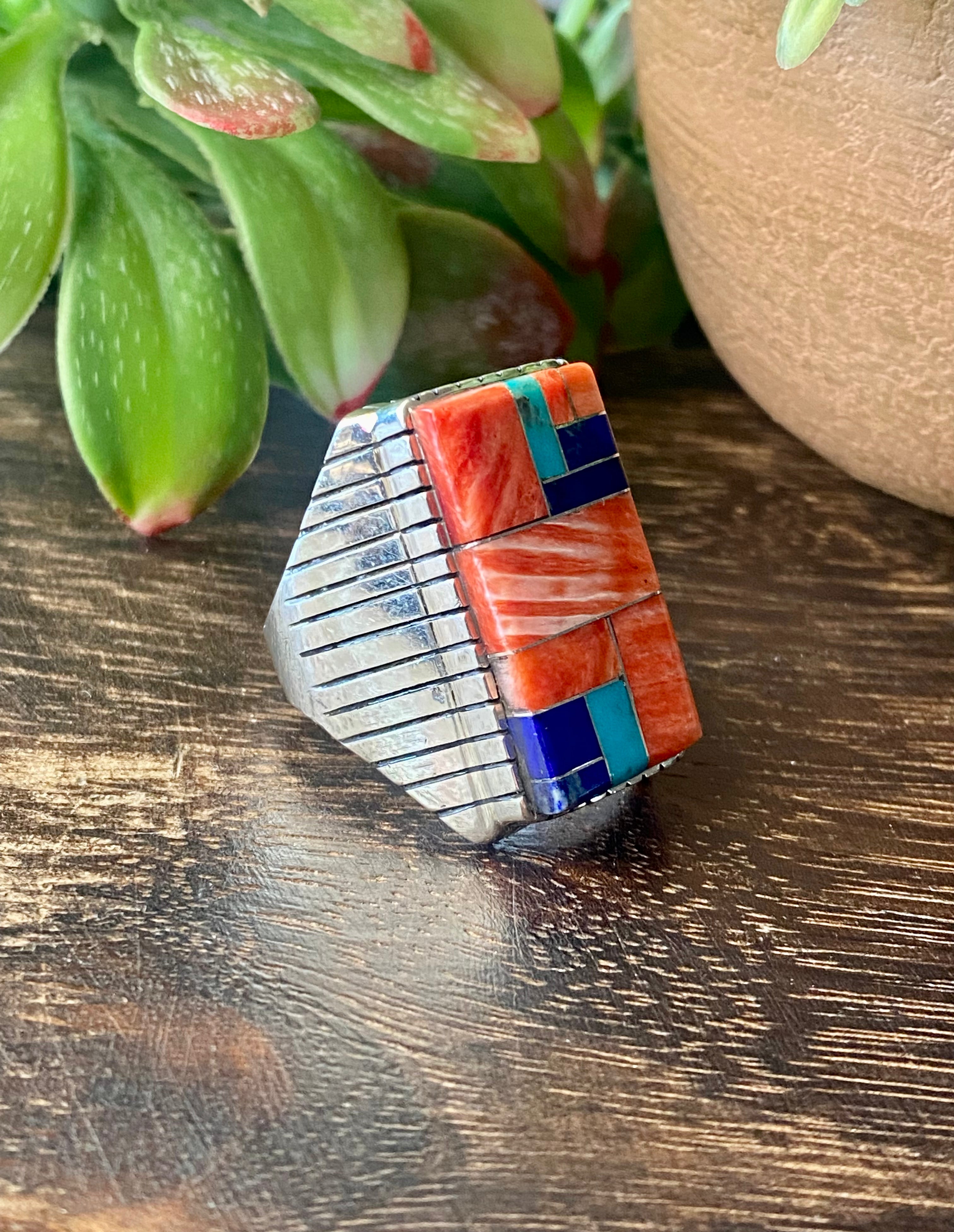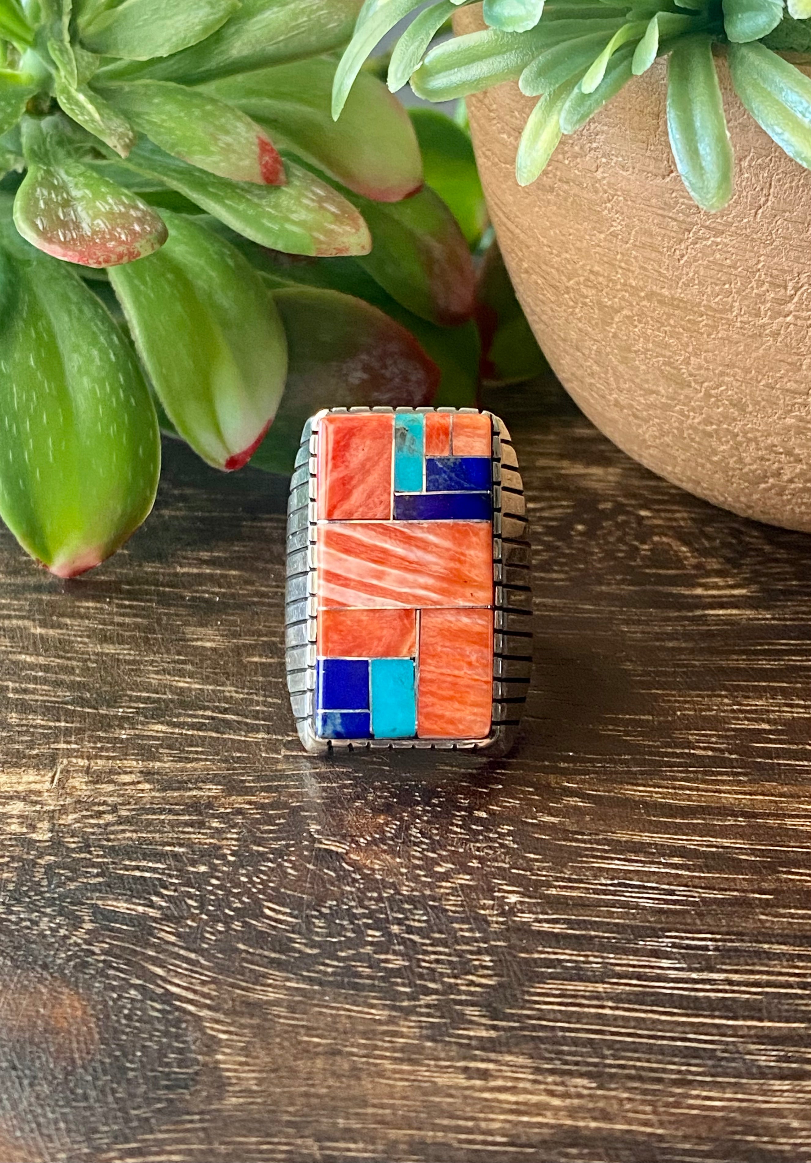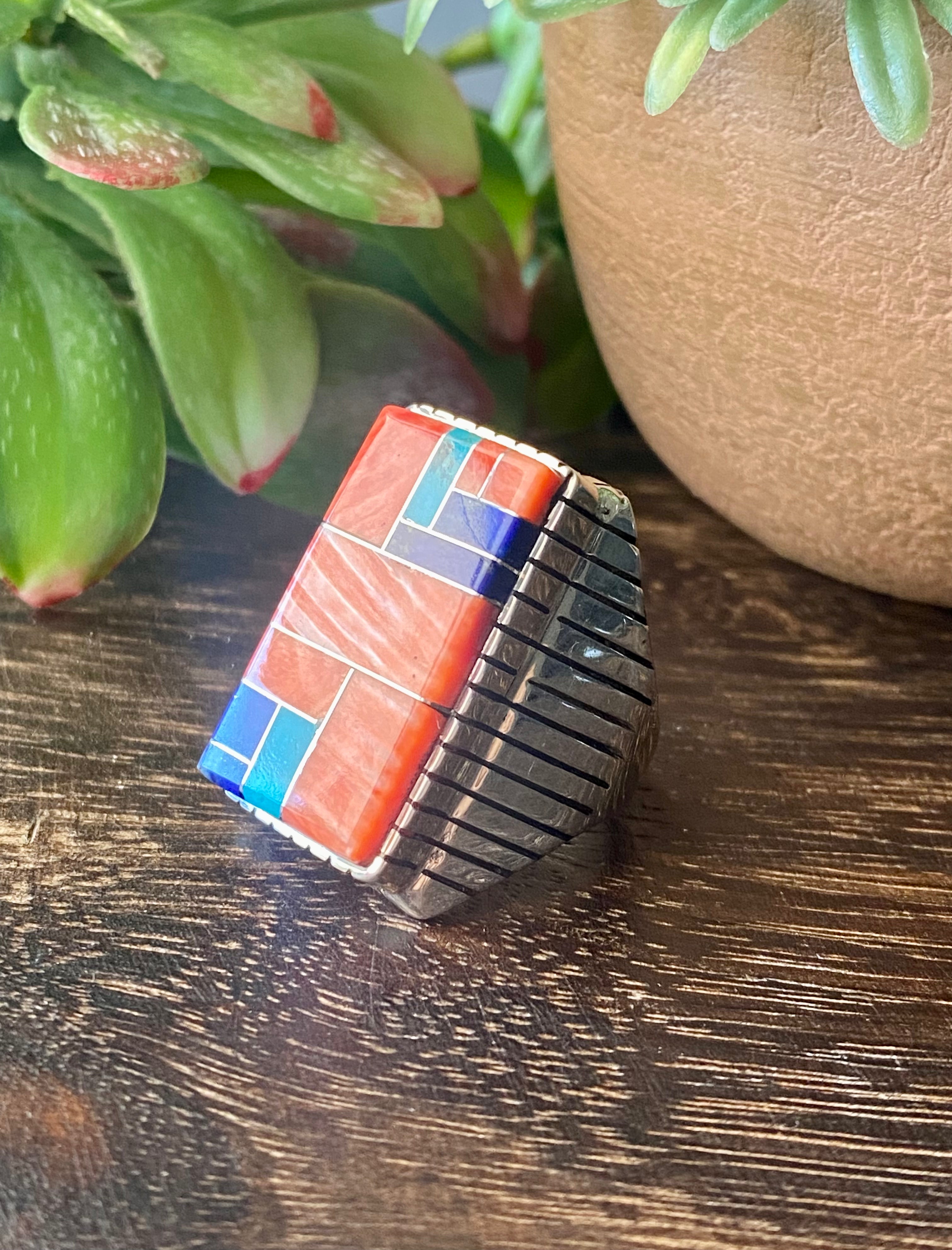 Ray Jack Multi Stone & Sterling Silver Inlay Ring Size 11.5. It measures 1 1/4 inches long and 3/4 of an inch wide. Signed by the artist and stamped sterling silver.