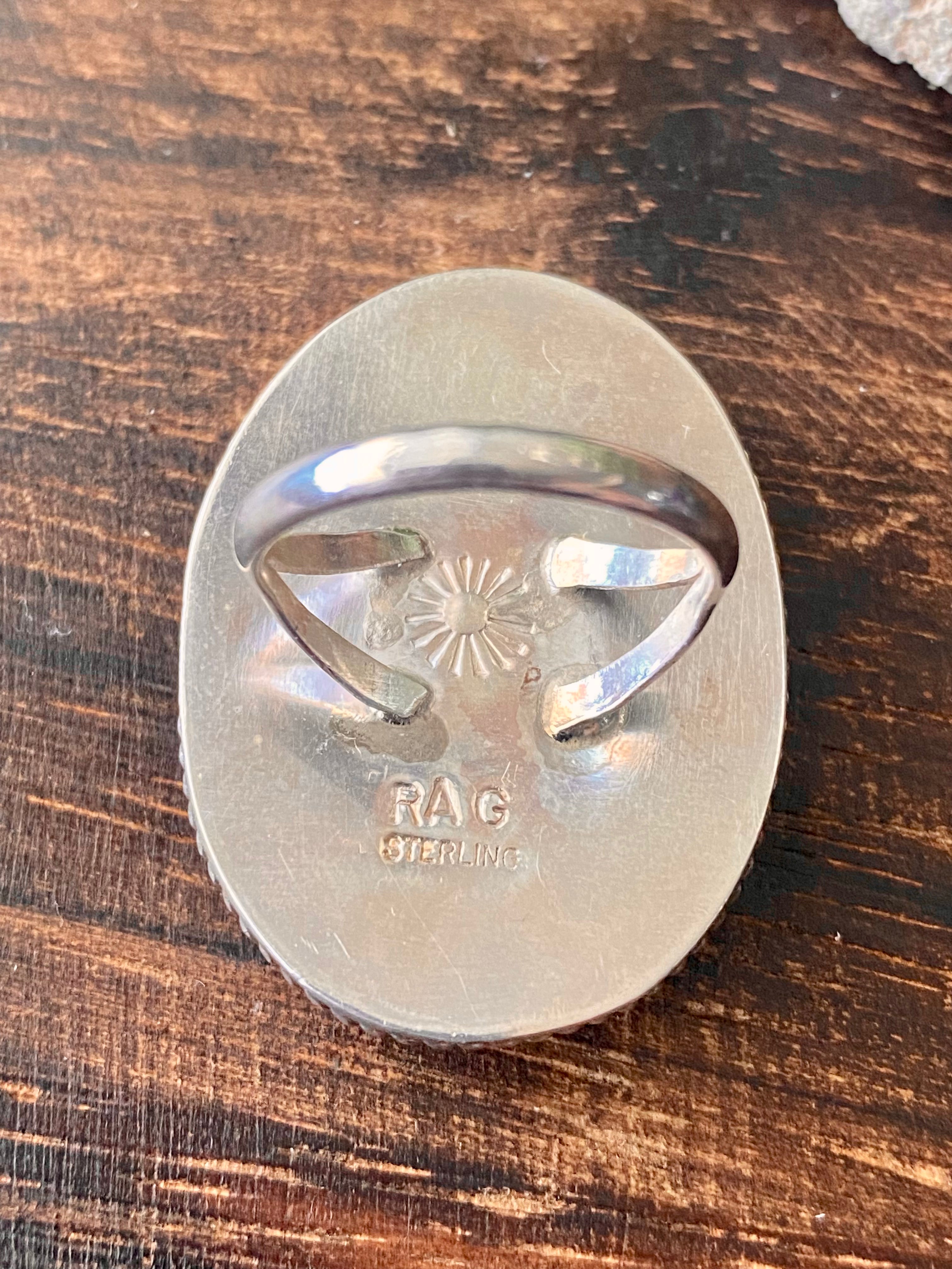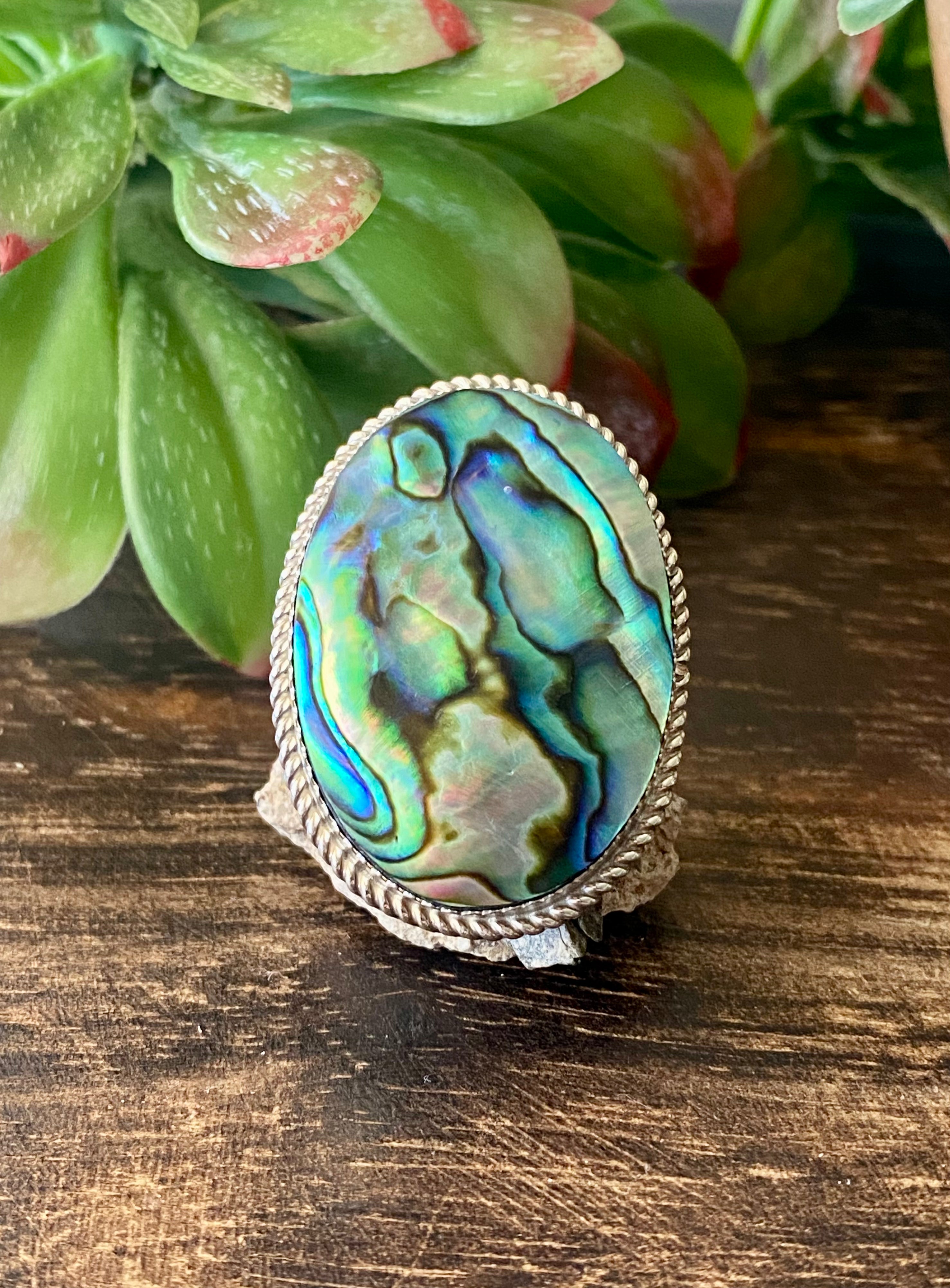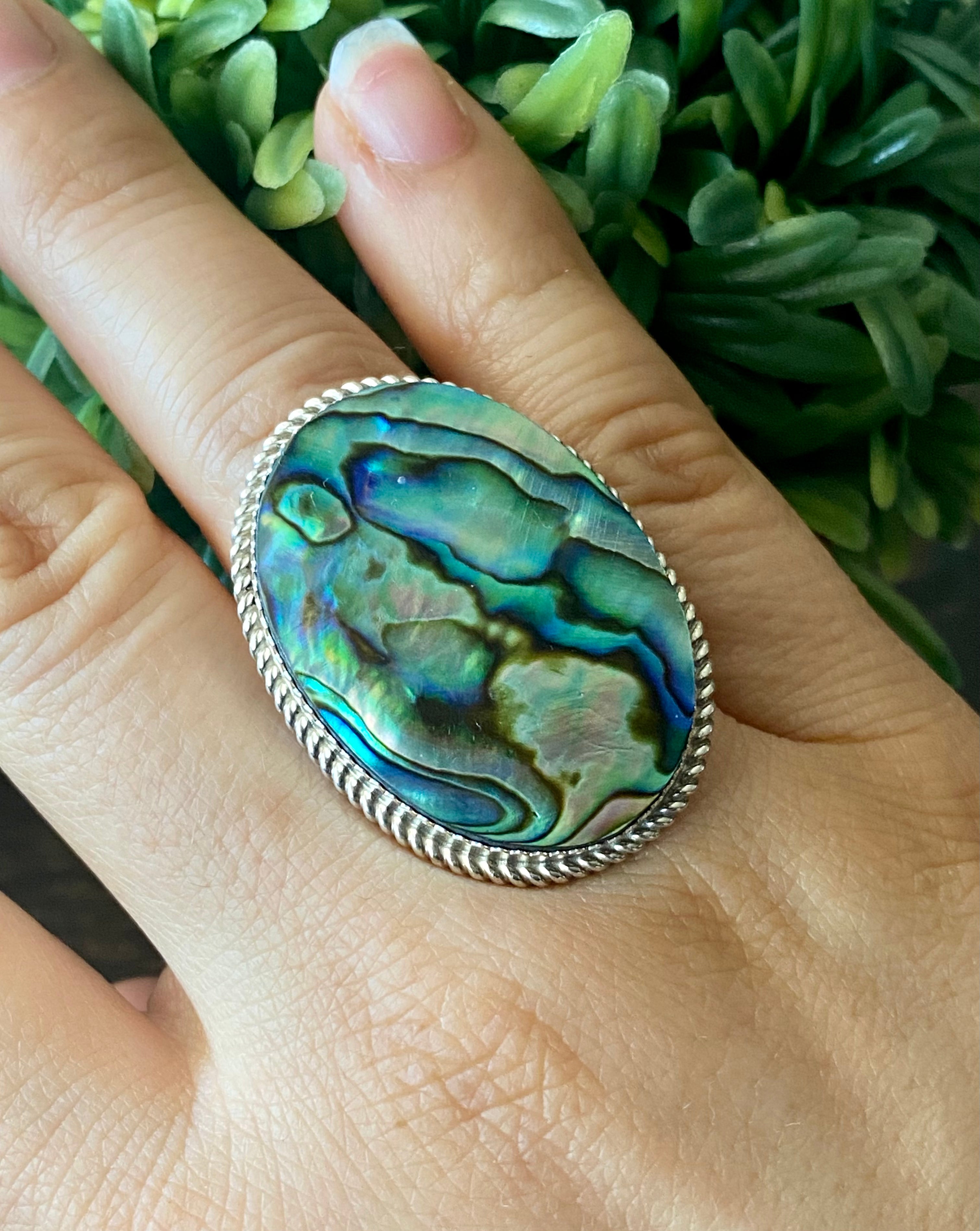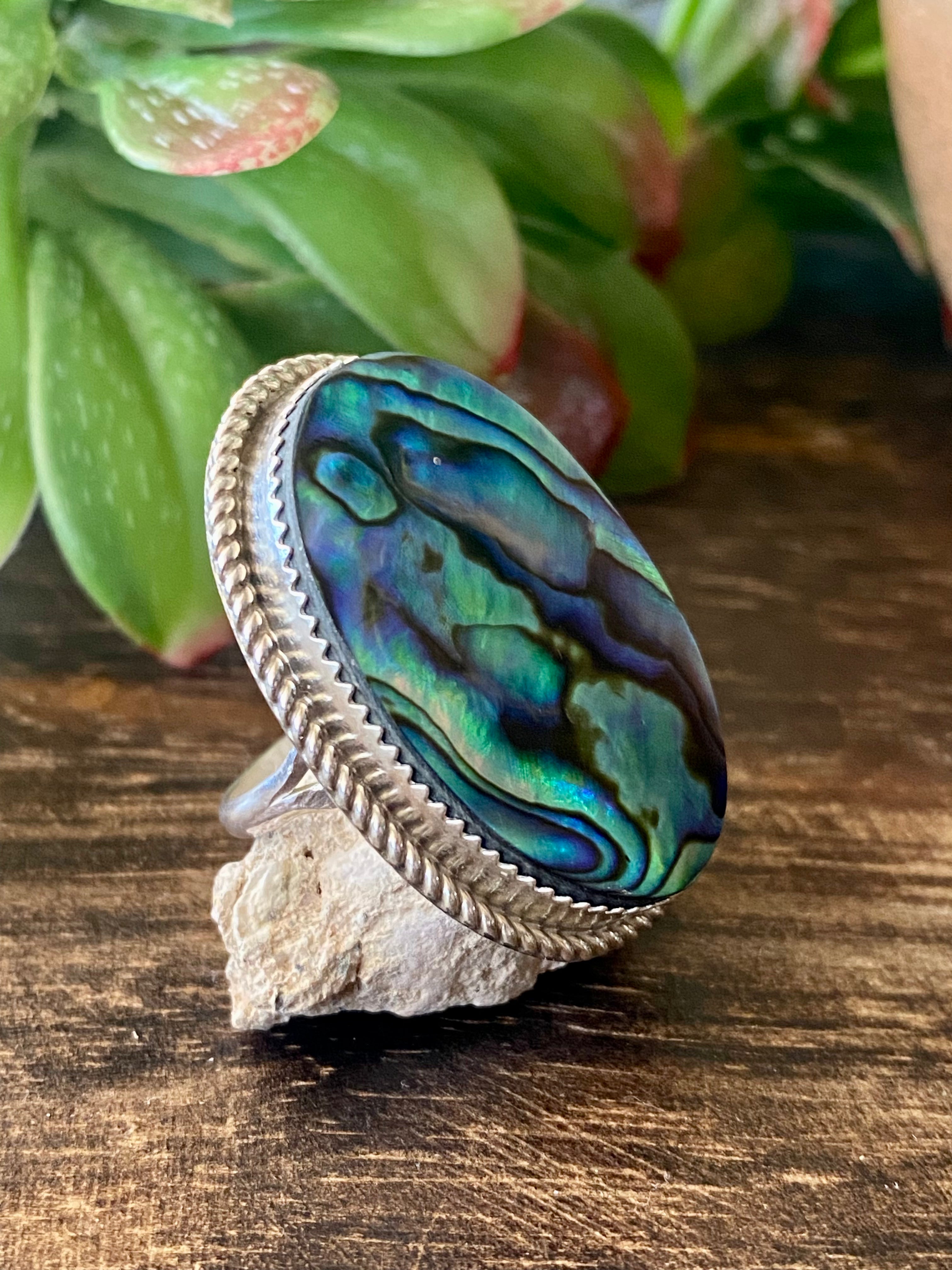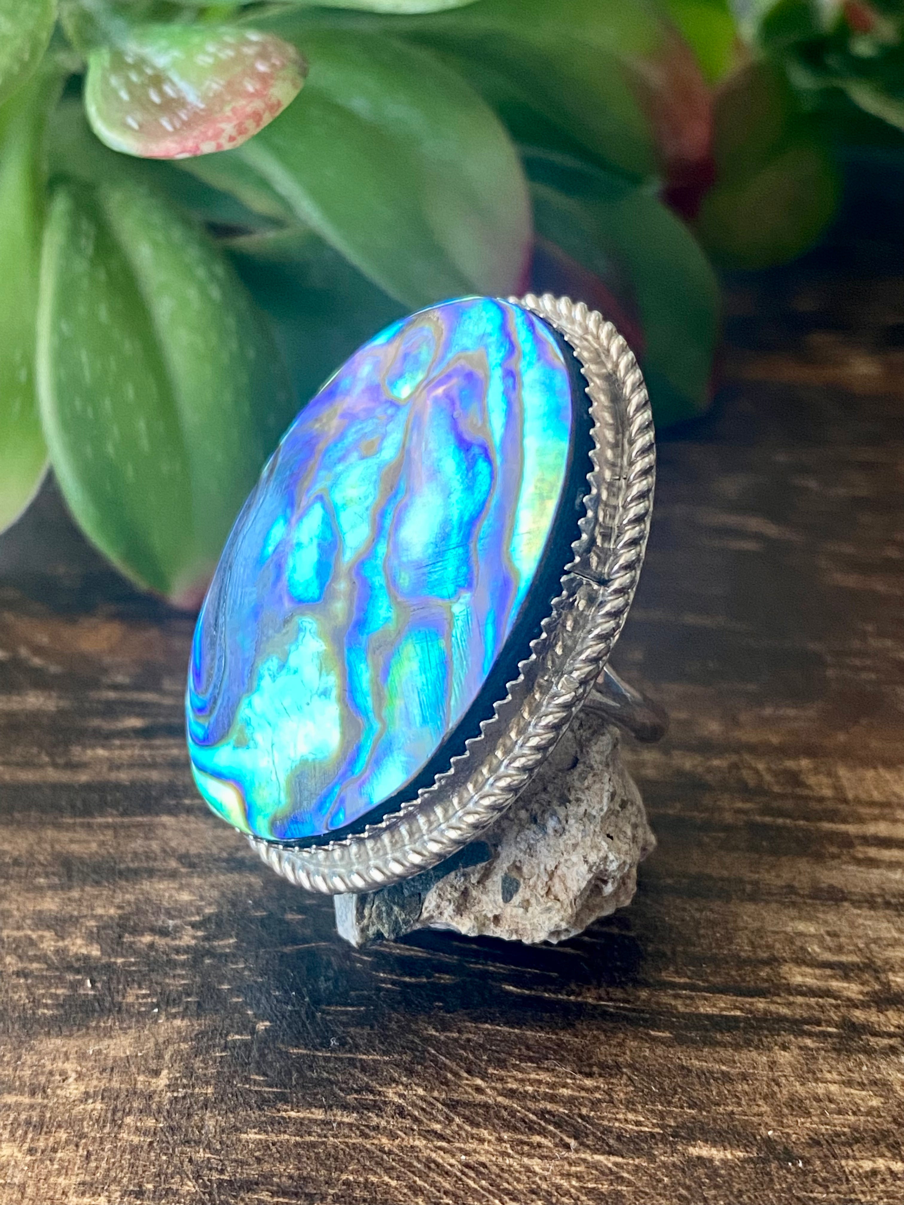 Reda Galvan Abalone & Sterling Silver Ring Size 7.75. It measures 1 1/2 inches long and 1 1/8 inches wide. Signed by the artist and stamped sterling silver.