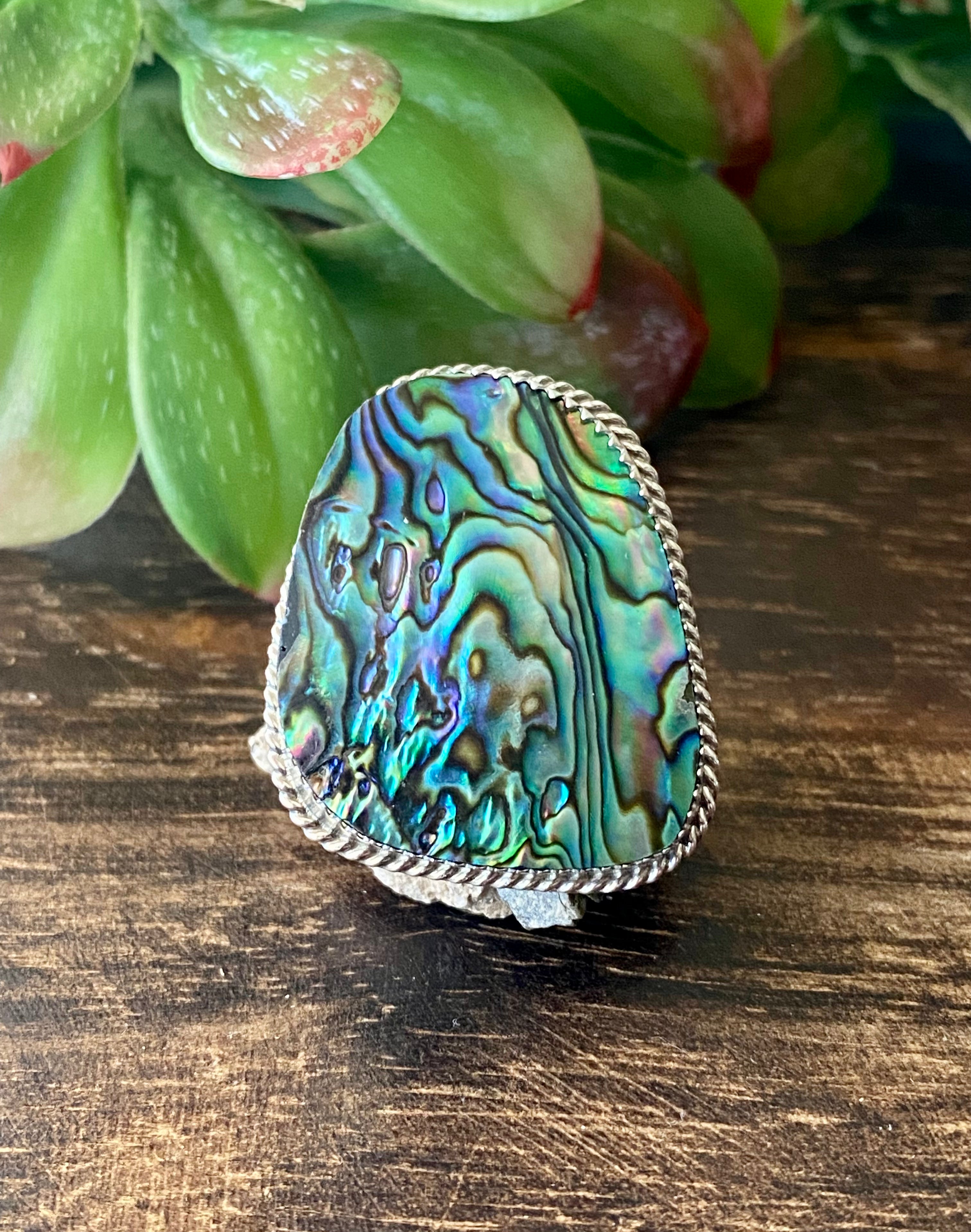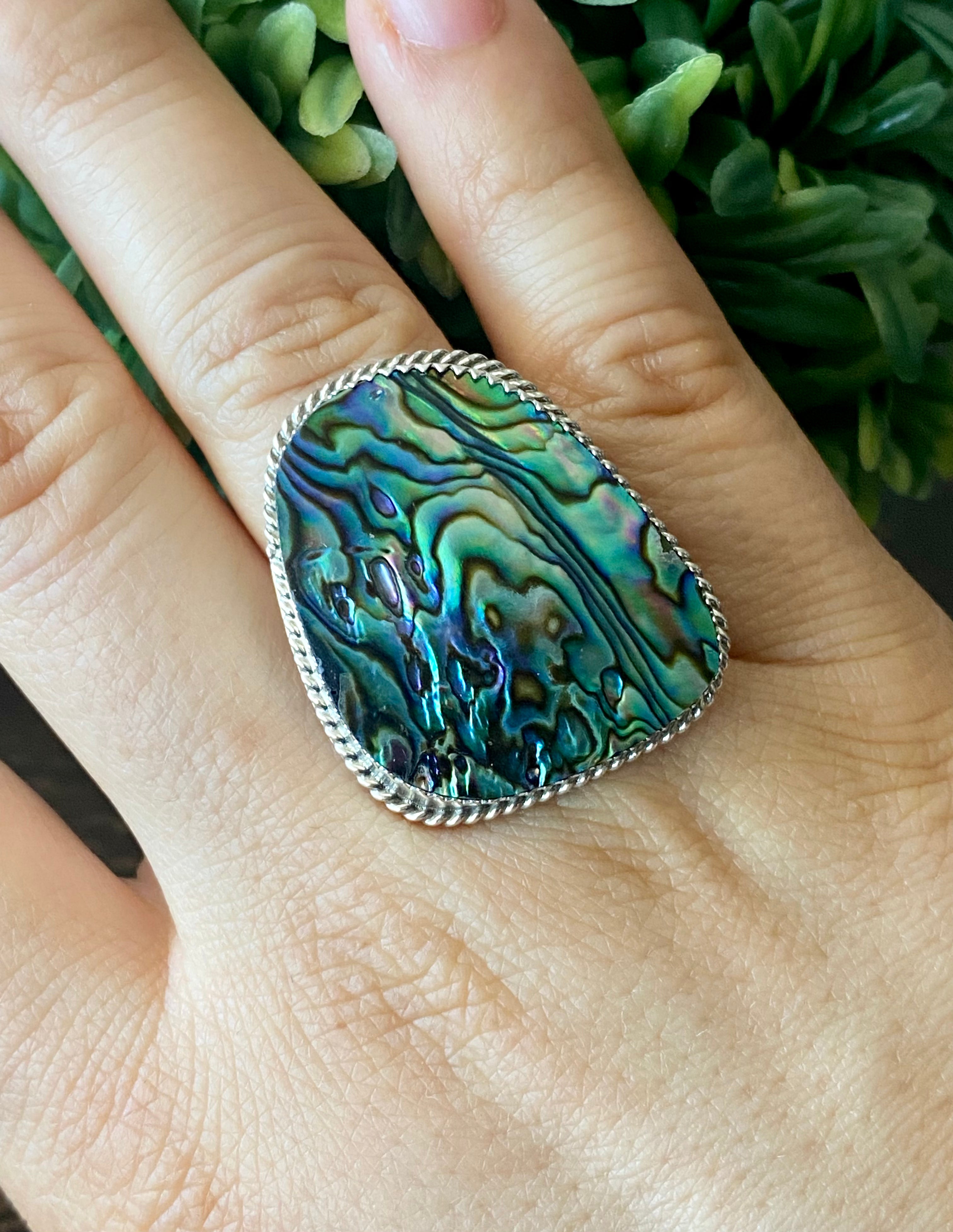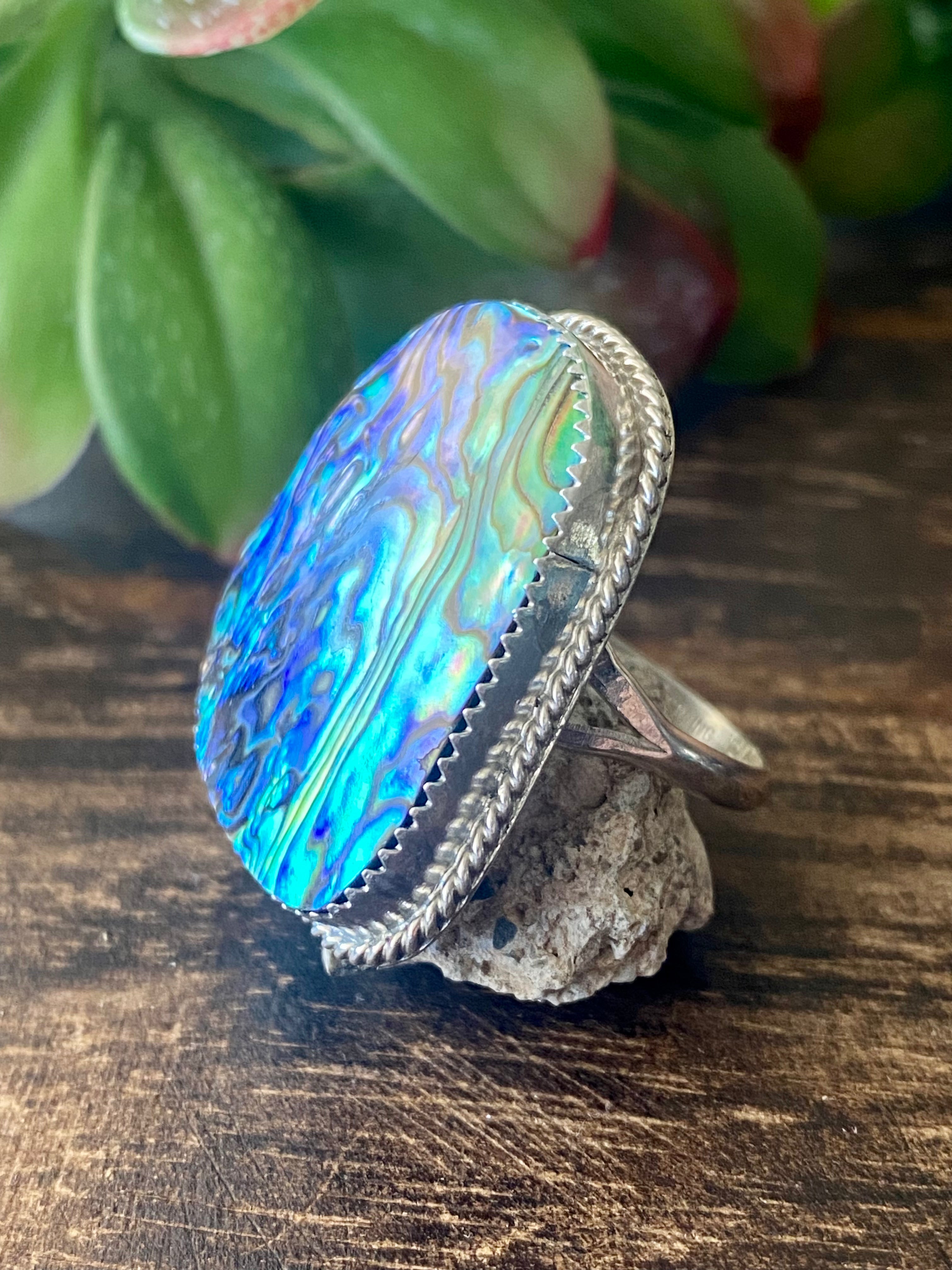 Reda Galvan Abalone & Sterling Silver Ring Size 9.75. It measures 1 3/8 inches long and 1 1/8 inches wide. Signed by the artist and stamped sterling silver.