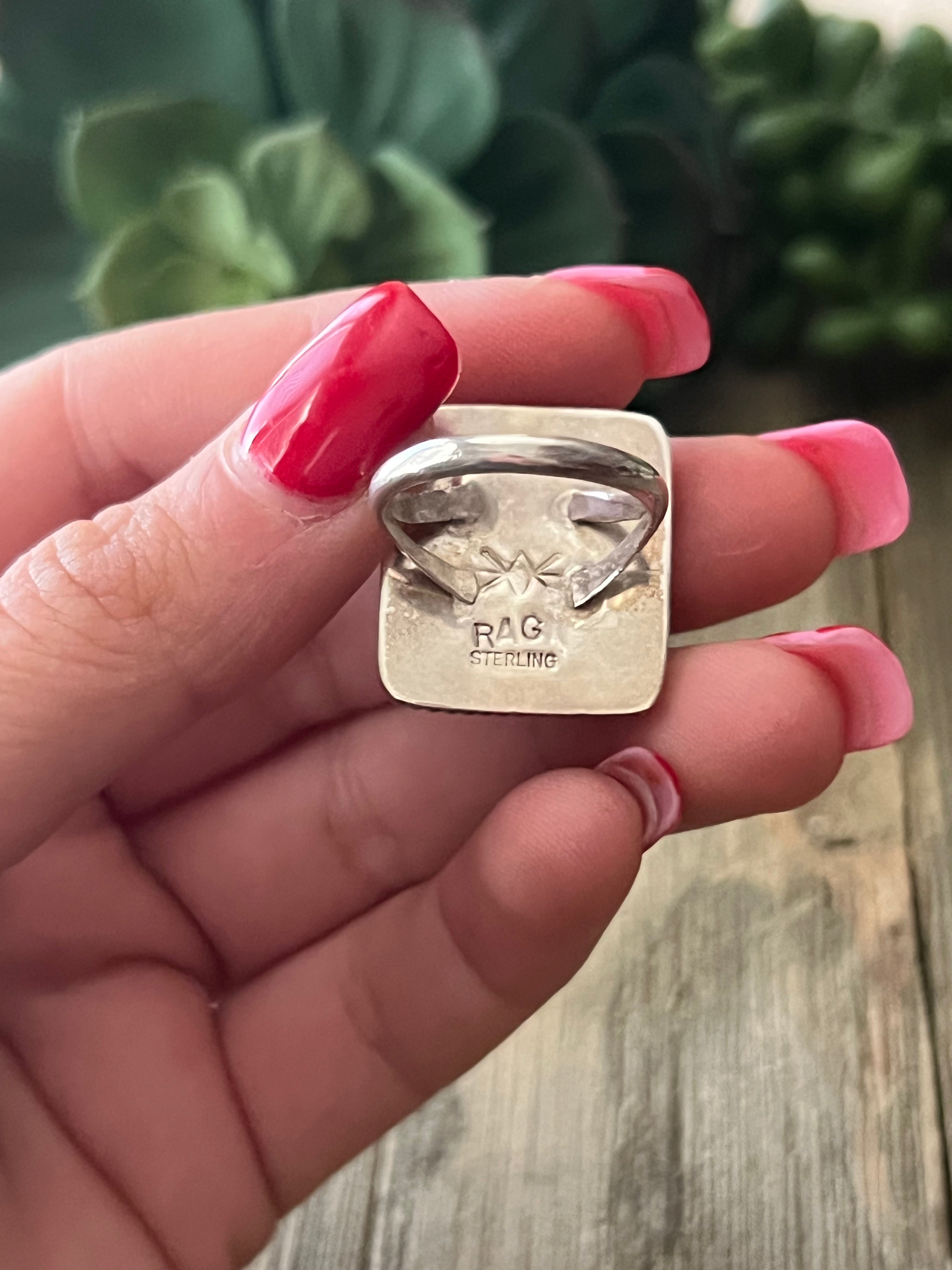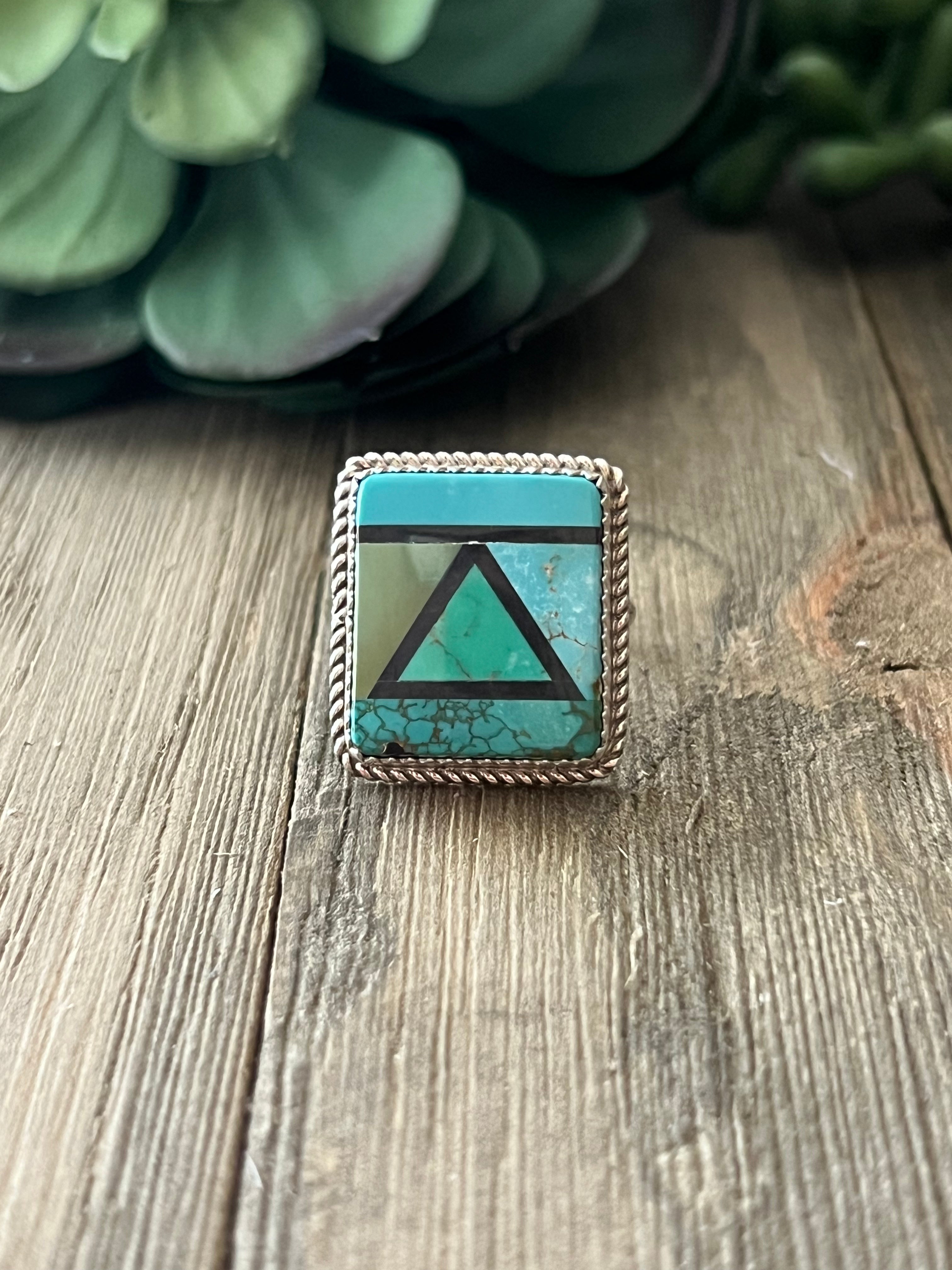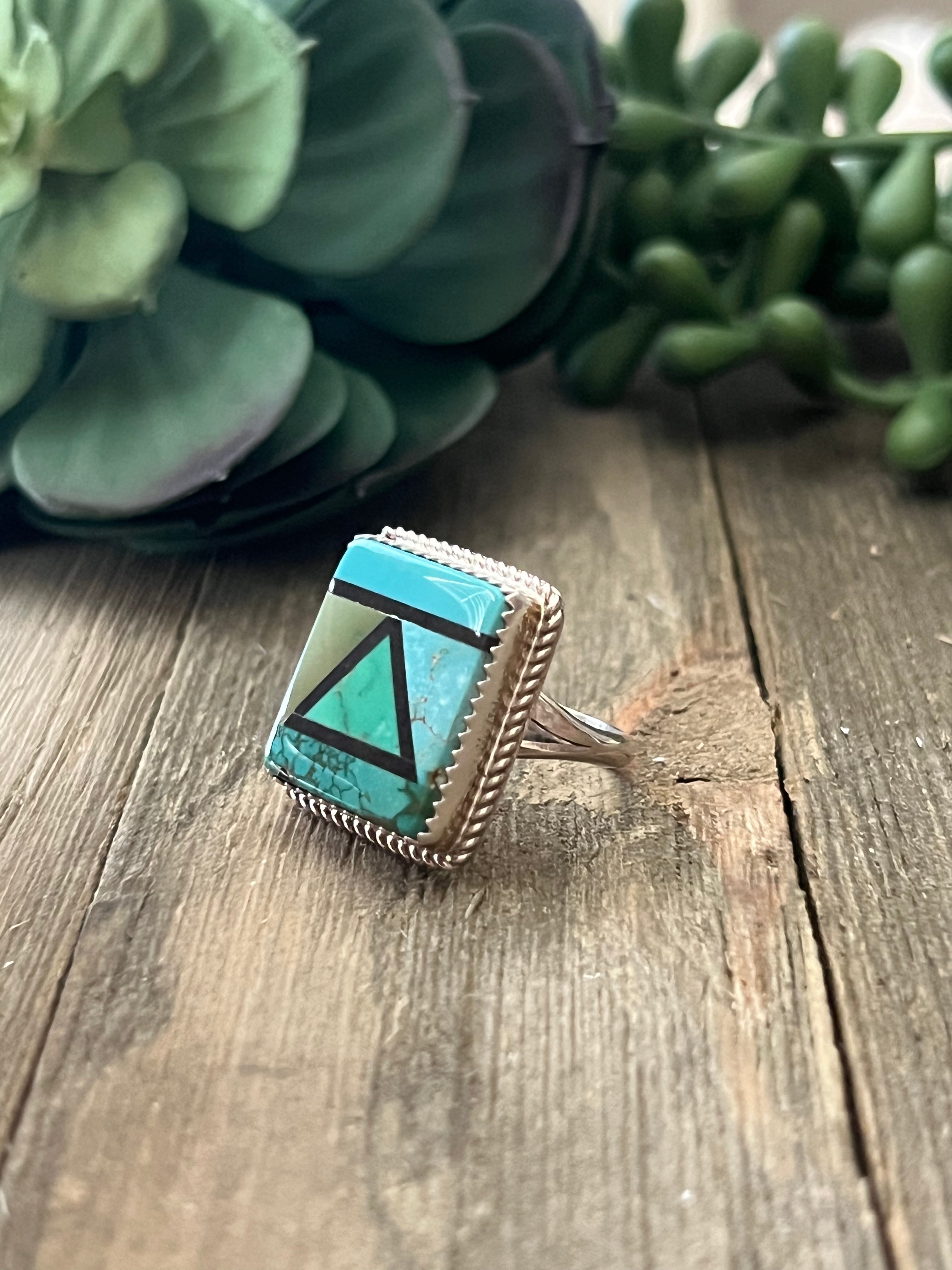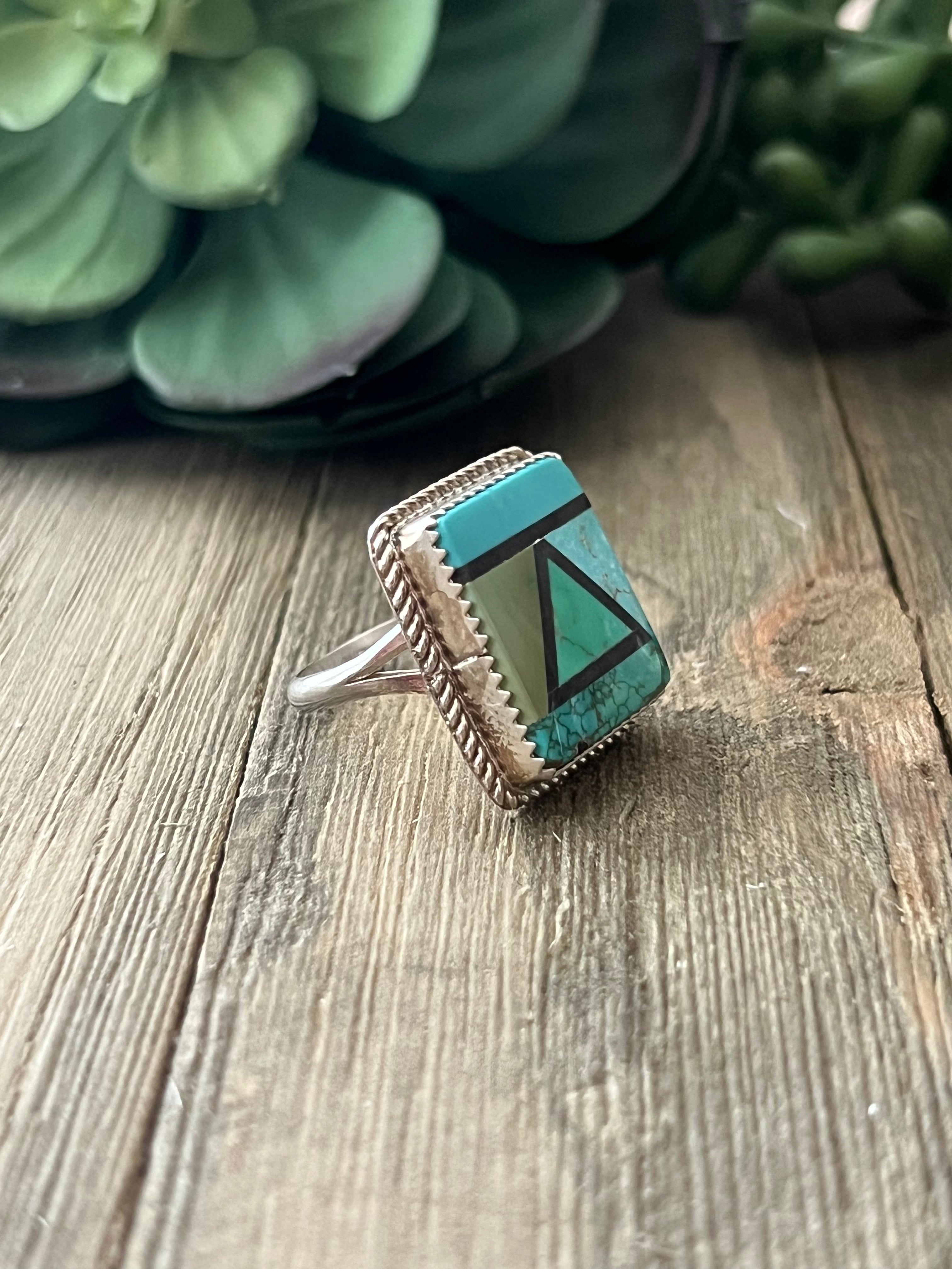 Reda Galvan Carico Lake Turquoise & Sterling Silver Inlay Ring Size 6.75. It measures 7/8 of an inch long and just over 3/4 of an inch wide. Signed by artist and stamped sterling silver.