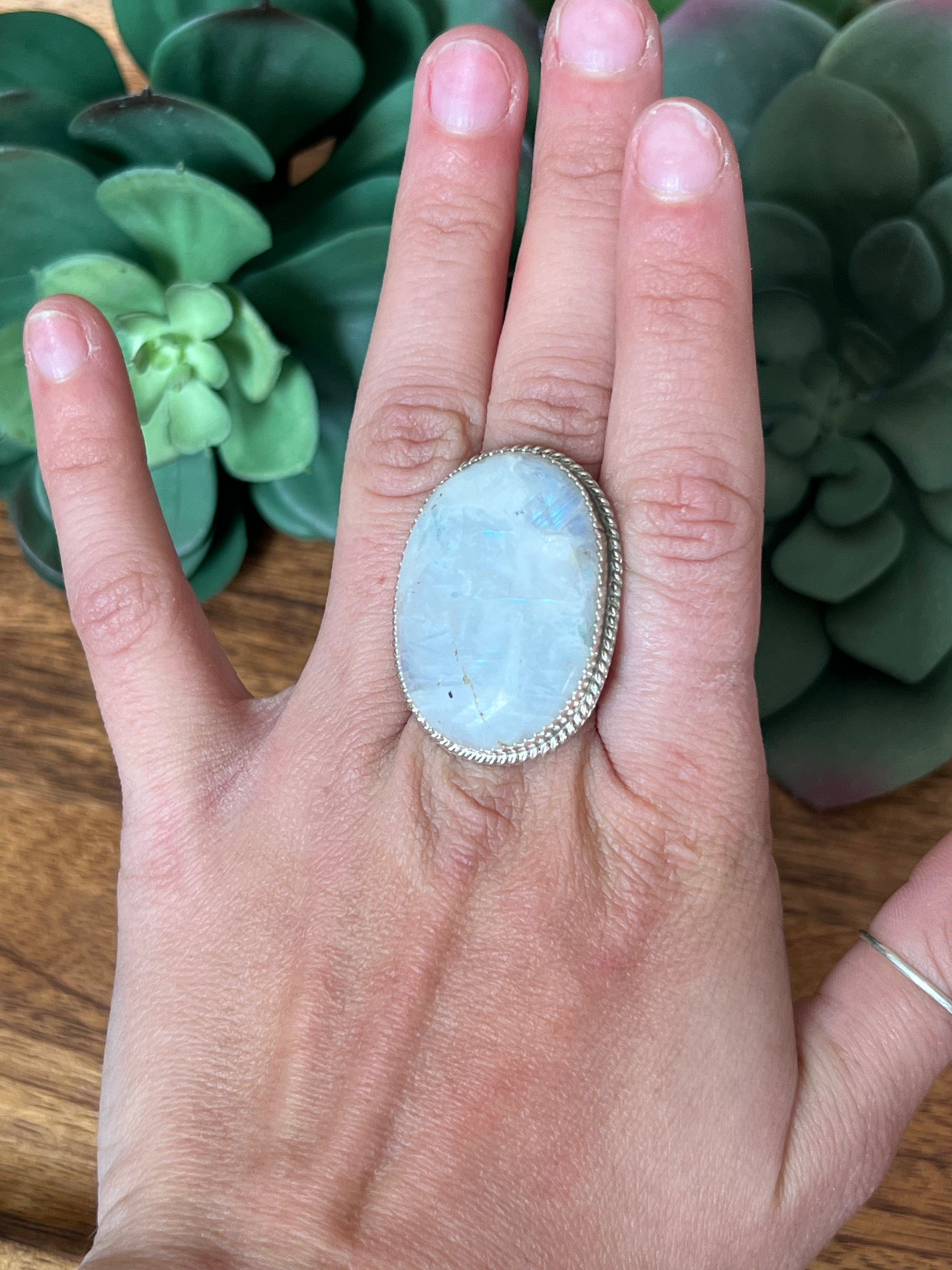 Reda Galvan Moon Stone & Sterling Silver Ring Size 8.25. It measures over 1 1/8 inches long and under 3/4 of an inch wide. Stamped sterling silver.
