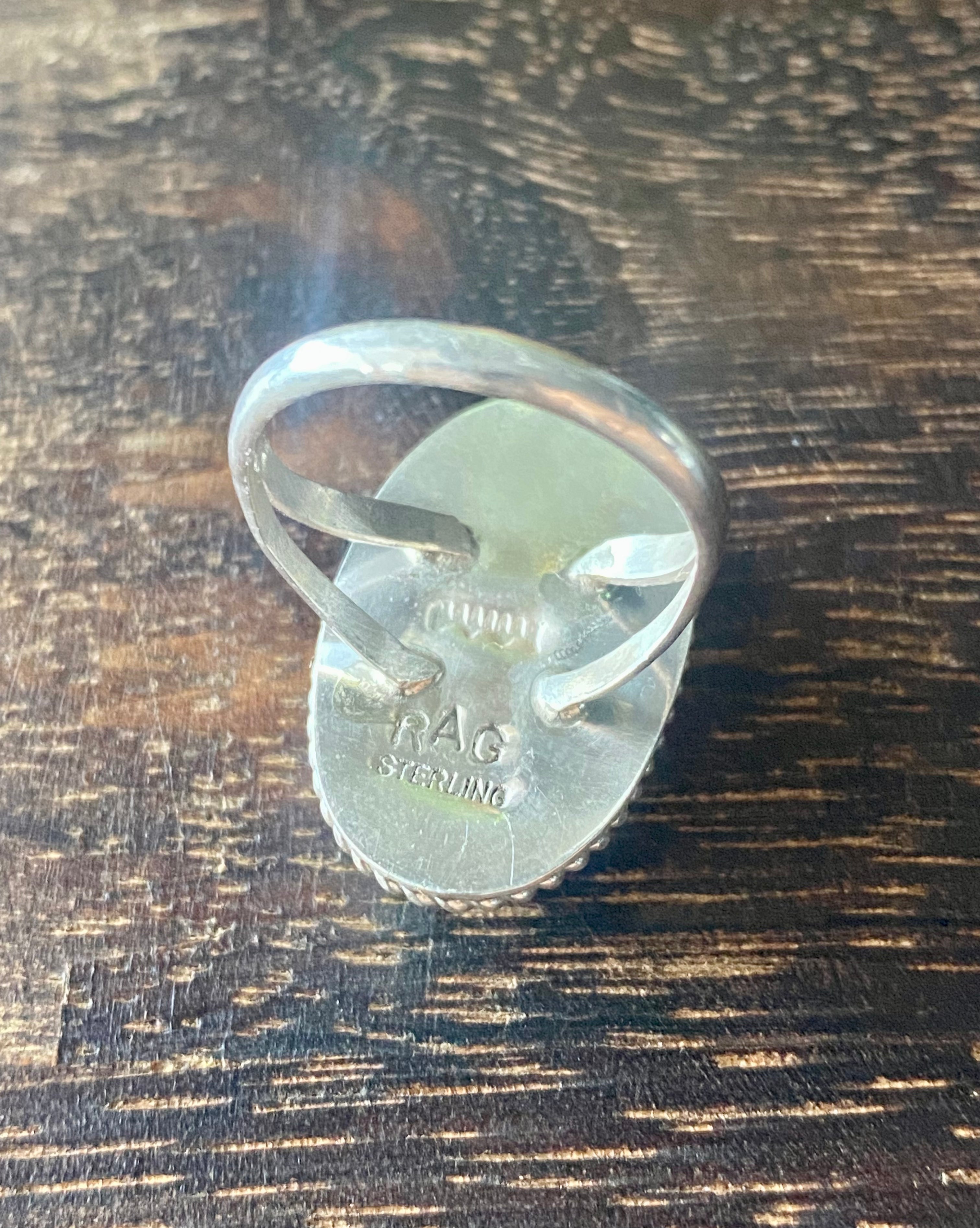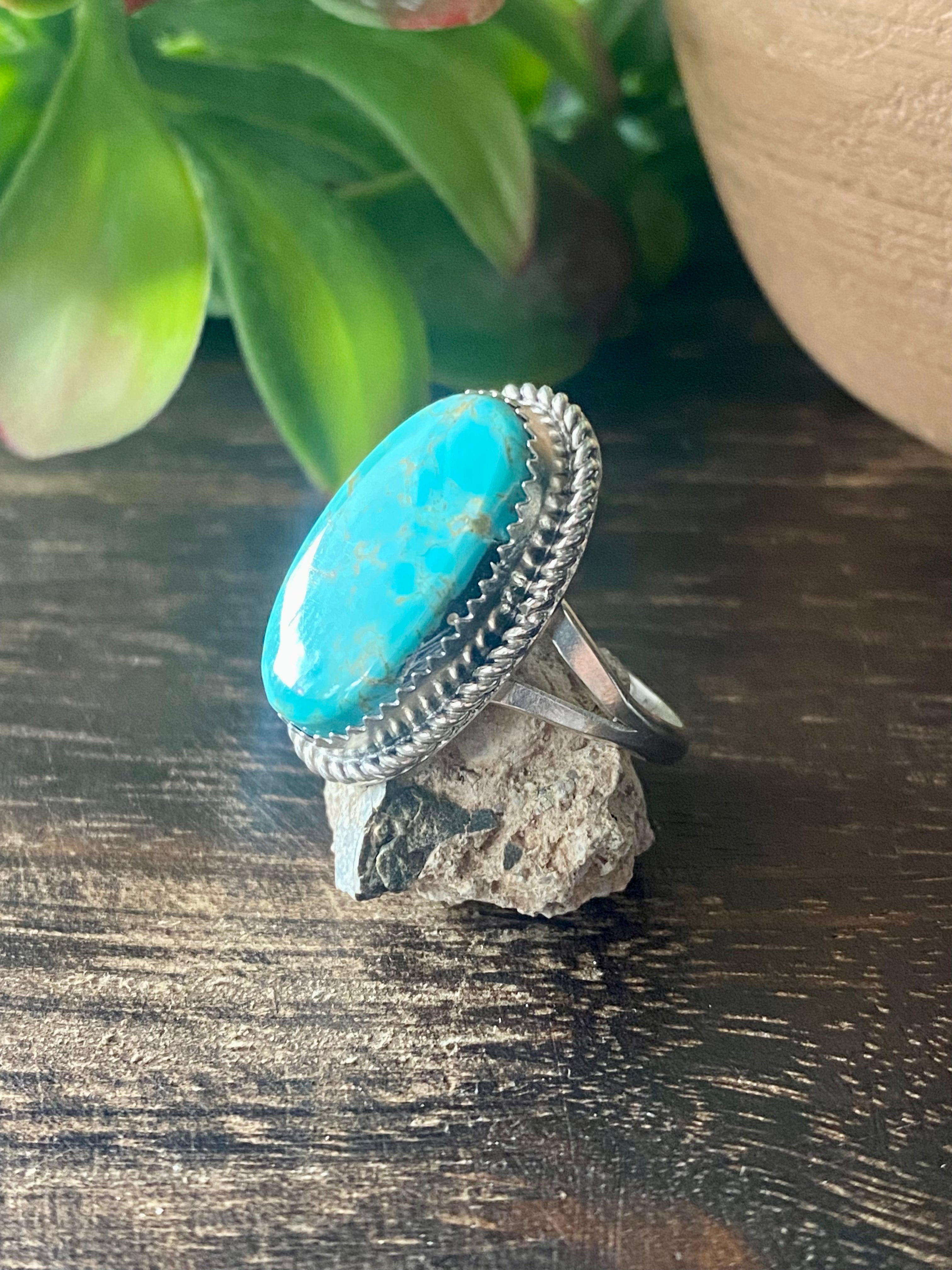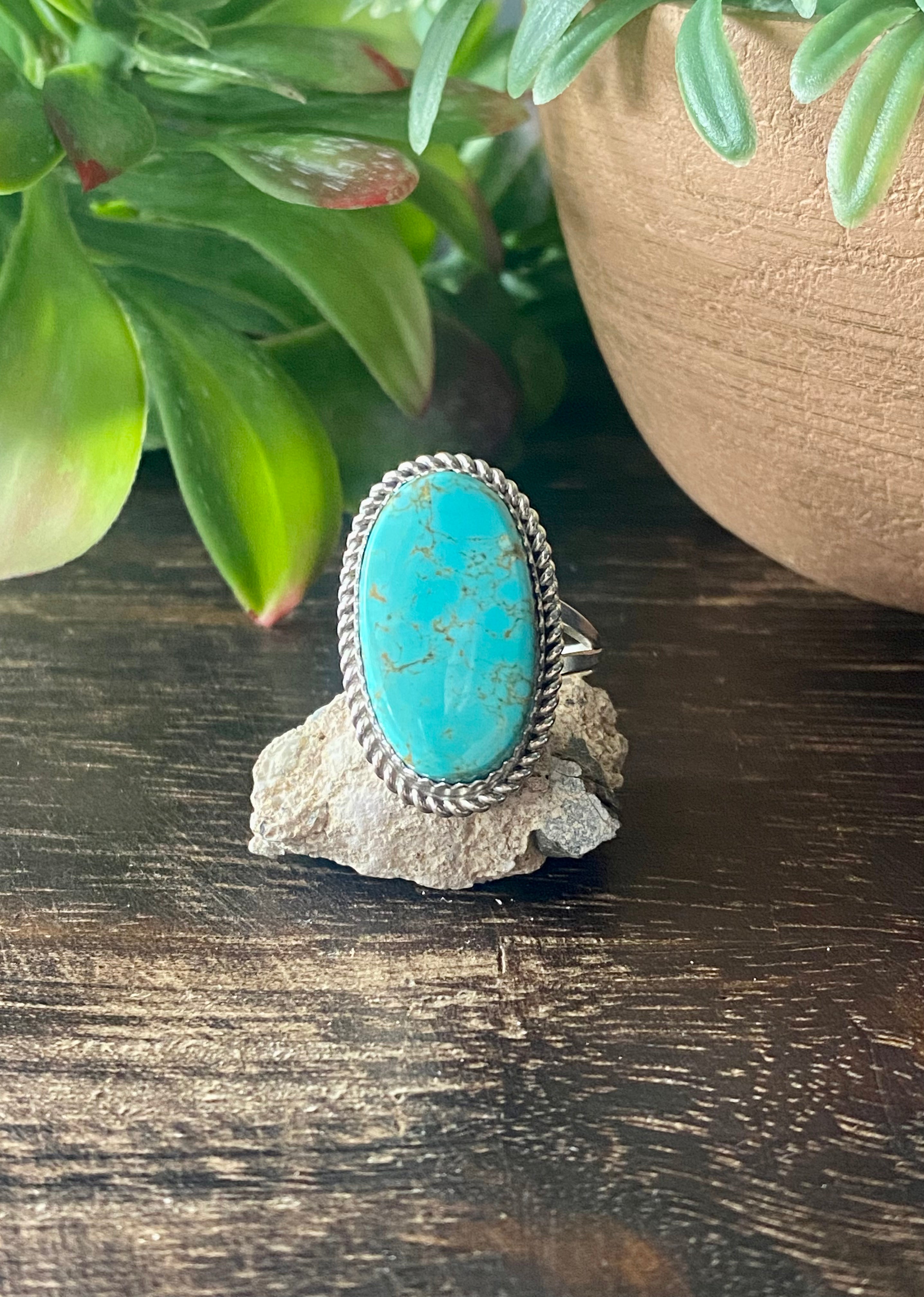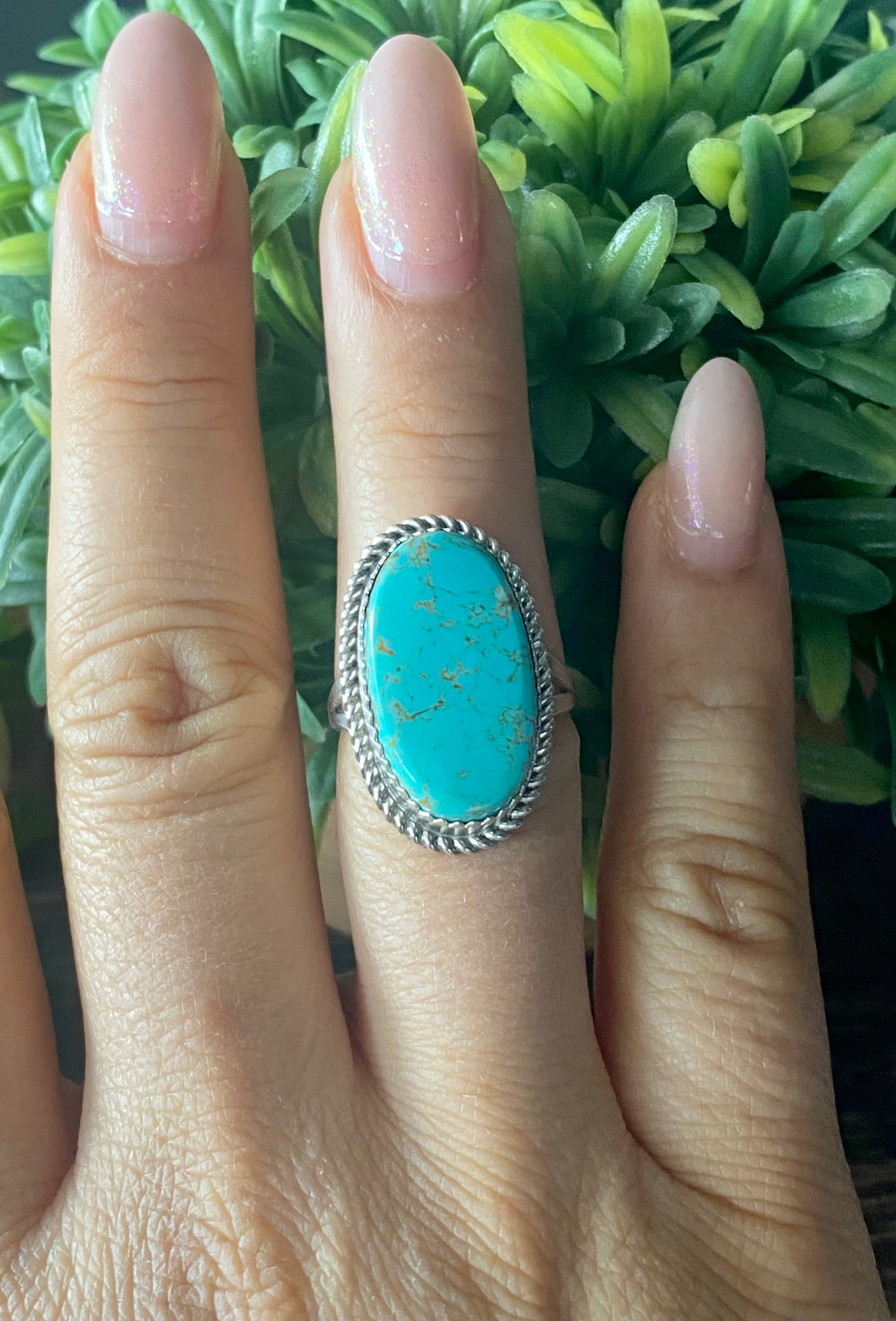 Reda Galvan Royston Turquoise & Sterling Silver Ring Size 7.75. It measures just over 1 inch long and 5/8 of an inch wide. Signed by the artist and stamped sterling silver.