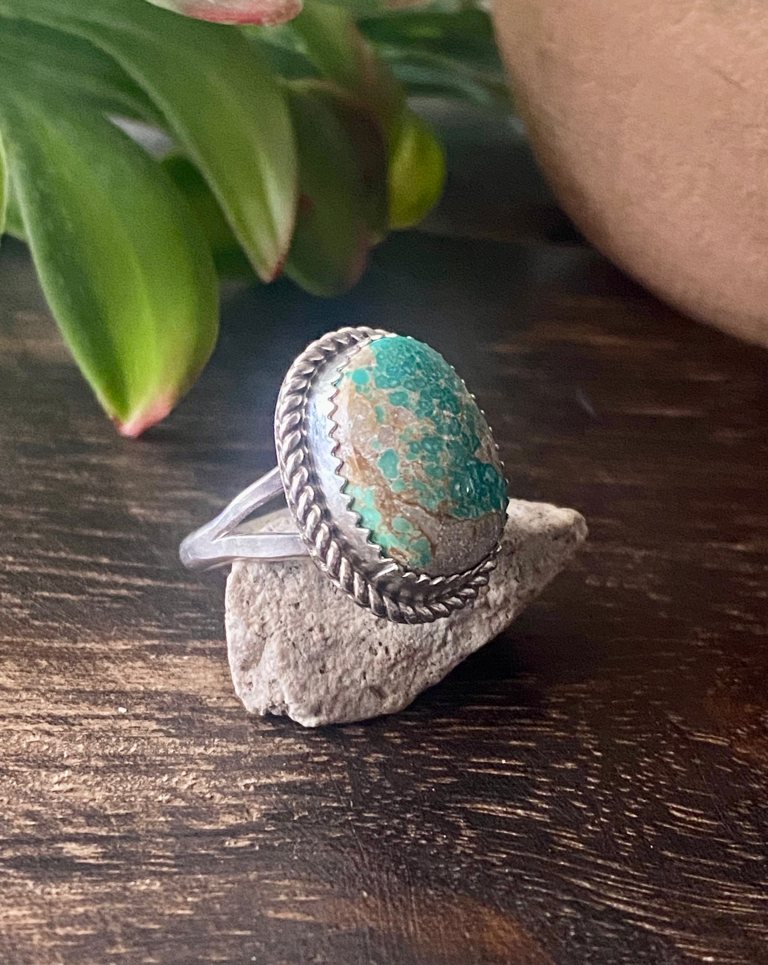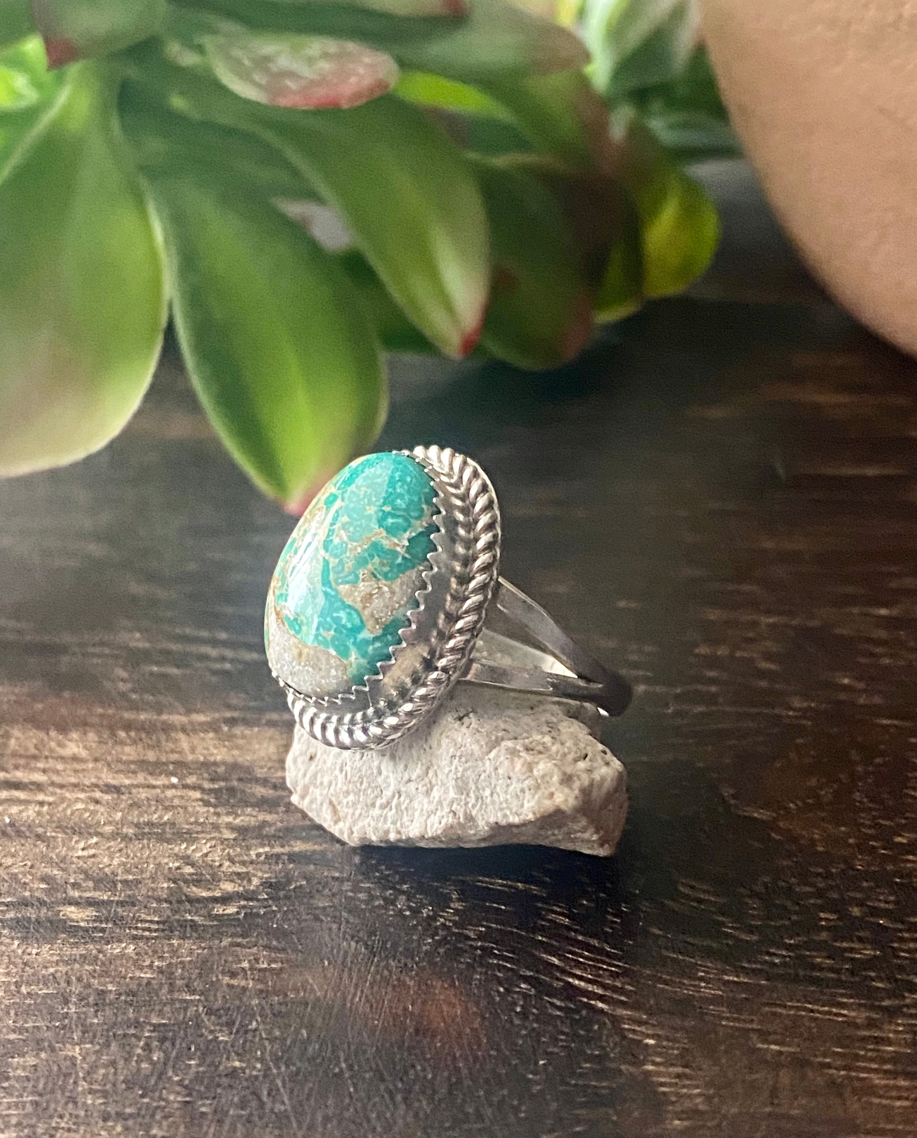 Reda Galvan Sonoran Mountain Turquoise & Sterling Silver Ring Size 8. It measures just over 3/4 of an inch long and just over 5/8 of an inch wide. Signed by the artist and stamped sterling silver.