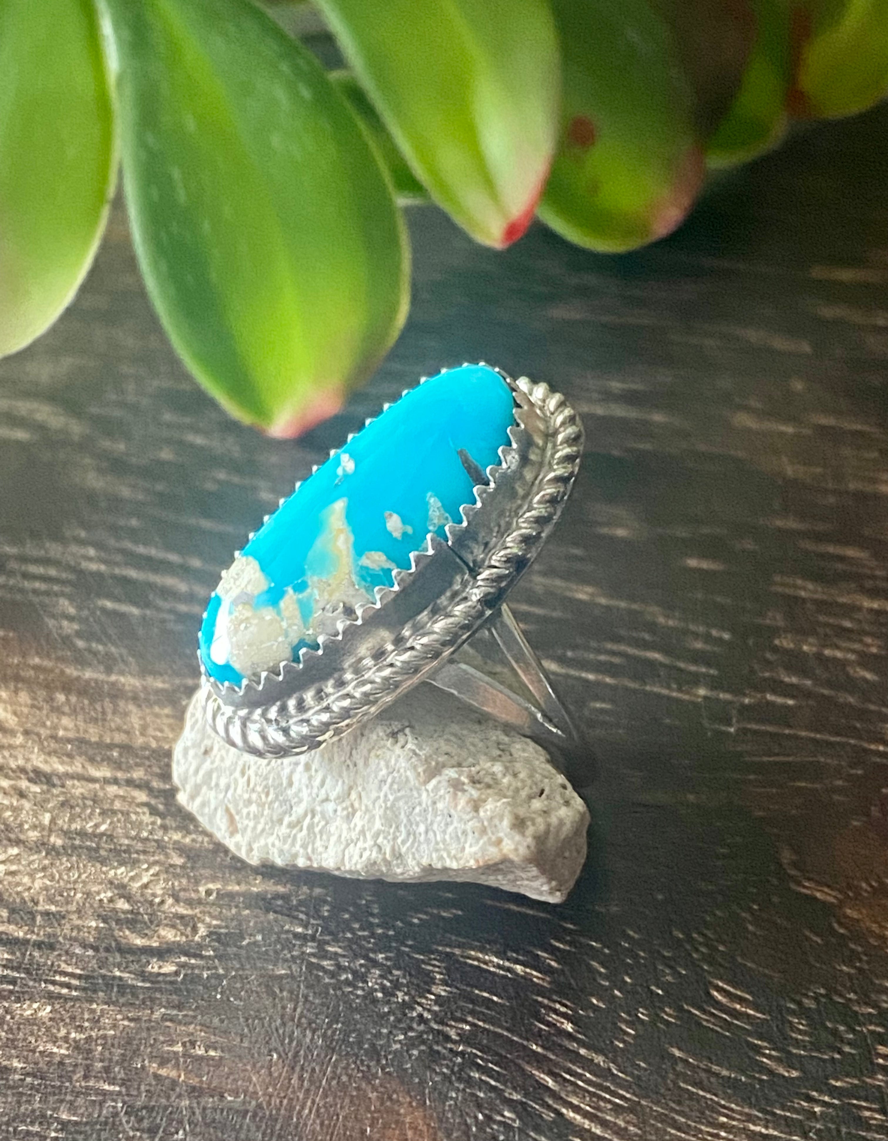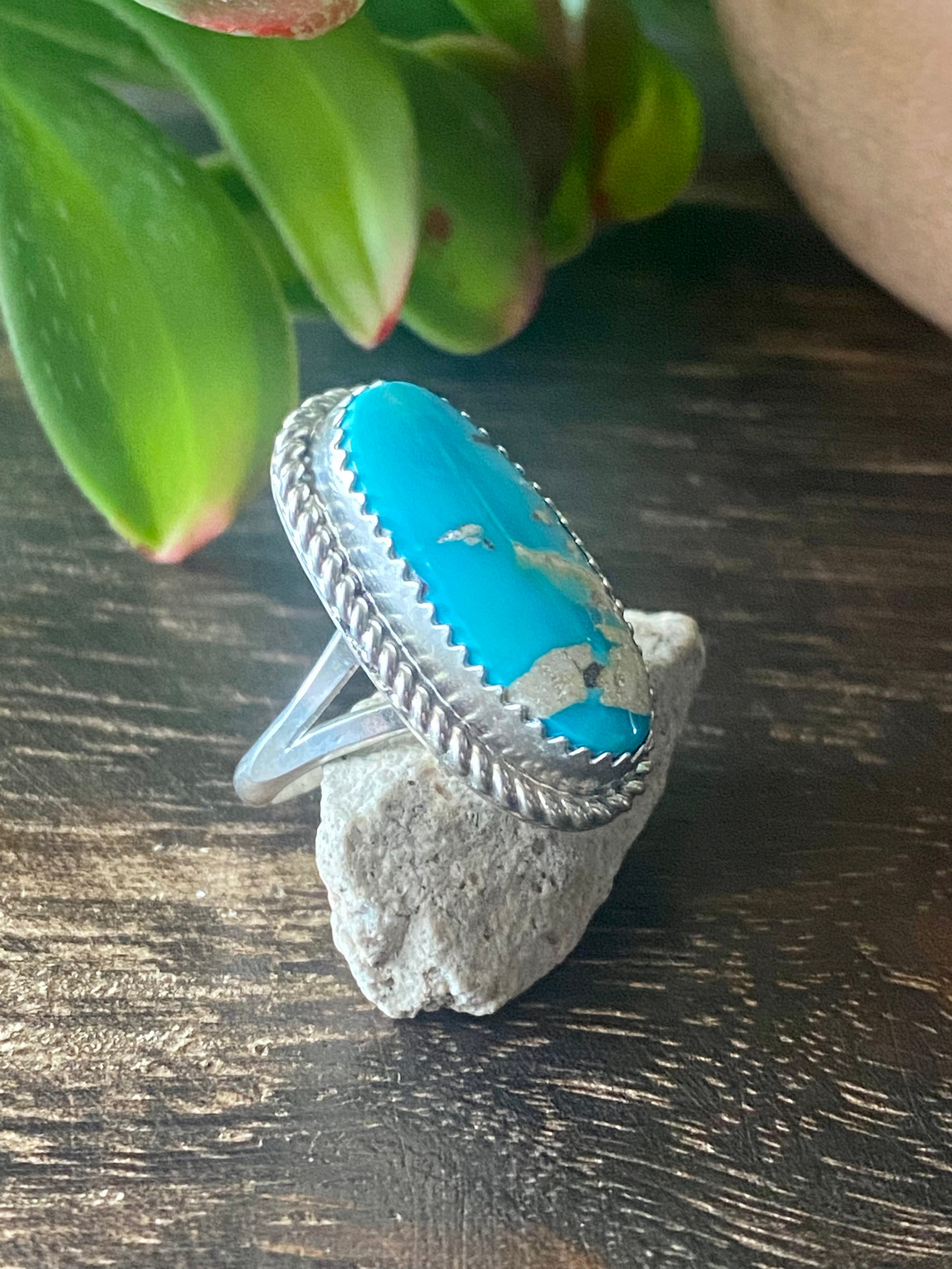 Reda Galvan South Hill Turquoise & Sterling Silver Ring Size 5.5. It measures just over 1 inch long and just over 1/2 of an inch wide. Signed by the artist and stamped sterling silver.