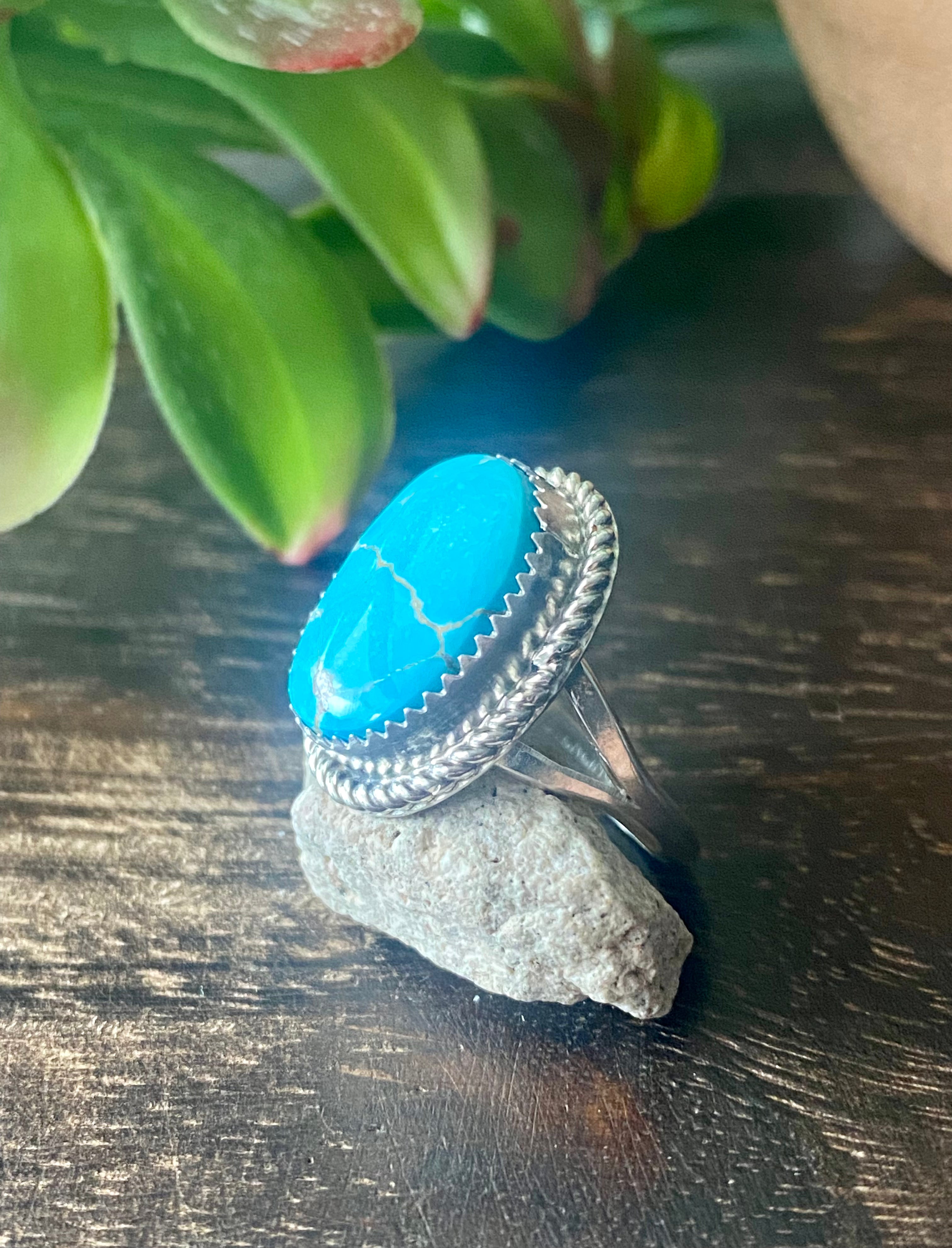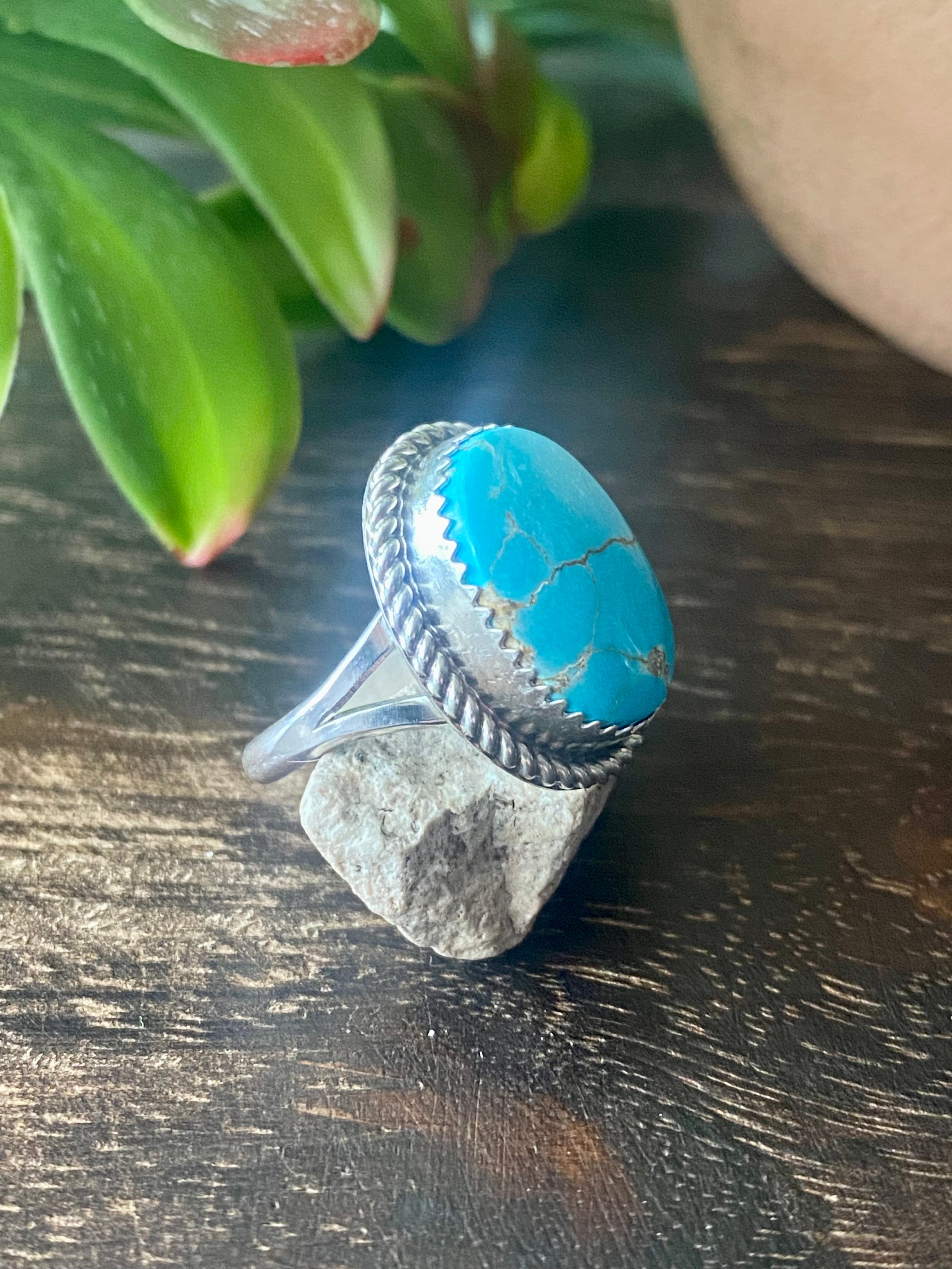Reda Galvan South Hill Turquoise & Sterling Silver Ring Size 7.75. It measures just under 7/8 of an inch long and just over 5/8 of an inch wide. Signed by the artist and stamped sterling silver.